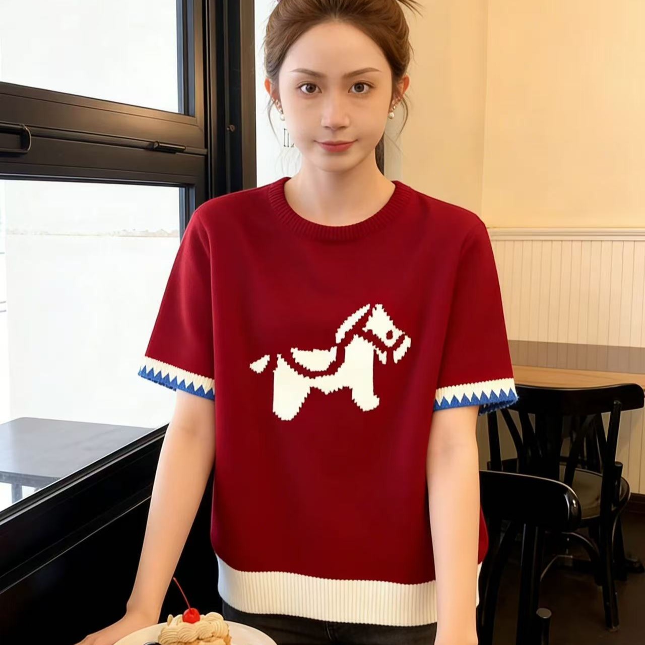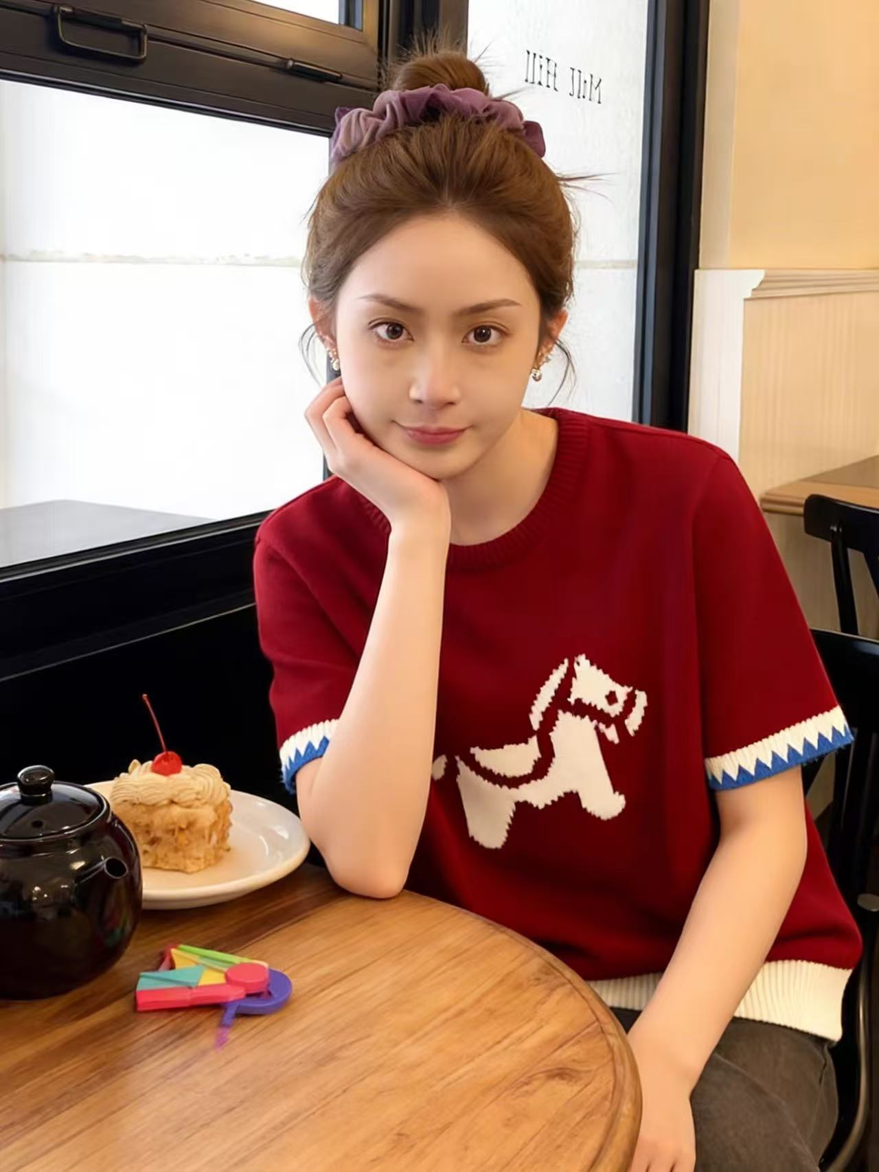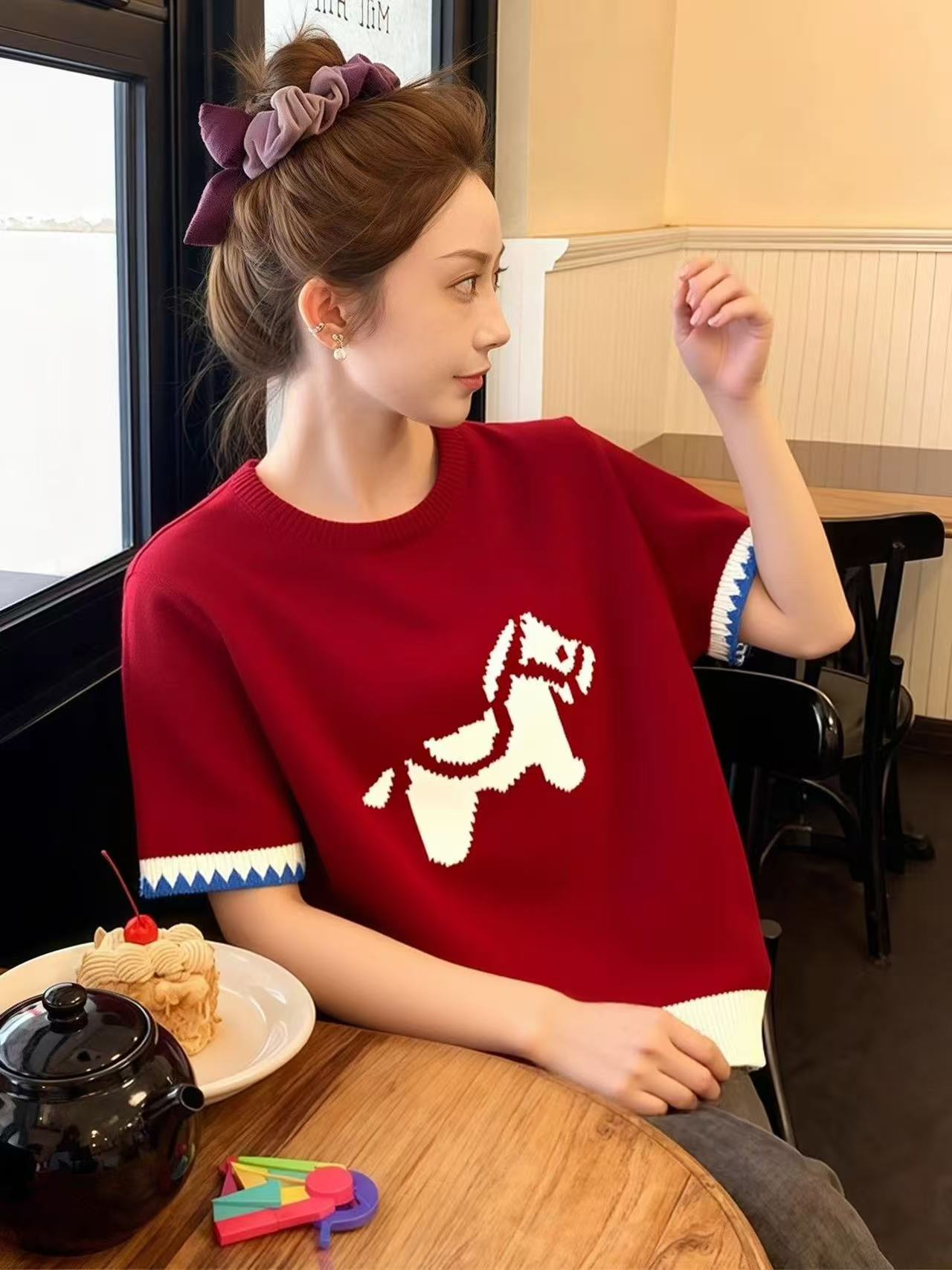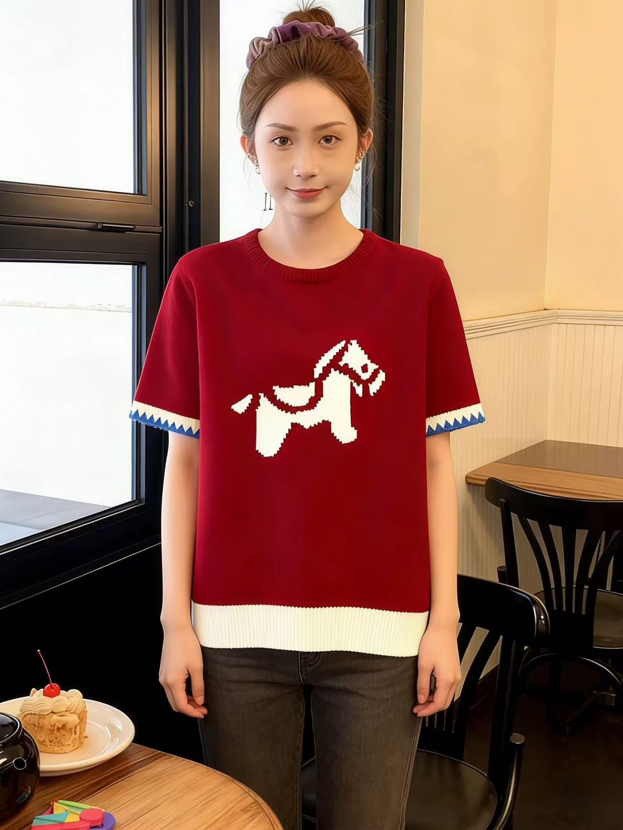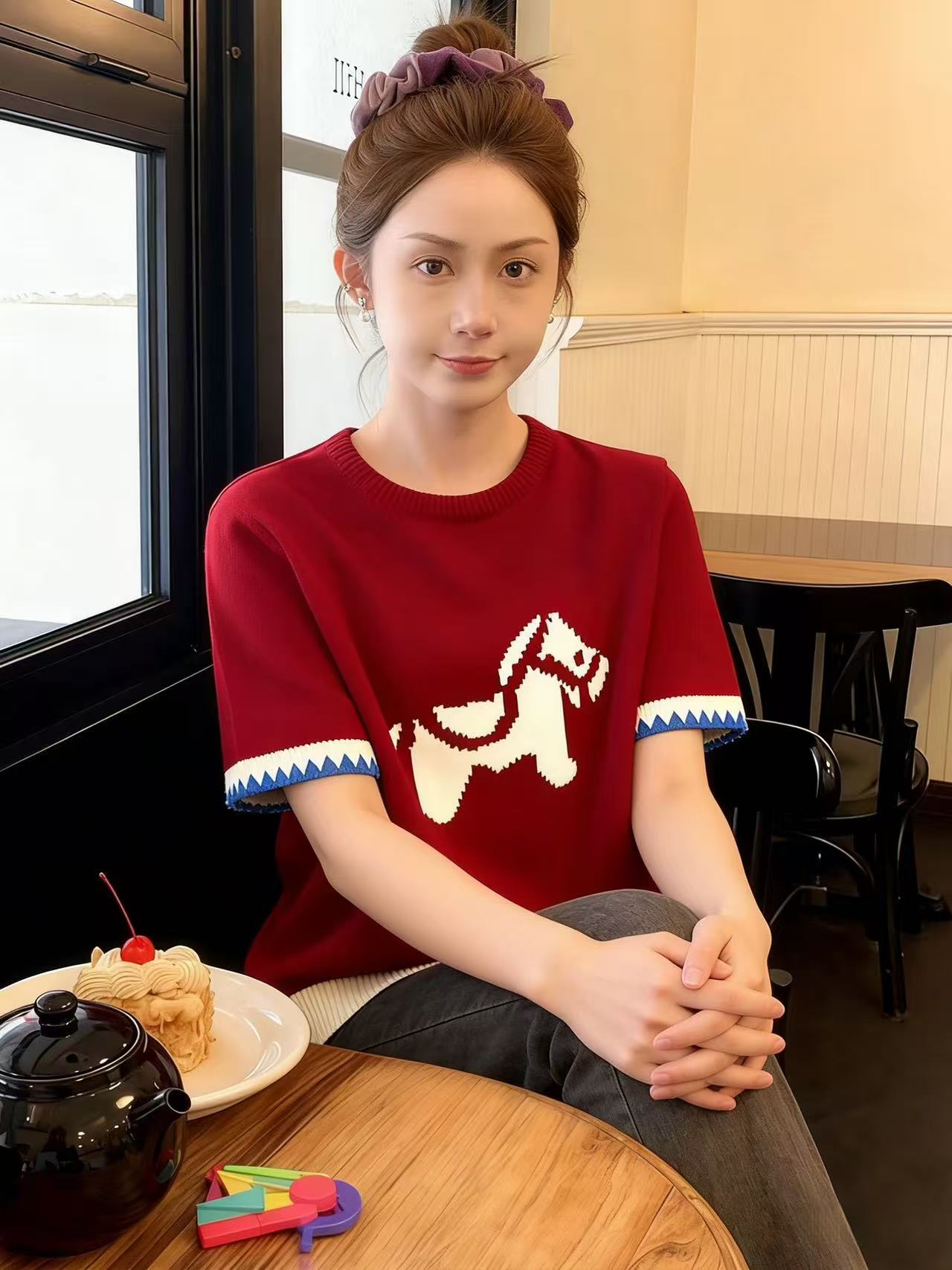 FA55680# 红色套头提花短袖针织衫毛衣女秋冬季绝美巨好看的马年本命年上衣 服裝批發女裝批發服飾貨源