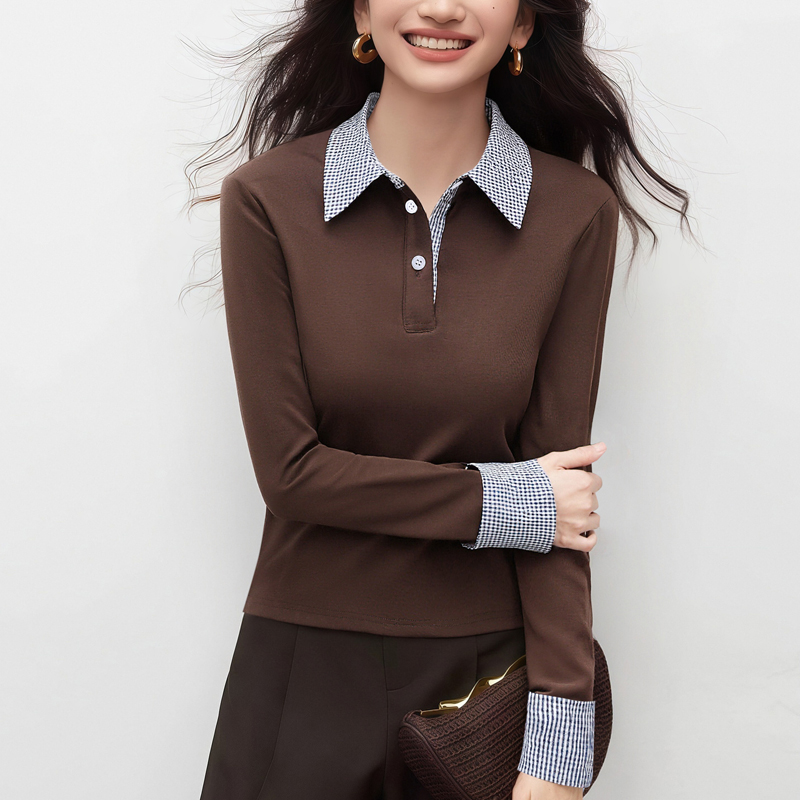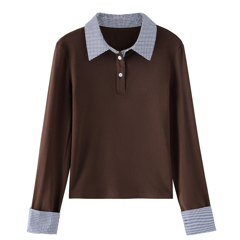 FA55687# 假两件翻领拼色针织女长袖春磨毛百搭打底衫显瘦上衣 服裝批發女裝批發服飾貨源