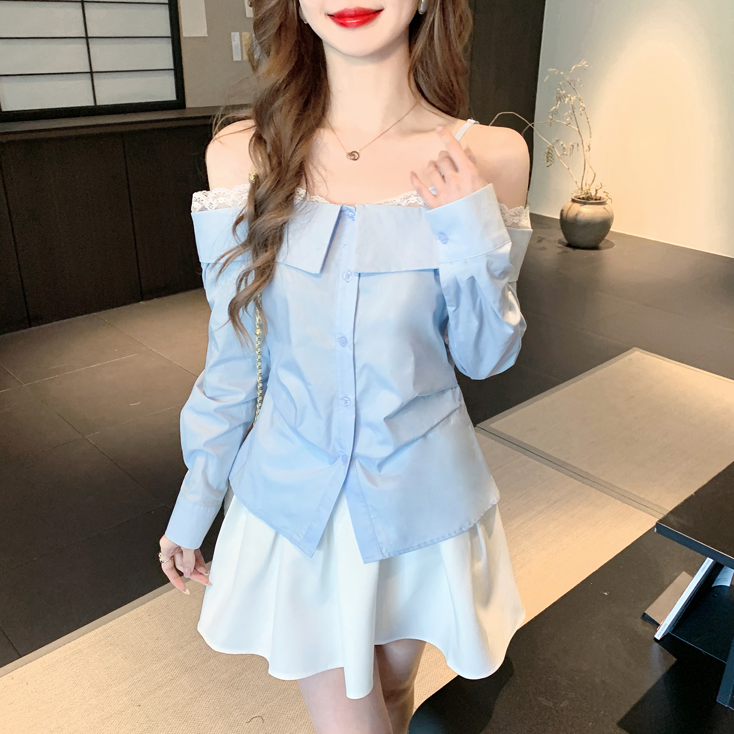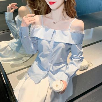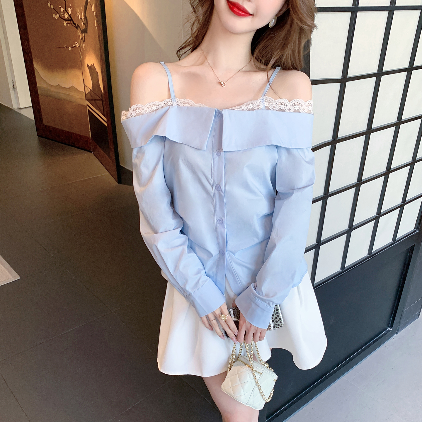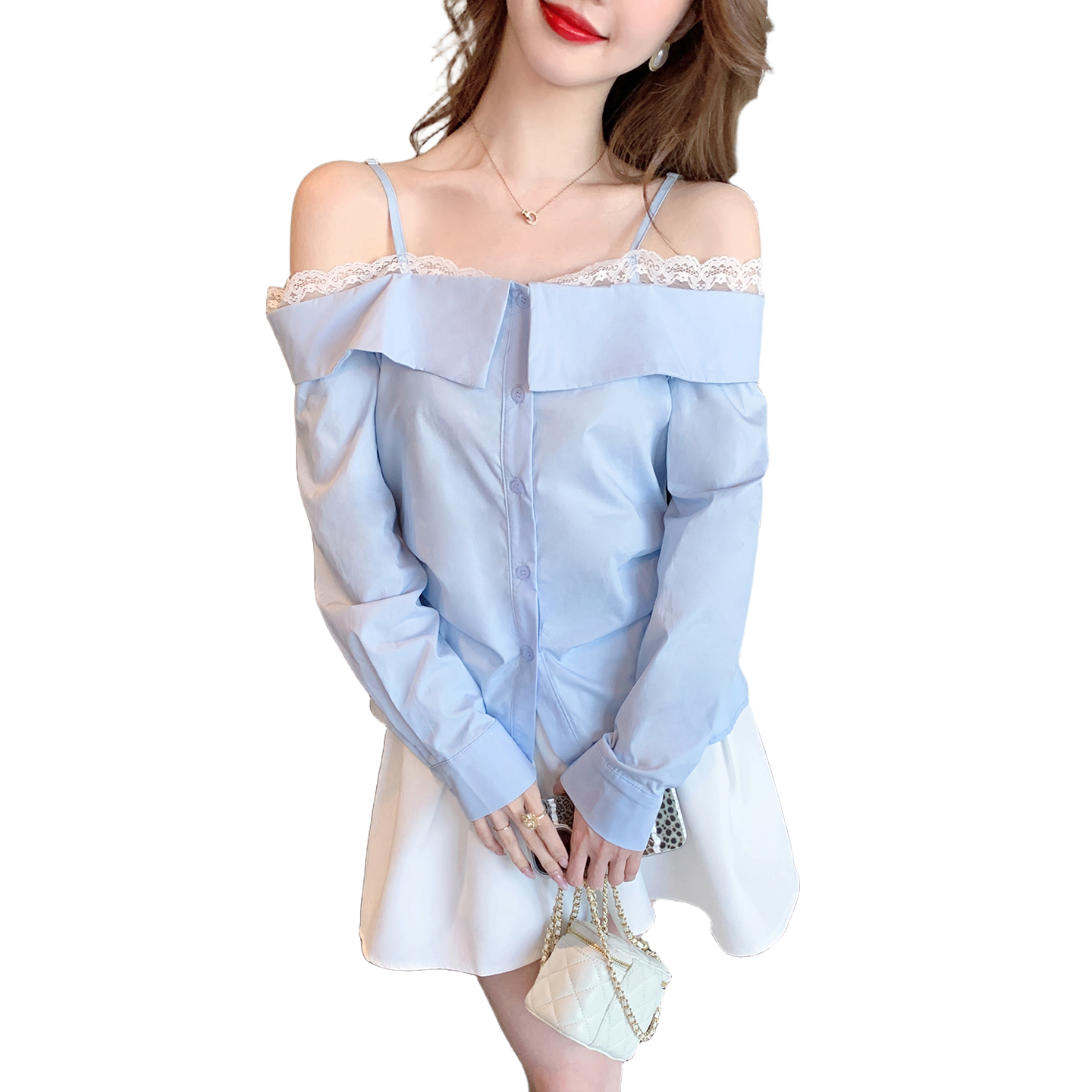 Home > 长袖雪纺衫、衬衫、上衣 > FA55703# 春季蕾丝花边一字领吊带衬衫女温柔气质法式修身长袖上衣 服裝批發女裝批發服飾貨源