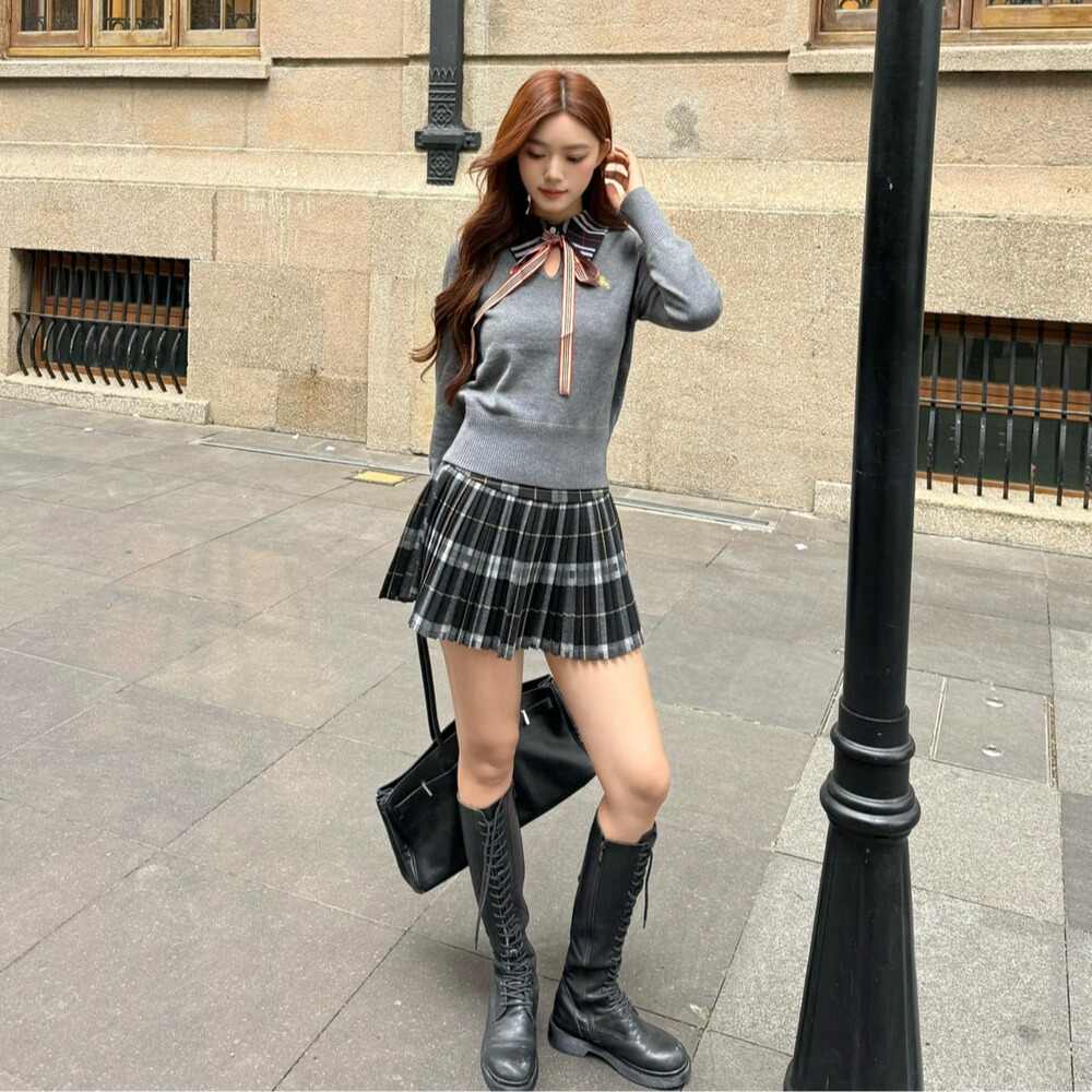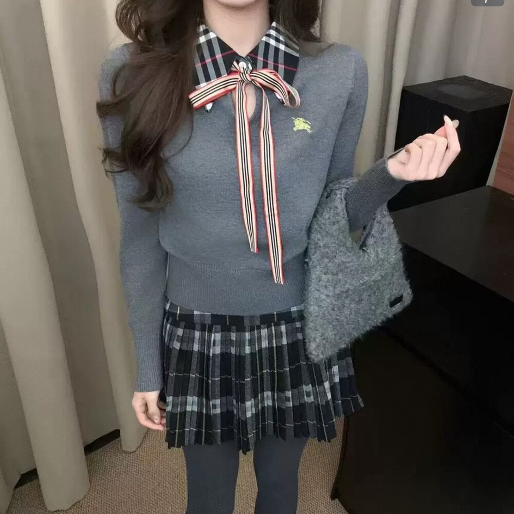 FA55714# 学院风撞色假两件针织套装女撞色格纹上衣百褶短裙两件套 服裝批發女裝批發服飾貨源