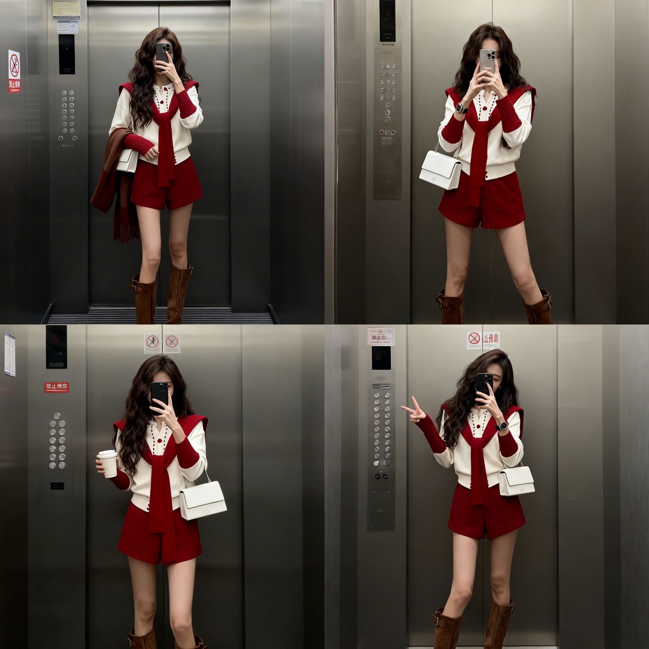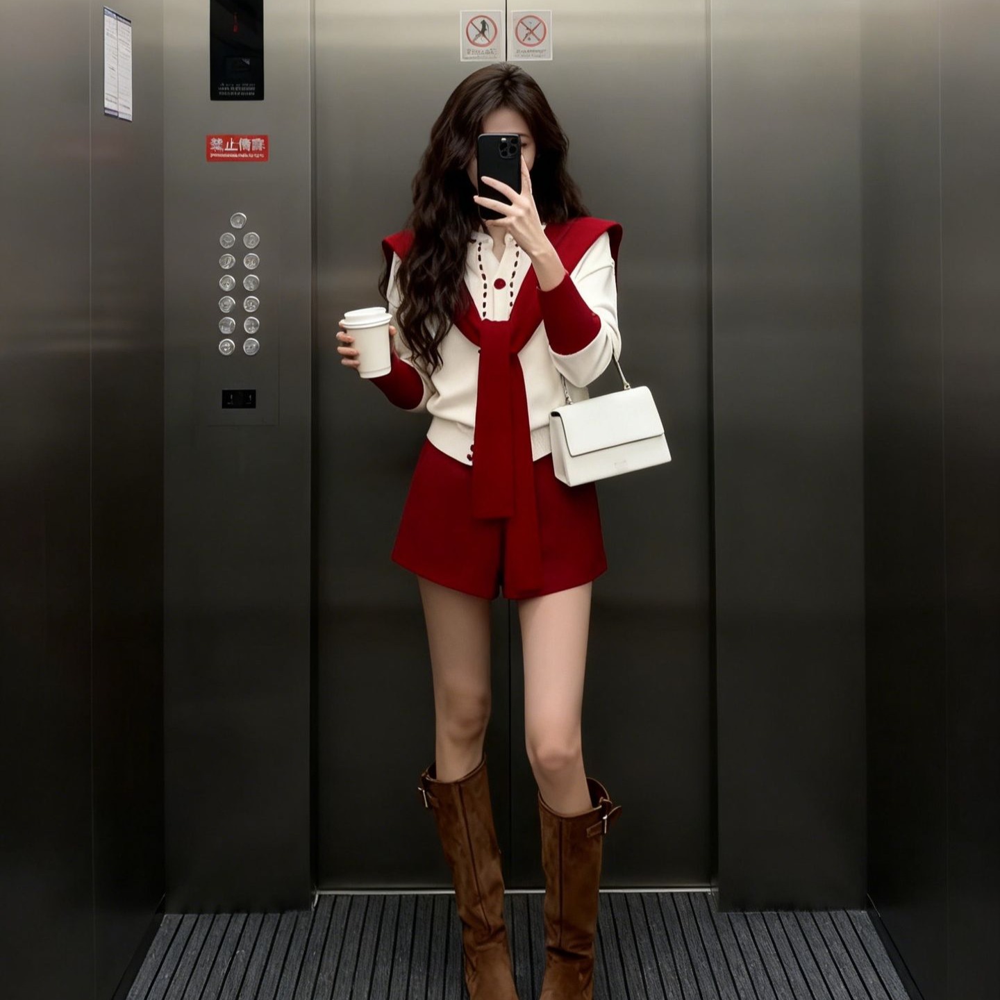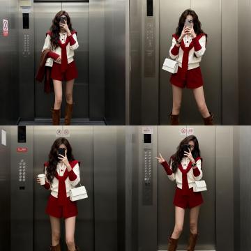 FA55716# 立体花朵针织毛衣外套红色披肩上衣甜美直筒短裤气质套装 服裝批發女裝批發服飾貨源