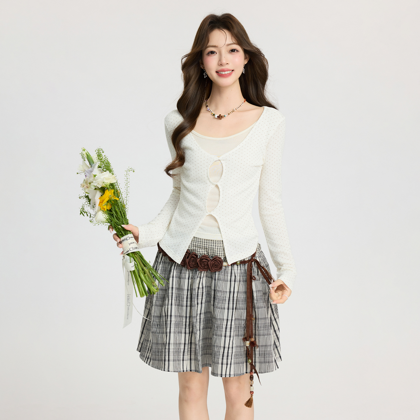 FA55745# 低圆领波点扭结长袖T恤女打底衫内搭春季修身假两件上衣 服裝批發女裝批發服飾貨源