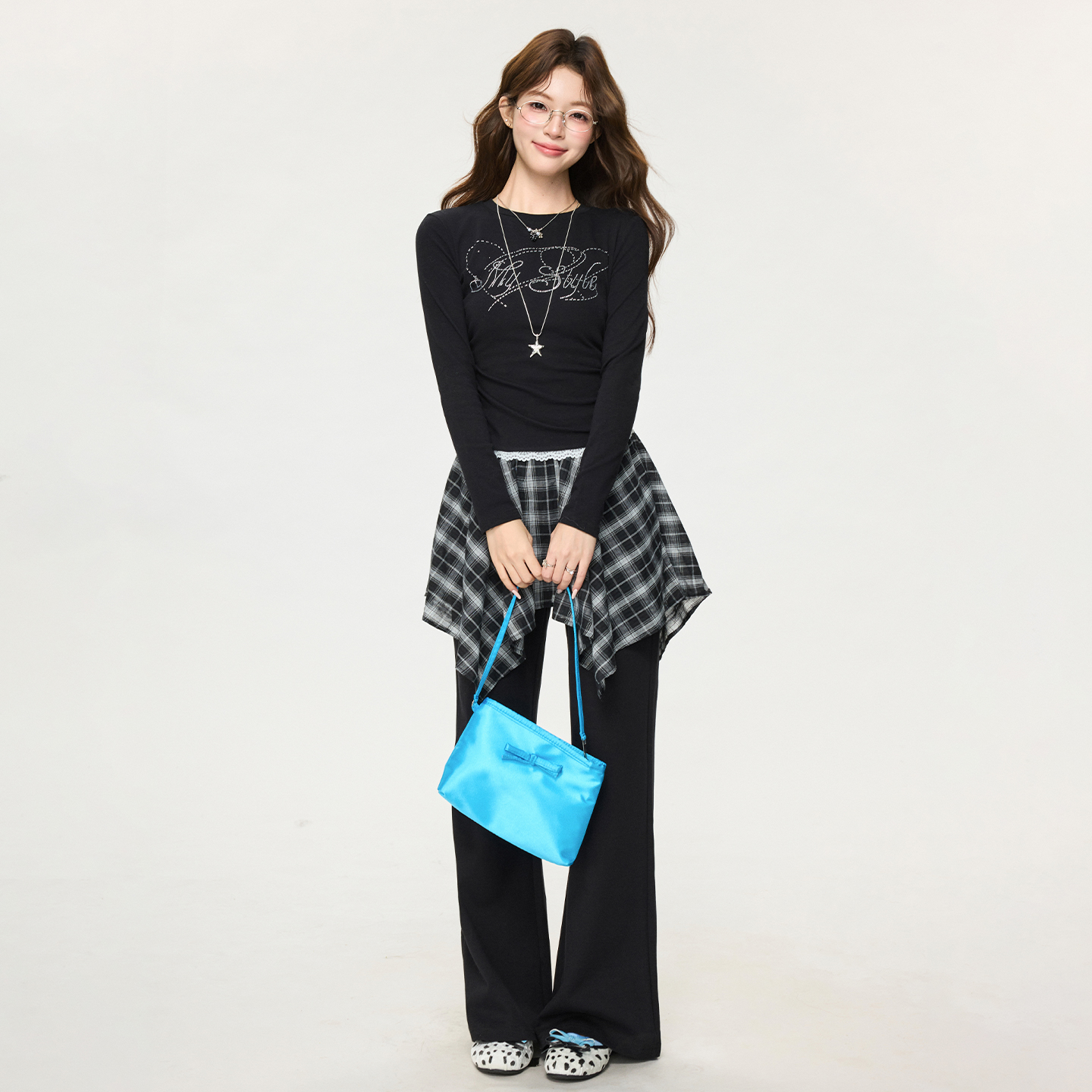 FA55751# 韩系蕾丝花边下摆长袖打底衫女烫钻假两件T恤春内搭上衣 服裝批發女裝批發服飾貨源