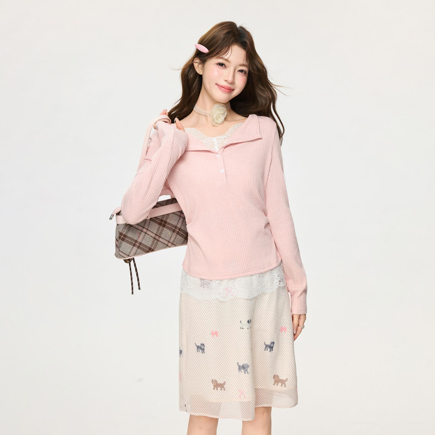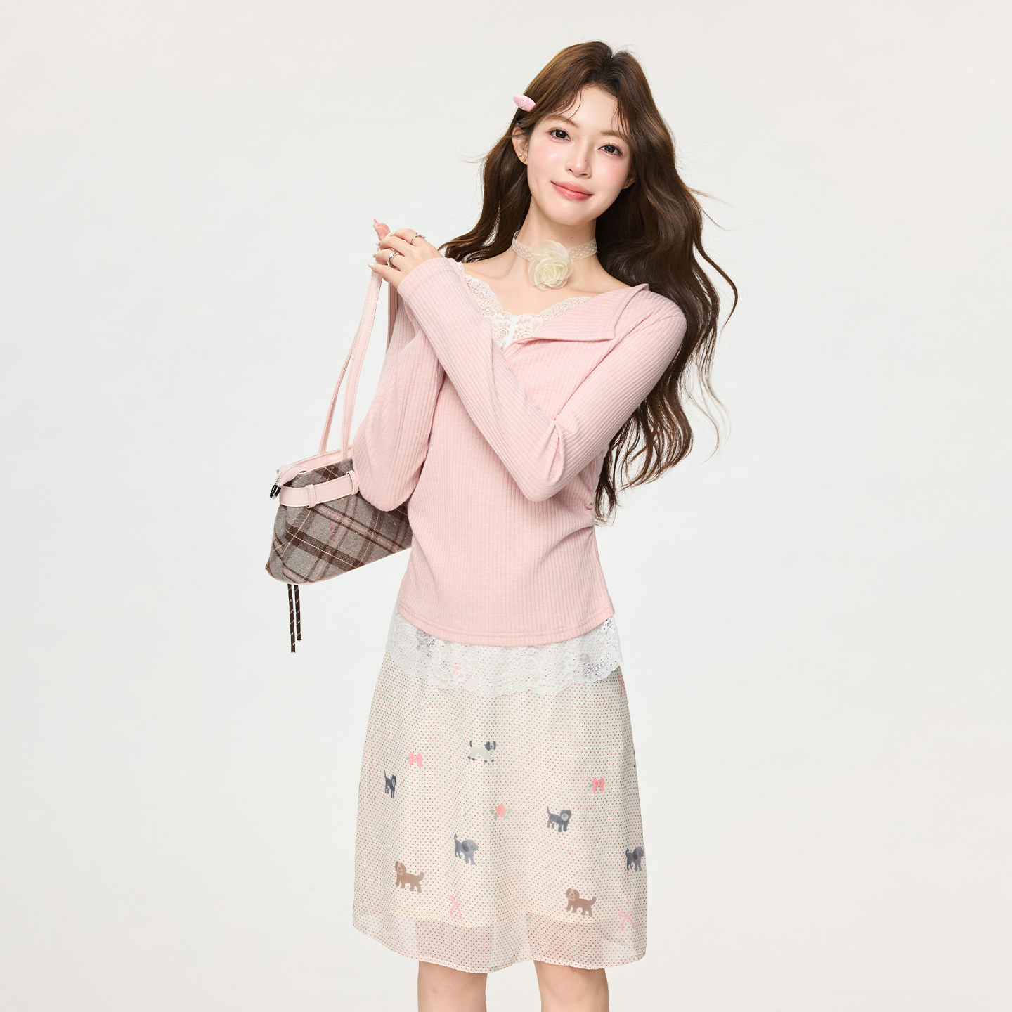 FA55754# 粉色蕾丝假两件设计感内搭T恤女春季褶皱收腰打底衫上衣 服裝批發女裝批發服飾貨源