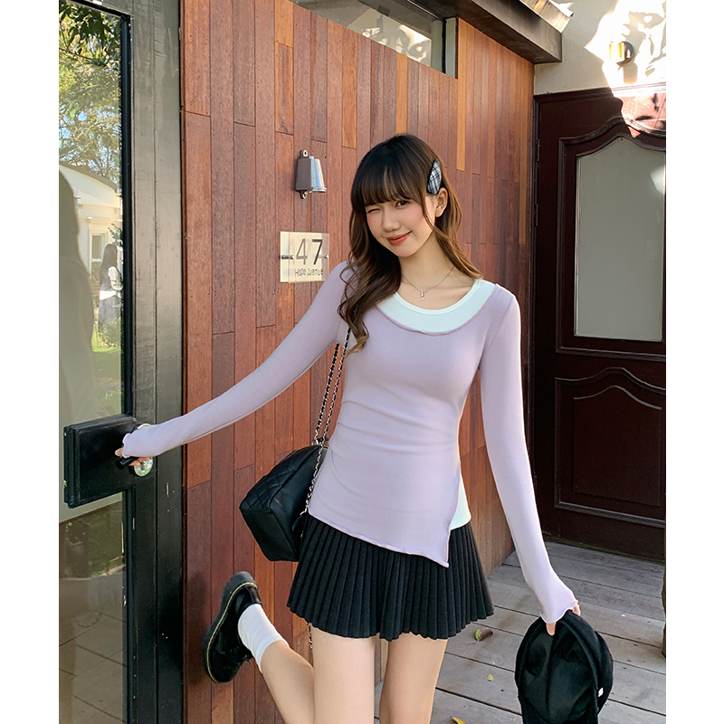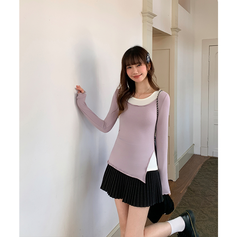 FA55768# 圆领不规则撞色假两件内搭底内里磨毛冬季收腰开叉掐腰 服裝批發女裝批發服飾貨源