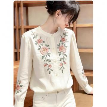FA55837# 法式复古风白色刺绣长袖衬衫女早春季新款高级感气质显瘦上衣 服裝批發女裝批發服飾貨源