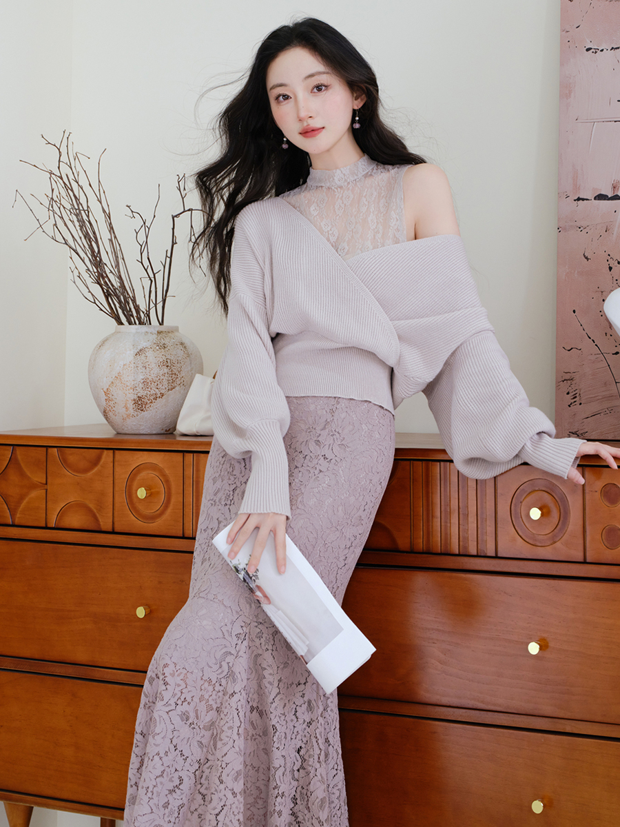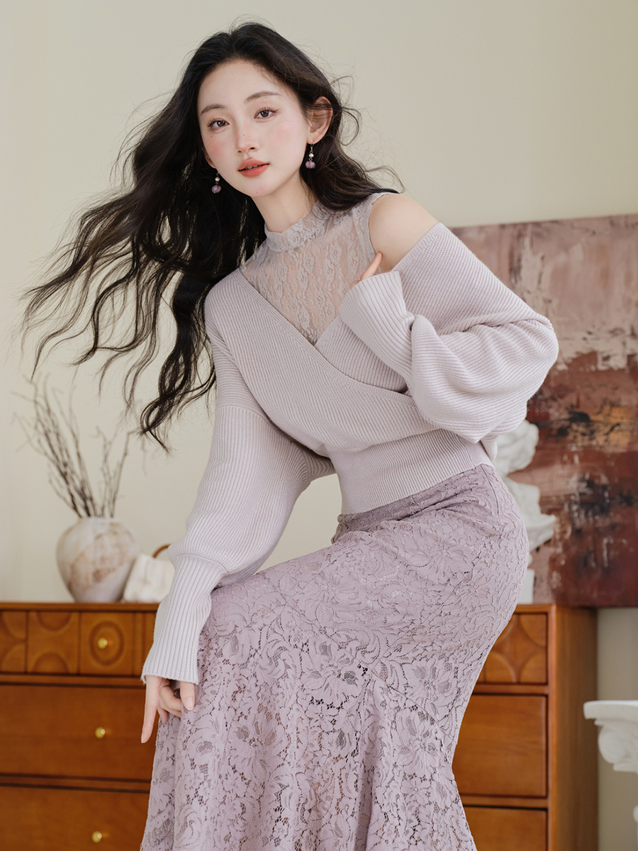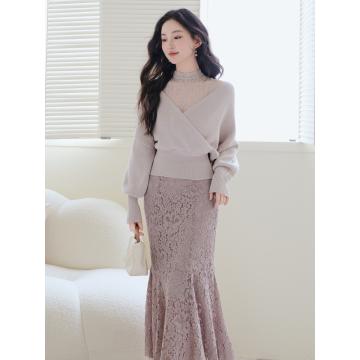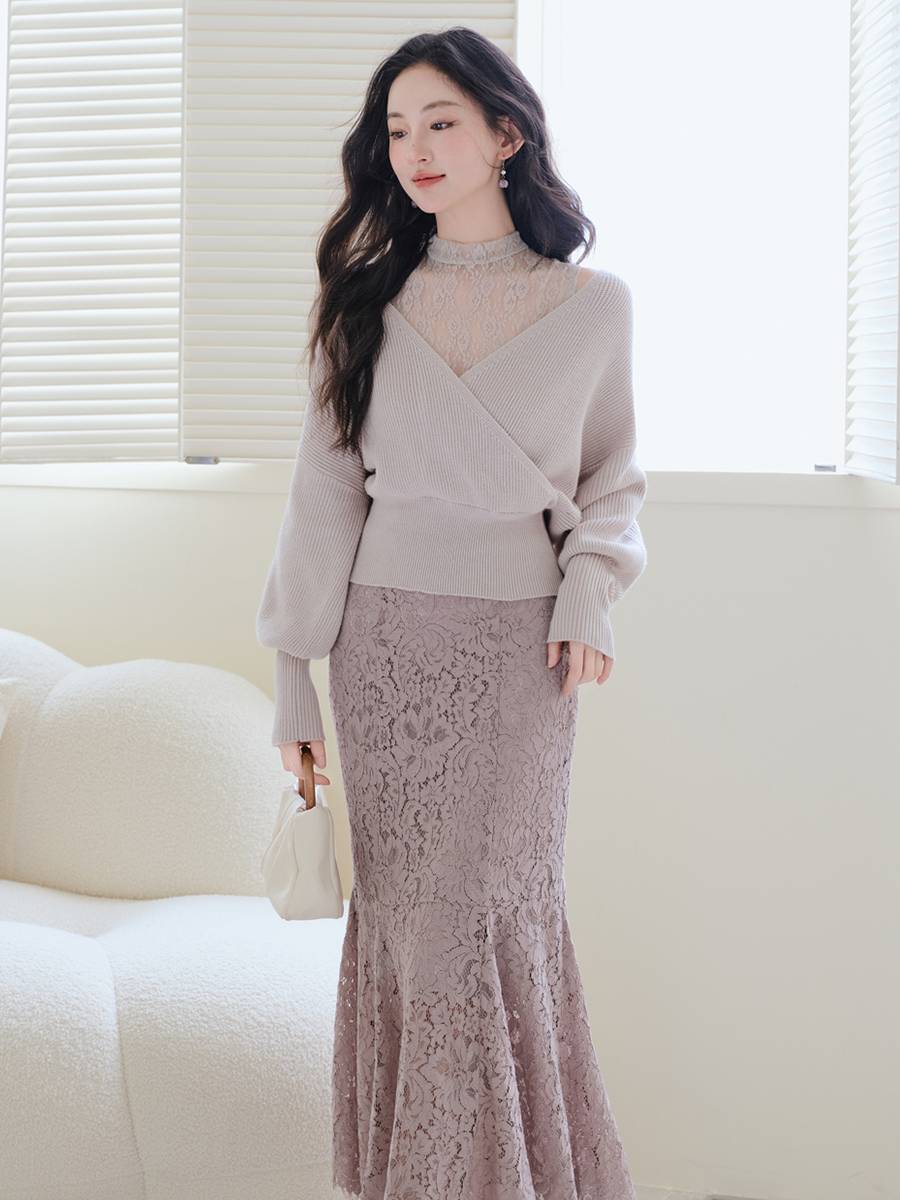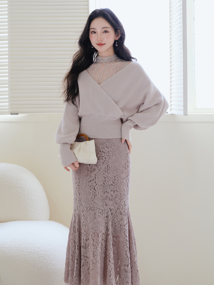 FA48321# 甜美蕾丝拼接灯笼袖罗纹针织衫+高腰蕾丝镂空鱼尾半身裙套装 服裝批發女裝批發服飾貨源
