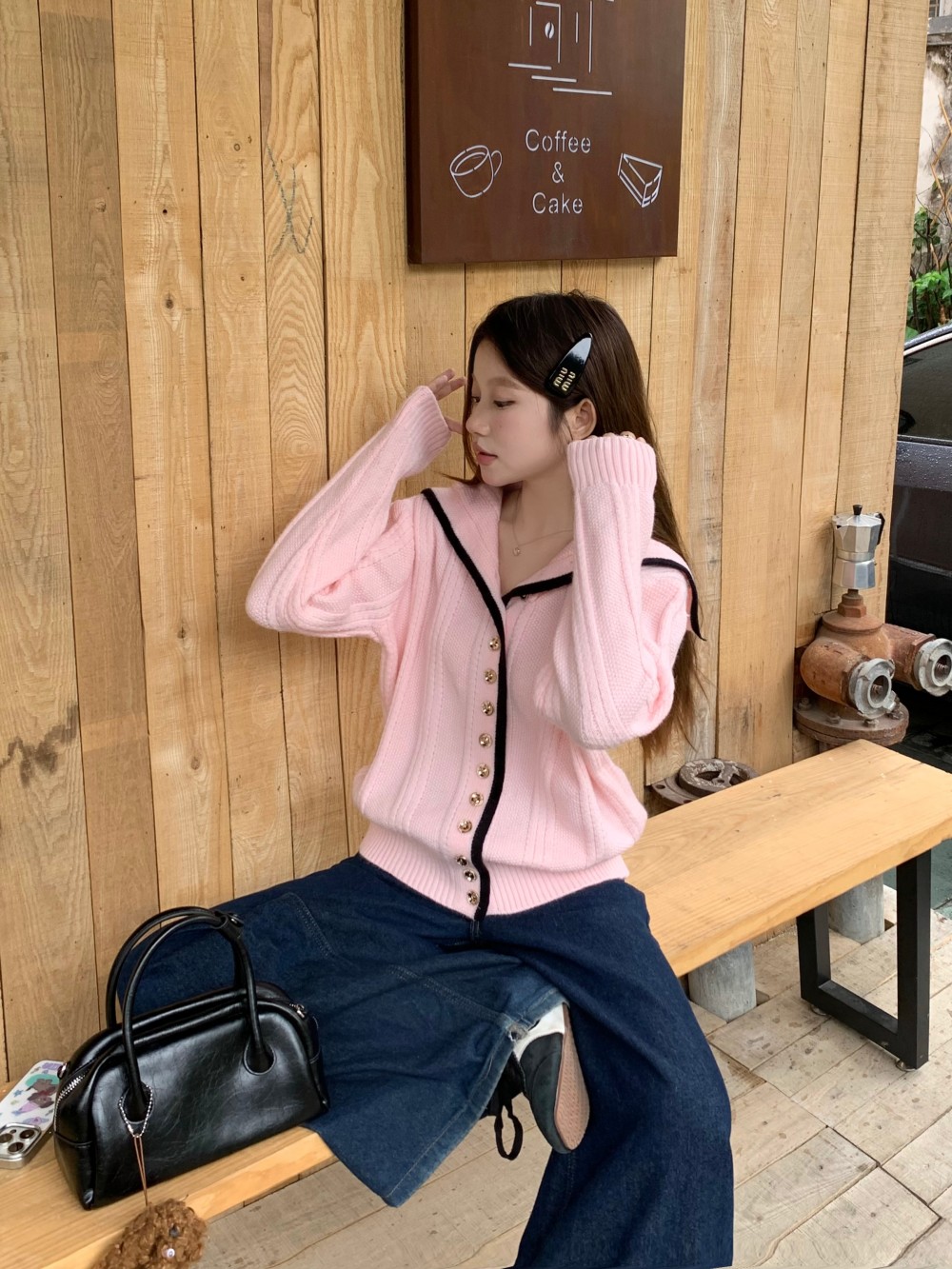 FA49126# 撞色边慵懒海军领针织衫毛衣开衫显瘦气质上衣女 服裝批發女裝批發服飾貨源
