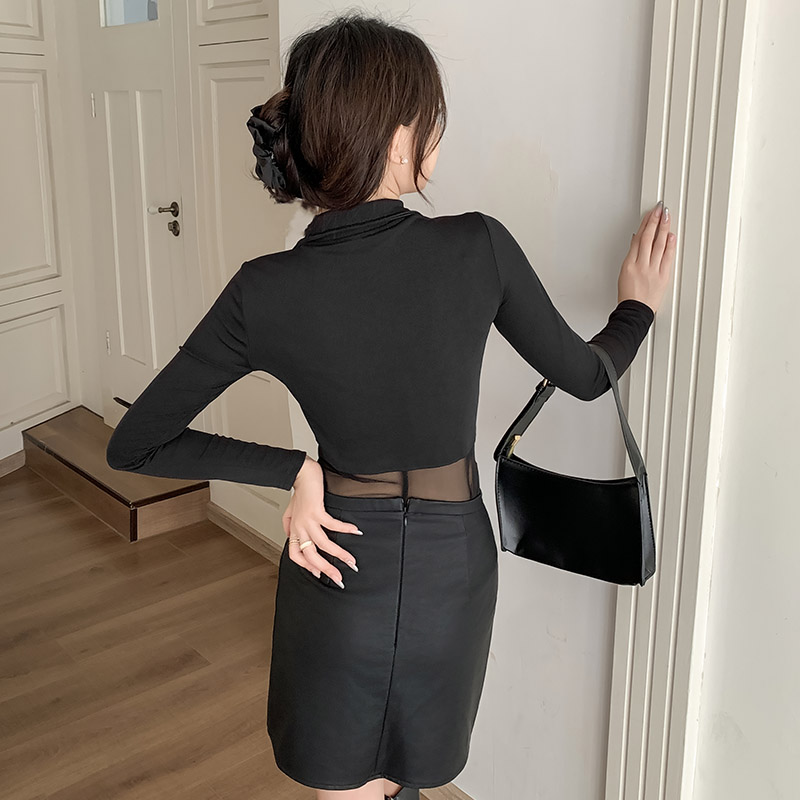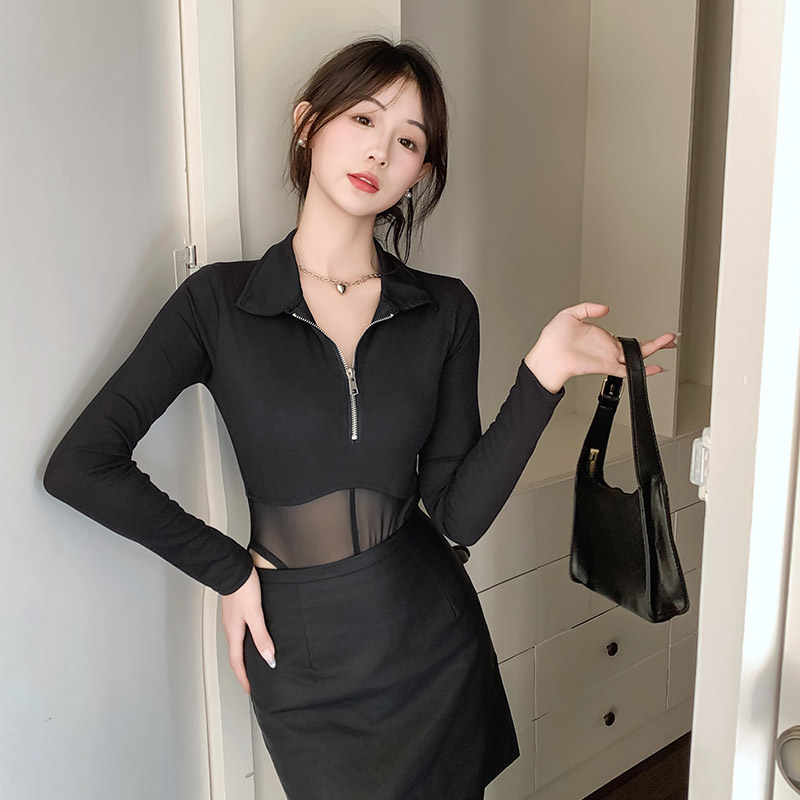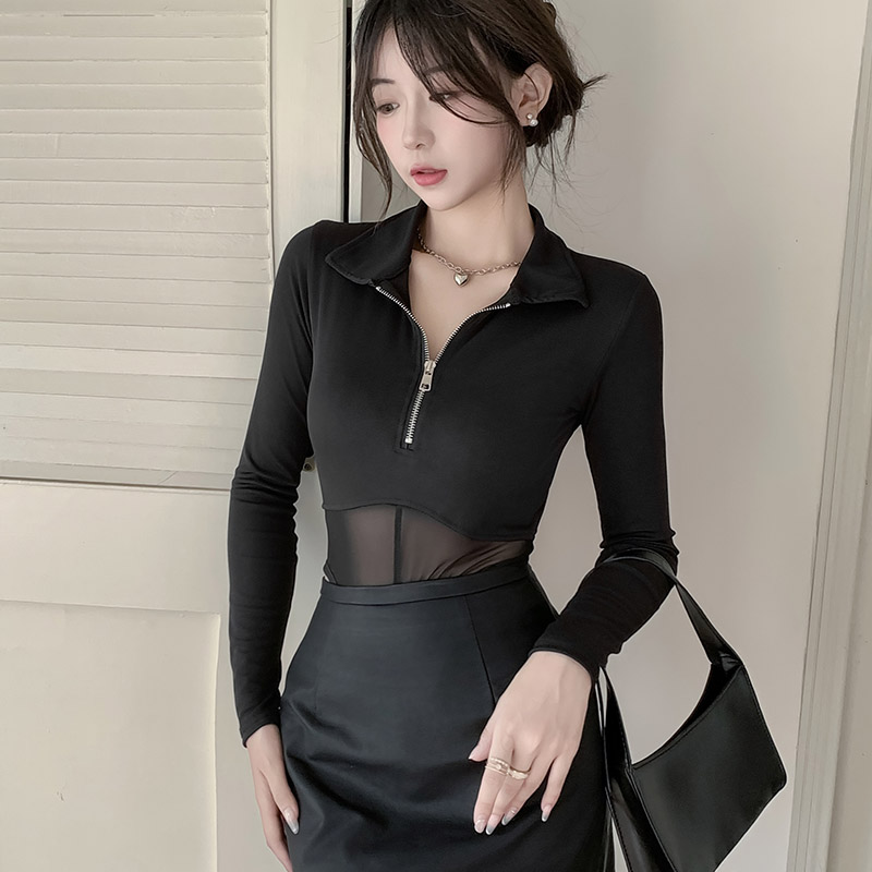 FA49139# 甜酷POLO领长袖T恤御姐透视网纱夜店风性感连体衣服上衣 服裝批發女裝批發服飾貨源
