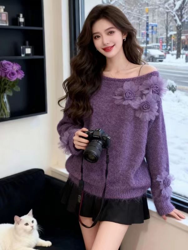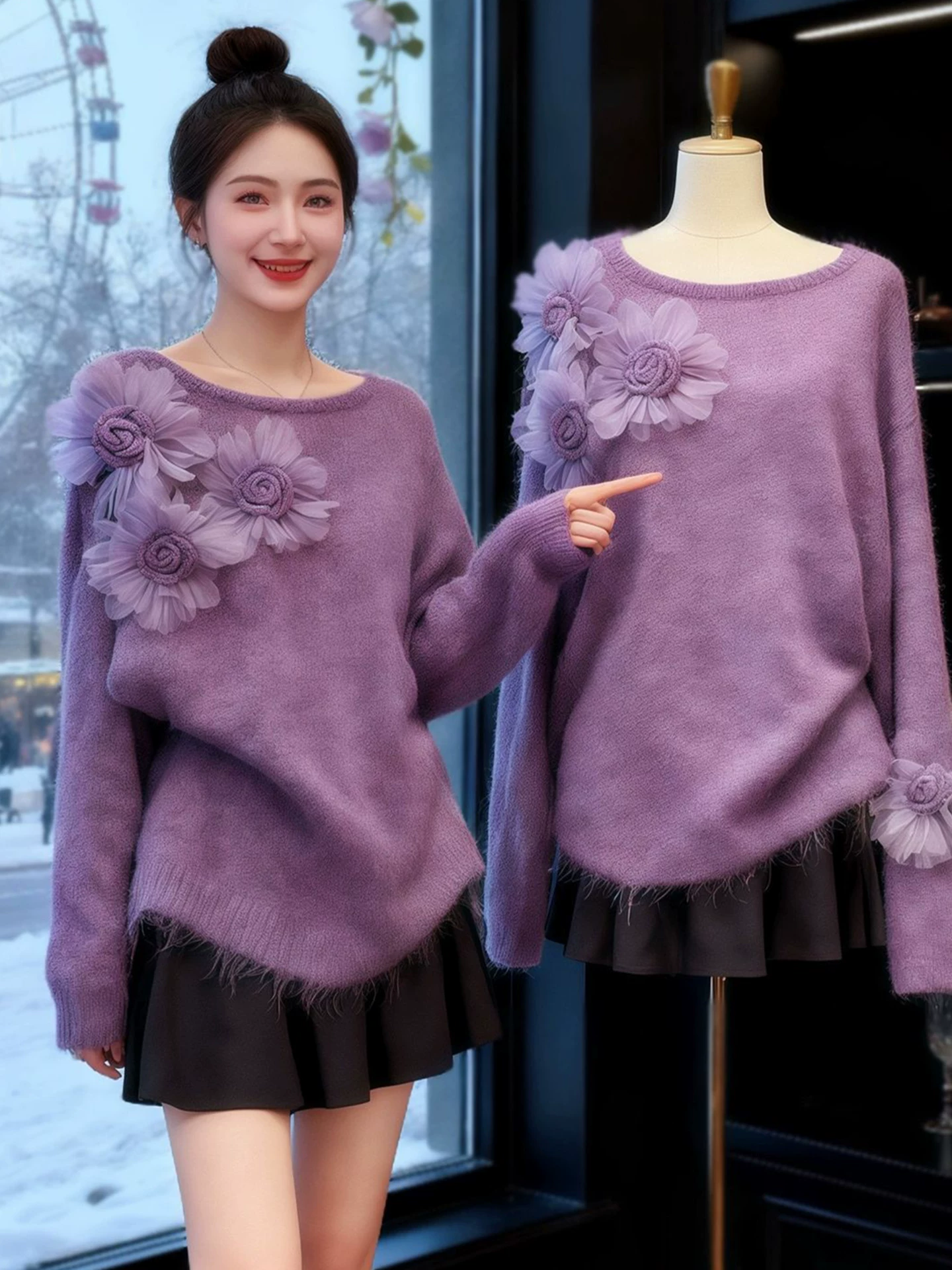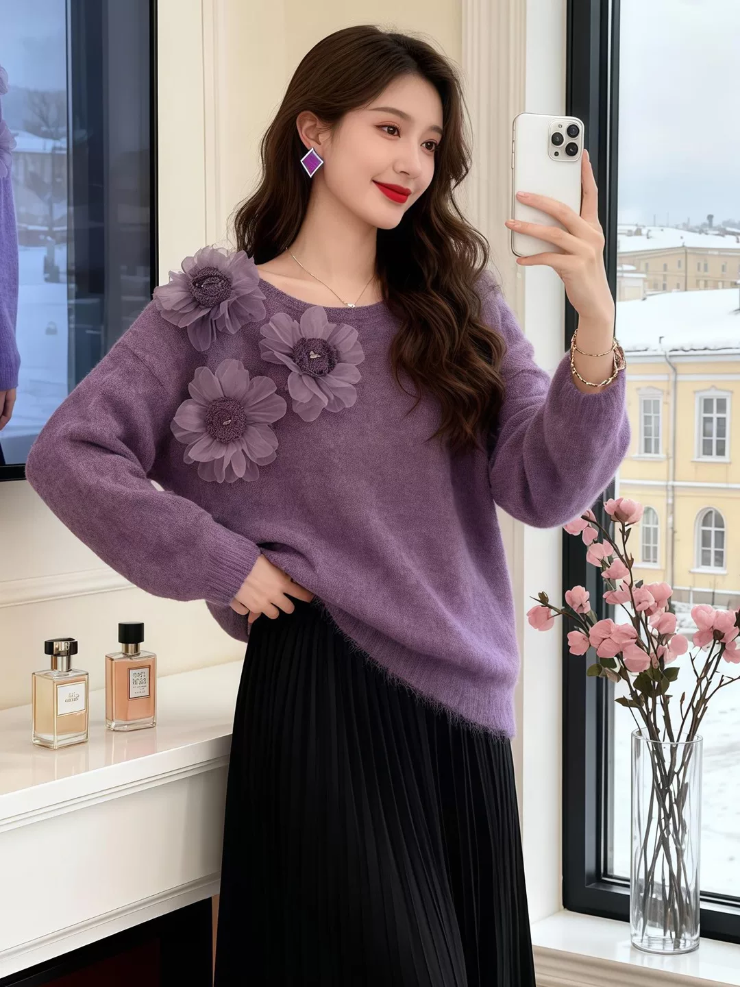 FA49147# 重工立体花朵针织衫上衣秋冬新款圆领韩系宽松甜美毛衣套头女 服裝批發女裝批發服飾貨源
