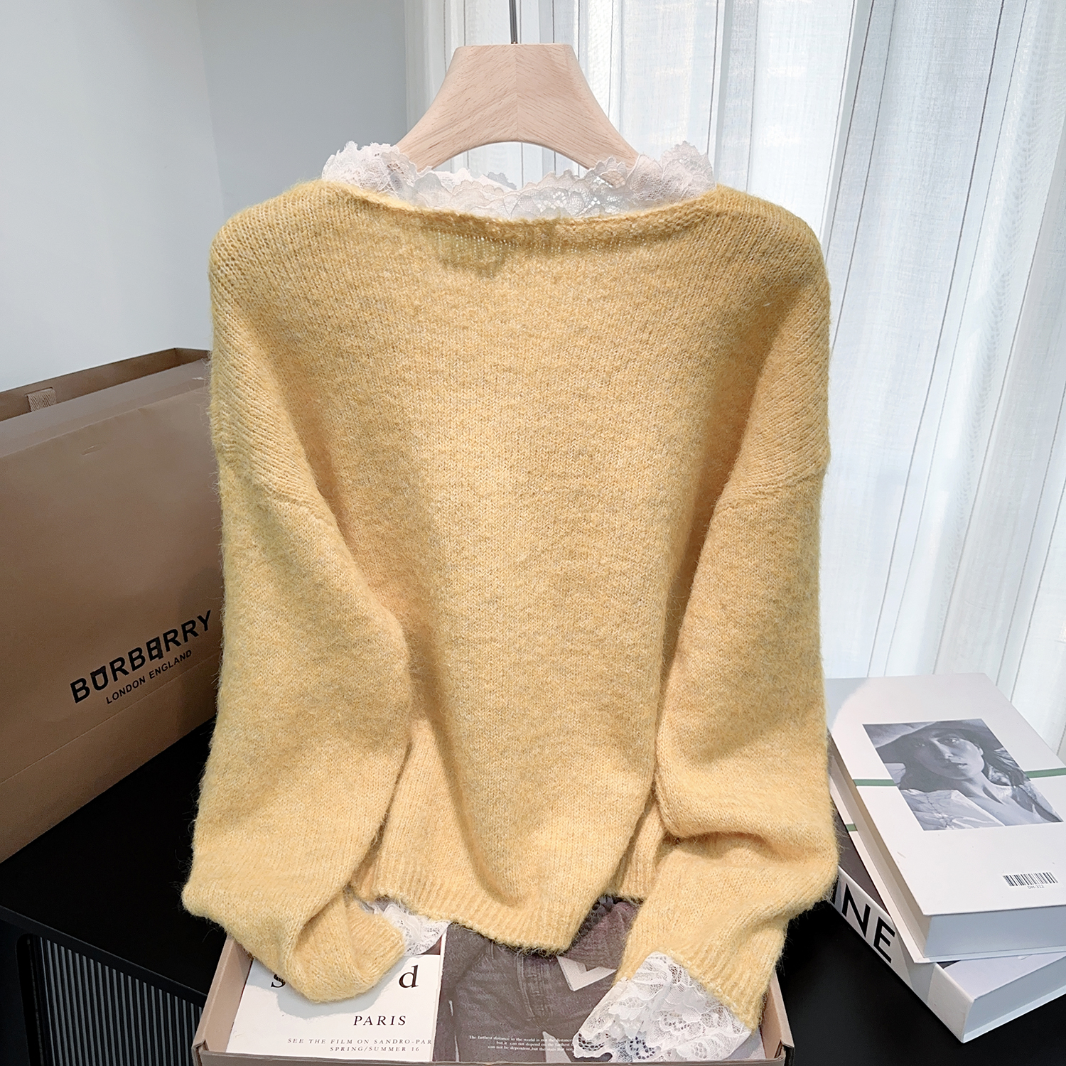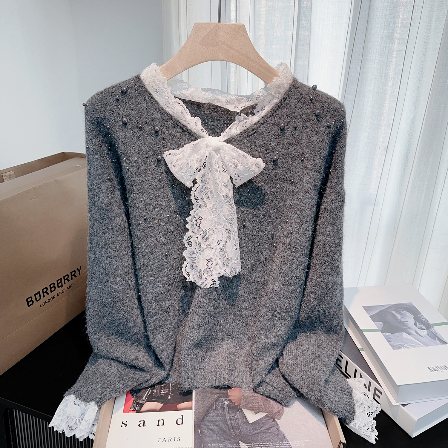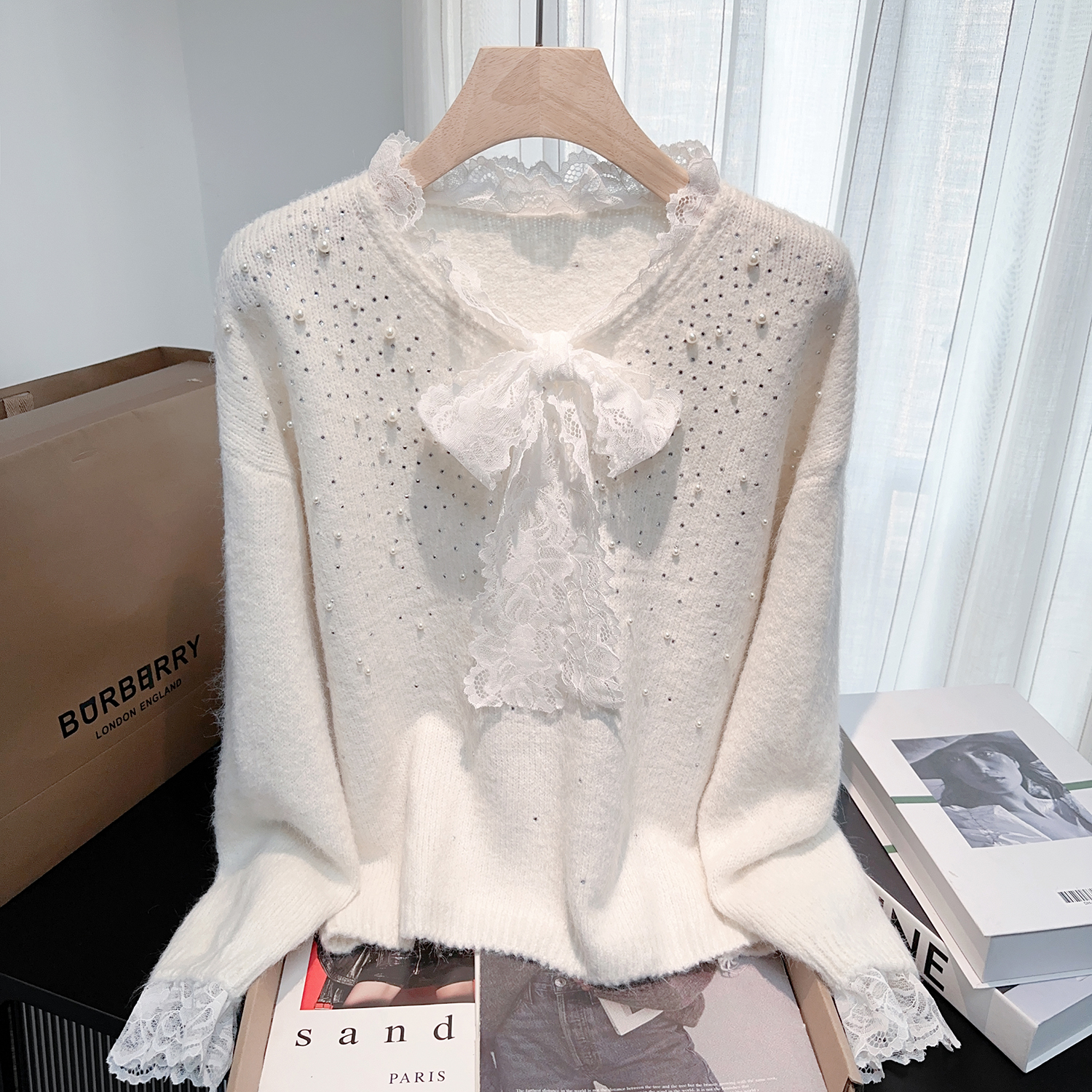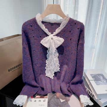 FA49207# 秋冬通勤蕾丝蝴蝶结宽松套头毛衣女小众百搭新款漂亮上衣 服裝批發女裝批發服飾貨源