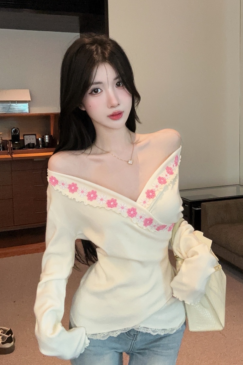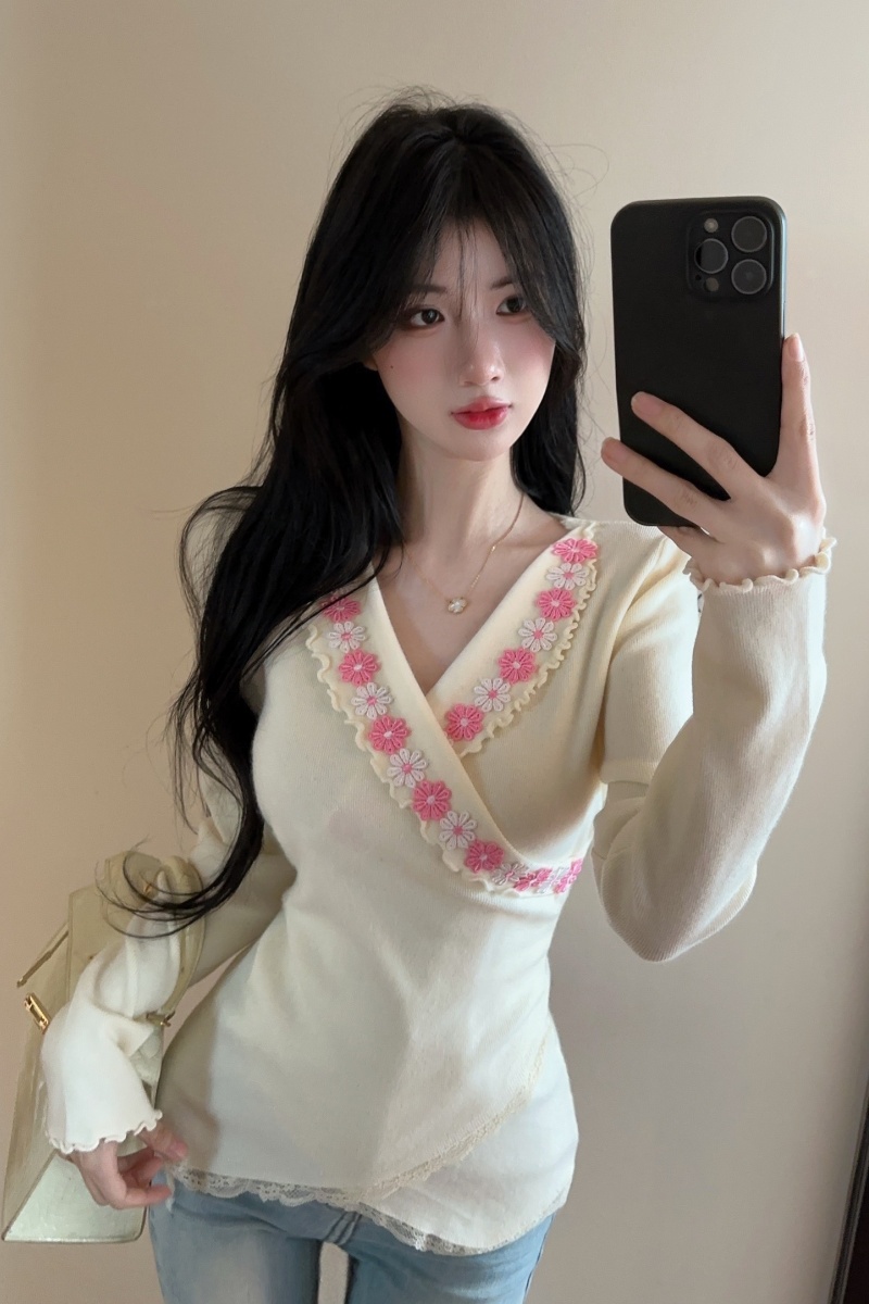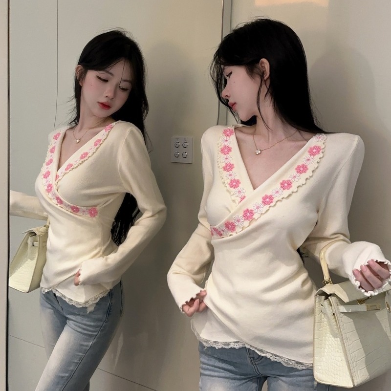 FA49215# 纯欲风奶白刺绣V领针织衫温柔甜妹氛围感穿搭搭配秒变画报女主 服裝批發女裝批發服飾貨源