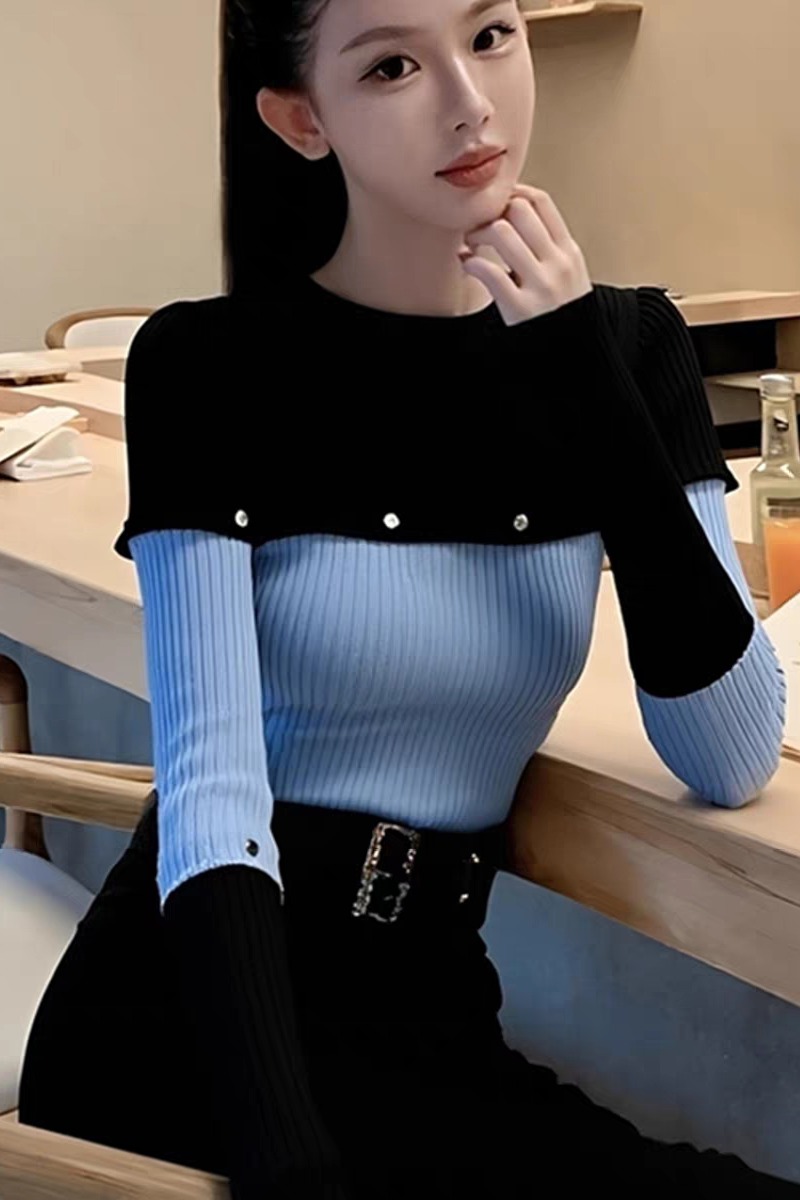 FA49216# 秋冬复古辣妹修身拼色上衣长袖针织衫打底衫内搭新款 服裝批發女裝批發服飾貨源