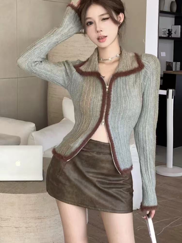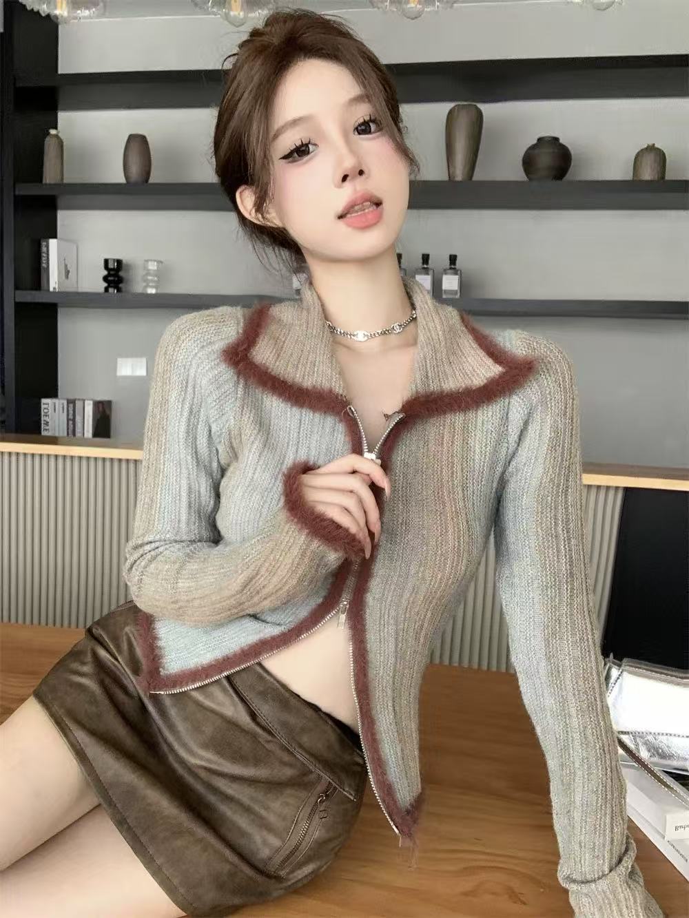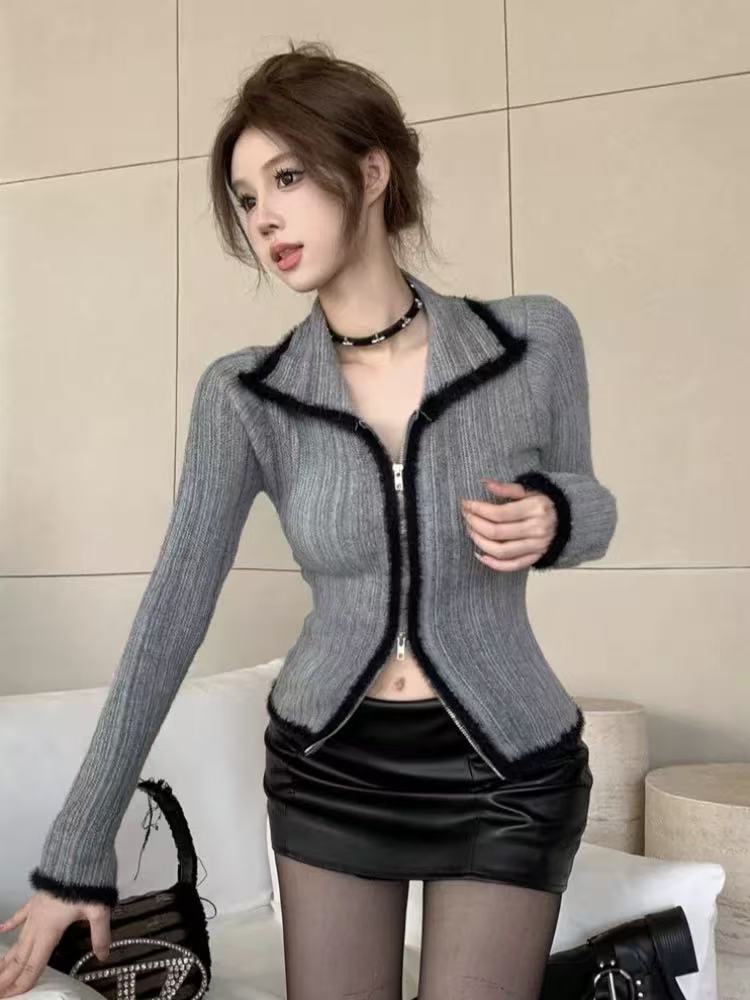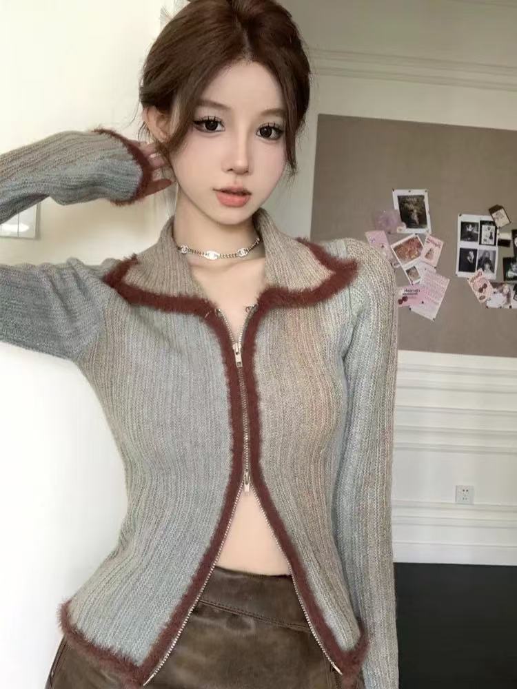 FA49218# 秋冬独特别致设计复古辣妹修身渐变色翻领上衣毛衣针织打底开衫女 服裝批發女裝批發服飾貨源