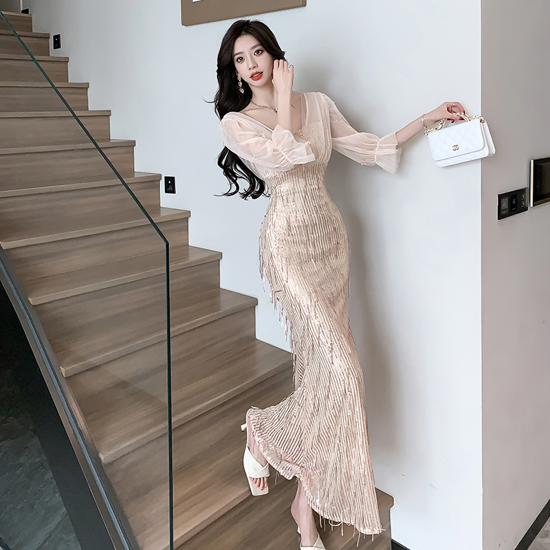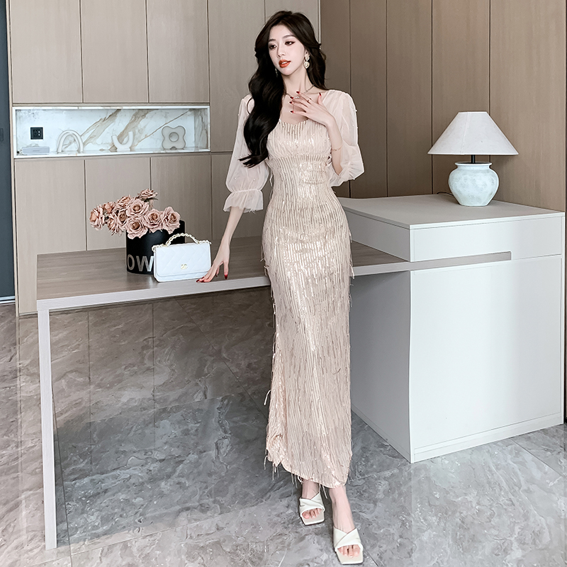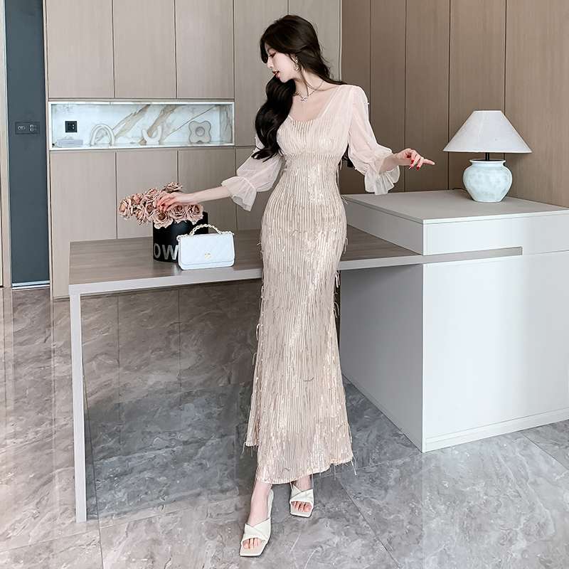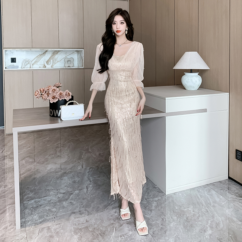 FA49291# 重工钉珠贵夫人亮片晚礼服高端气质感轻奢长连衣裙女