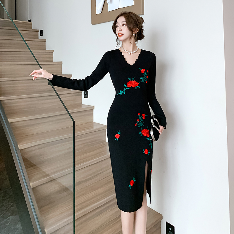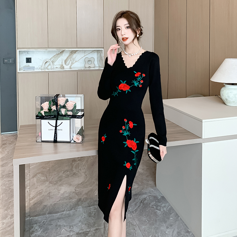 FA49292# 设计感气质收腰显瘦高级女人味优雅时尚刺绣连衣裙女