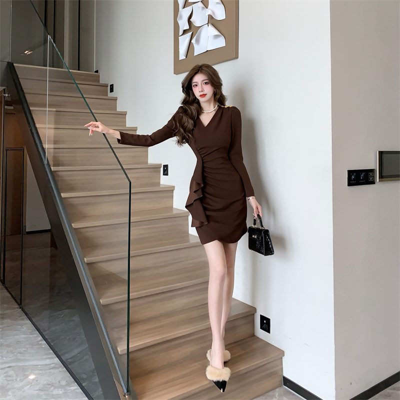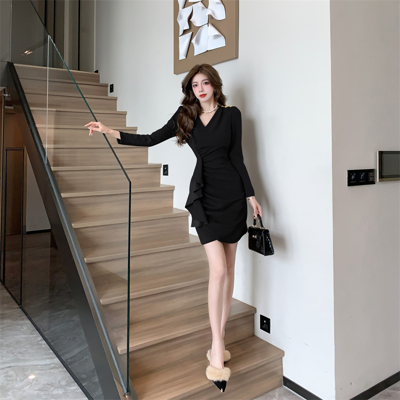FA49295# 设计感气质收腰显瘦荷叶边优雅时尚不规则连衣裙女