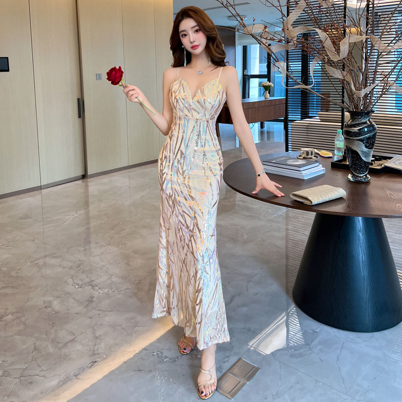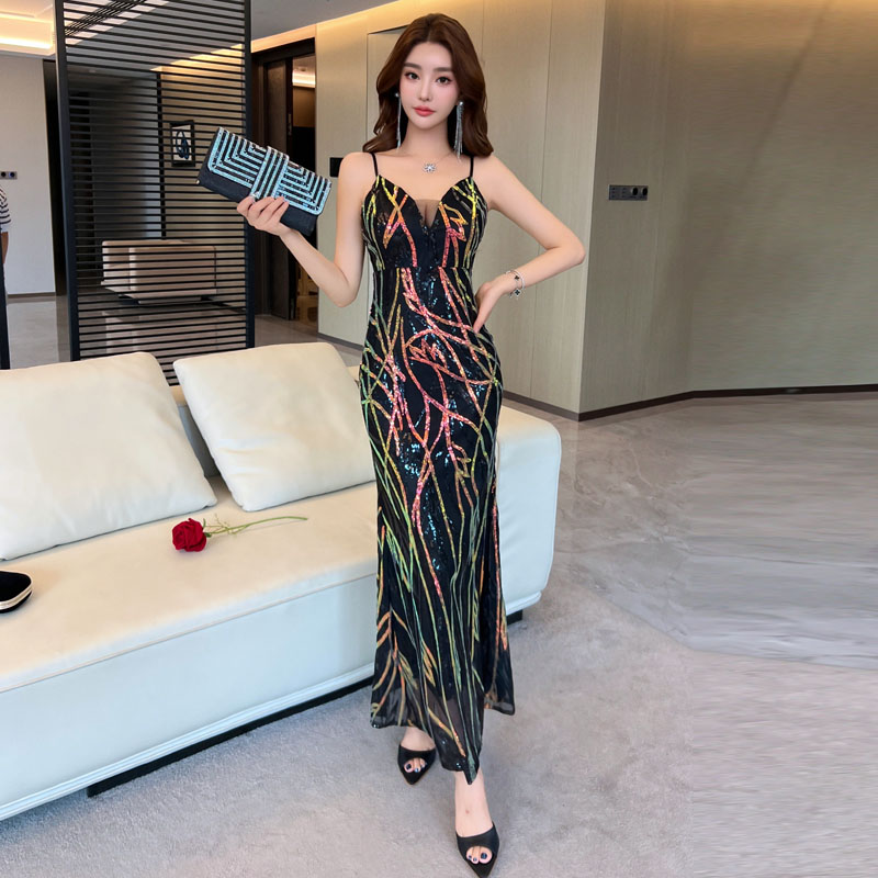 FA49298# 款气质名媛风亮片V领无袖连衣裙女宴会礼服裙