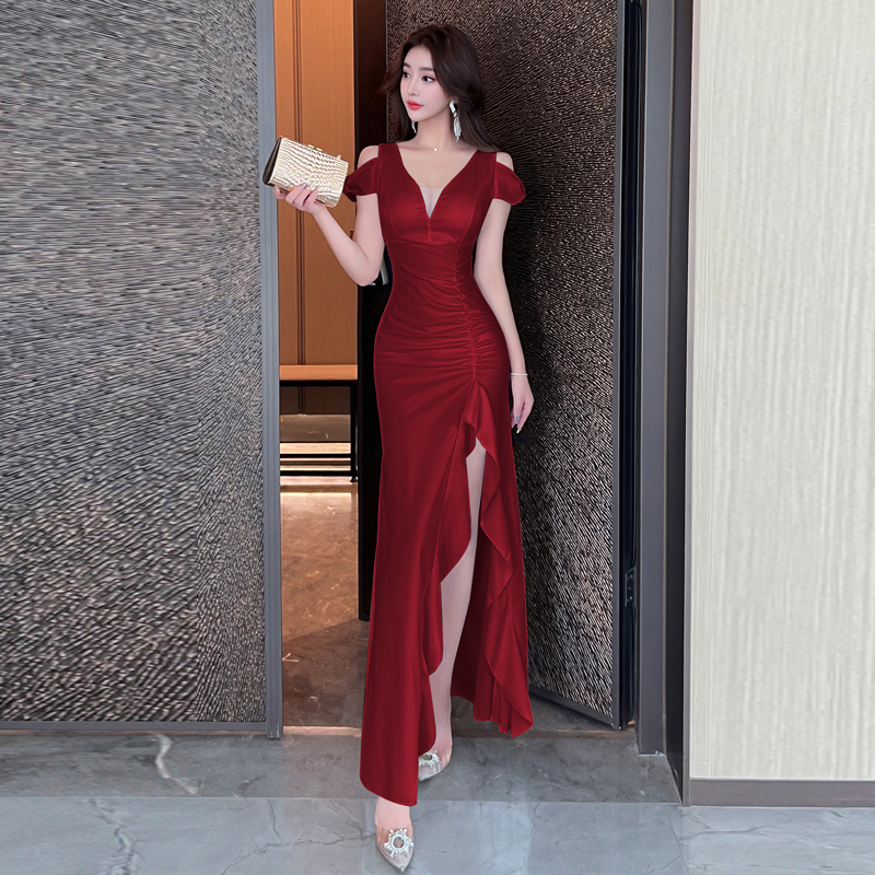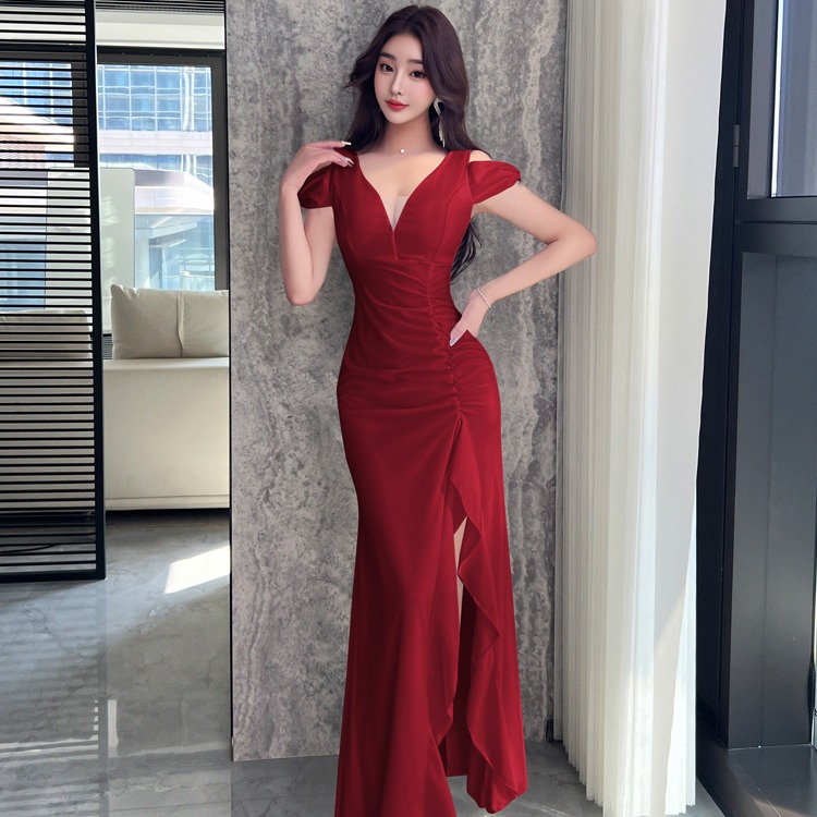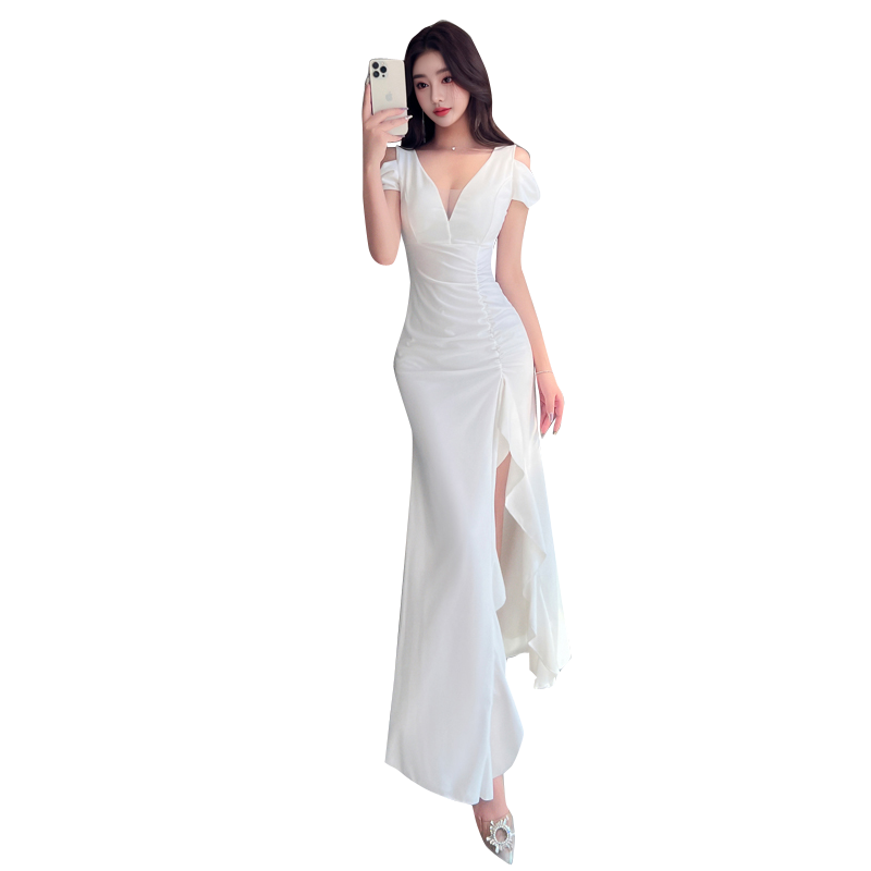 FA49315# 夜场性感显瘦遮肚气质名媛足疗技师工作服水疗会所露肩长款晚礼服