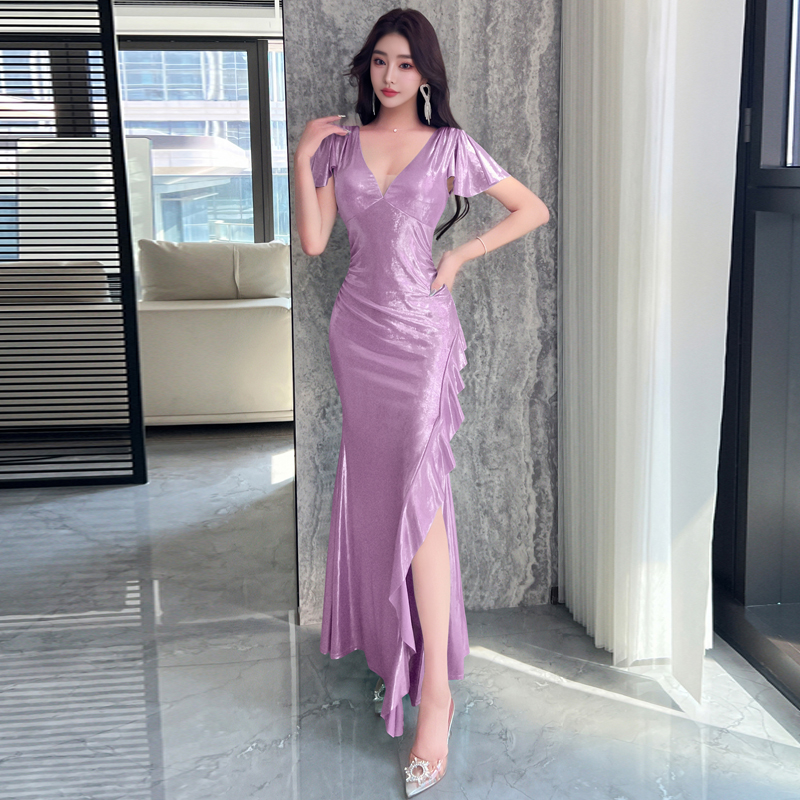 FA49316# 夜总会上班衣服低胸性感修身开叉长裙高级感晚礼服spa技师工作服