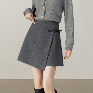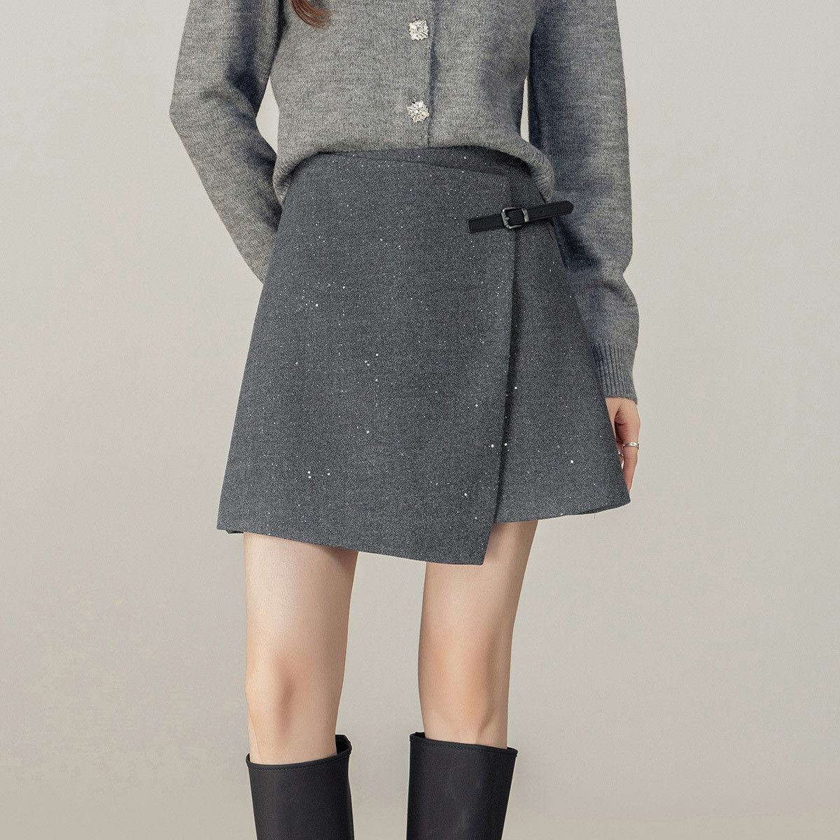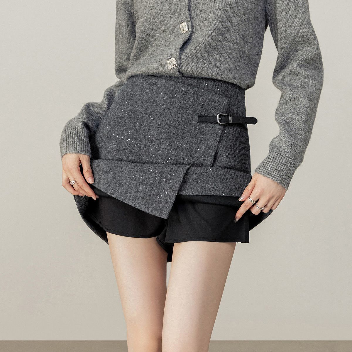 FA49408# 格雷系皮袢扣交叠毛呢半身裙短款秋冬款新品高品质显瘦短裙小个子 服裝批發女裝批發服飾貨源
