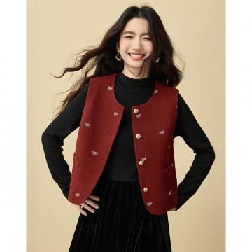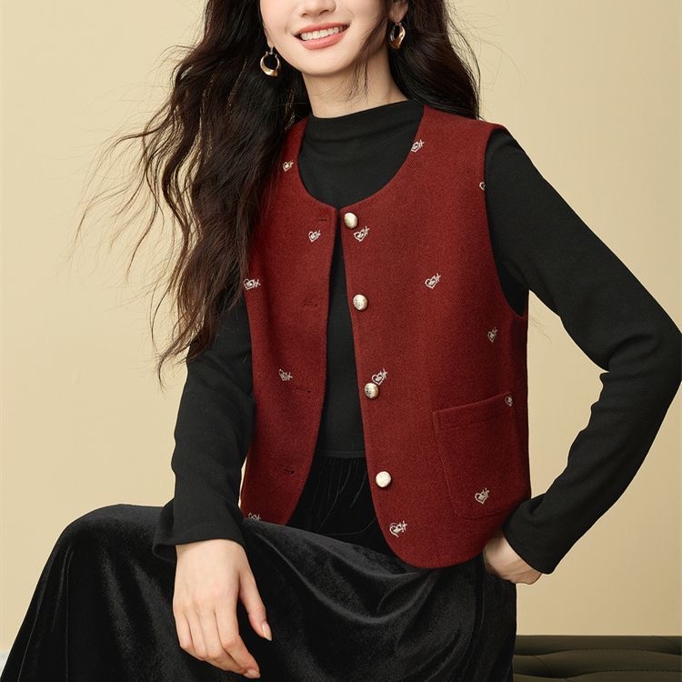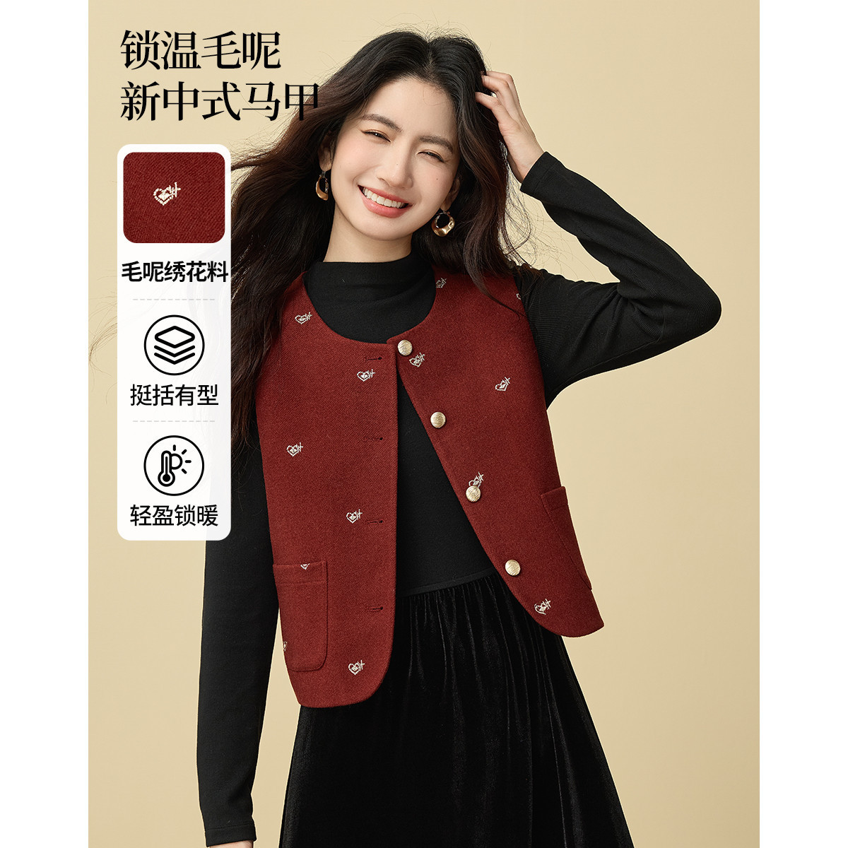 FA49410# 东方美学秋冬25新款时尚质感精致保暖毛呢绣花圆领马夹 服裝批發女裝批發服飾貨源