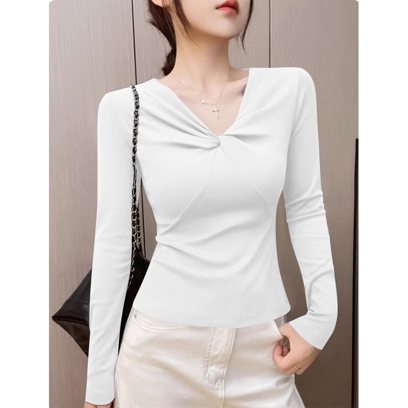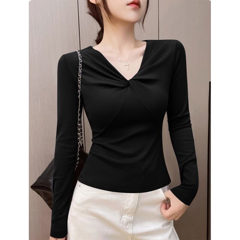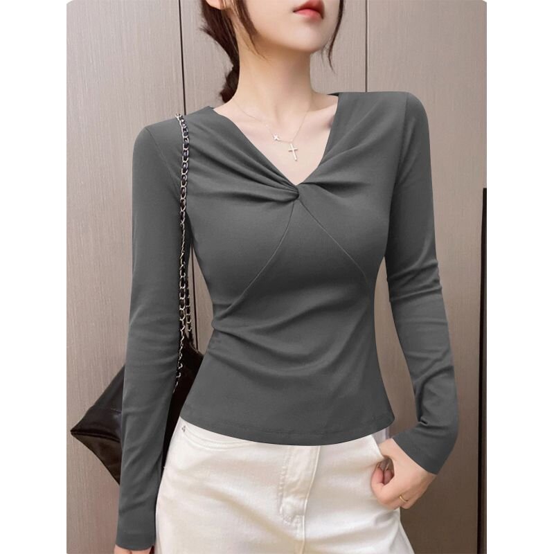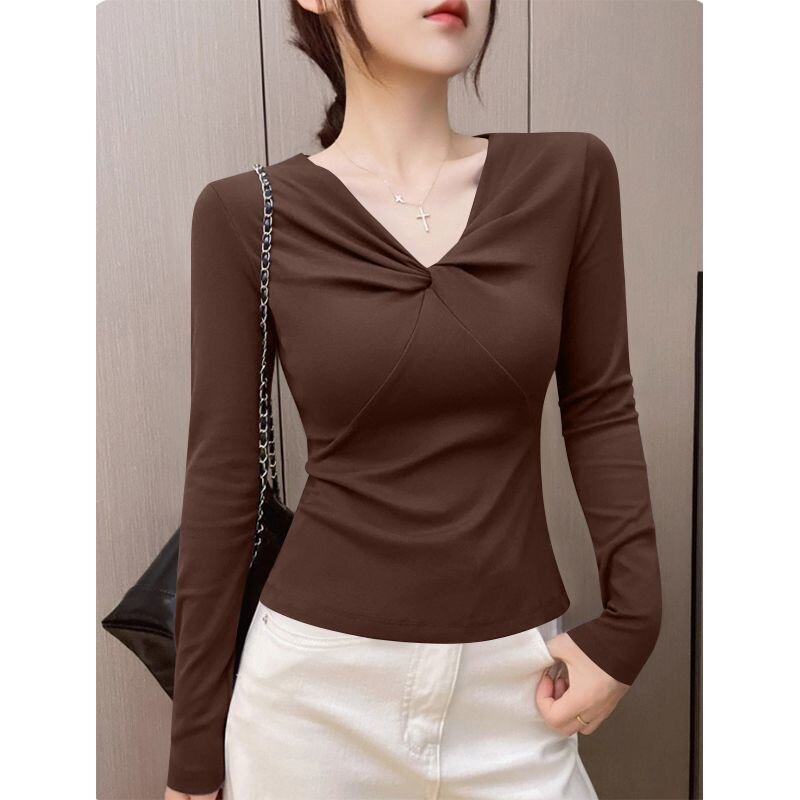 FA49443# 咖色V领长袖打底衫女内搭秋冬季新款显瘦扭结设计感T恤上衣 服裝批發女裝批發服飾貨源
