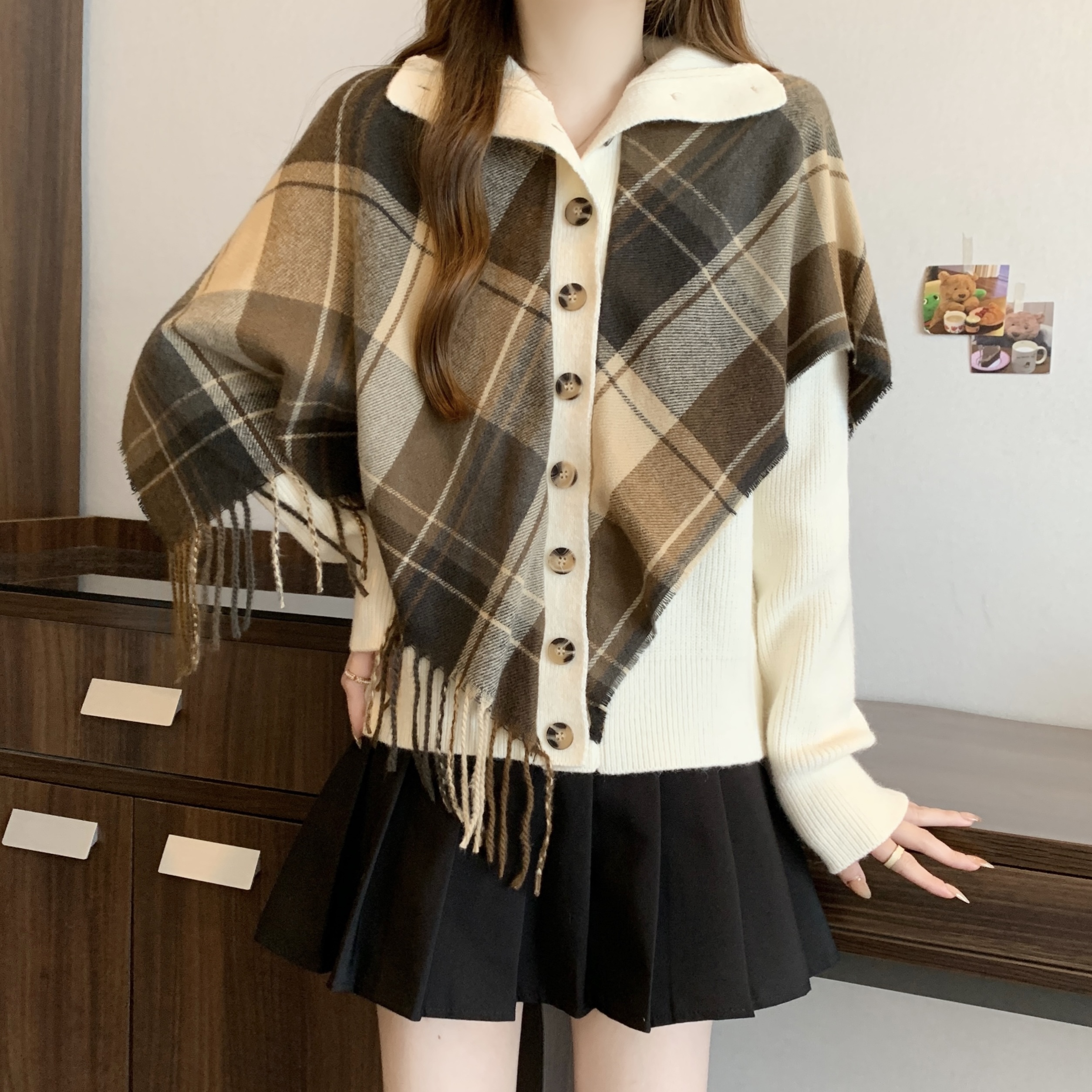FA51547# 大码高领针织拼接格子披肩假两件不规则开衫 服裝批發女裝批發服飾貨源