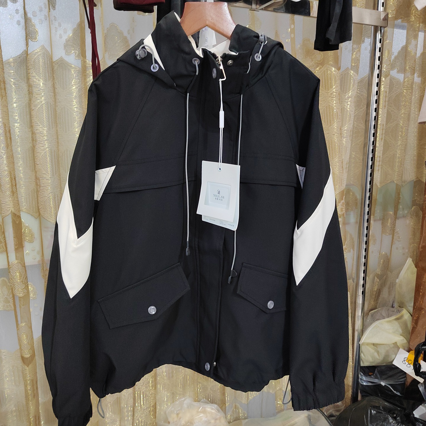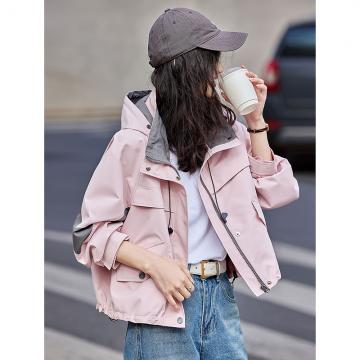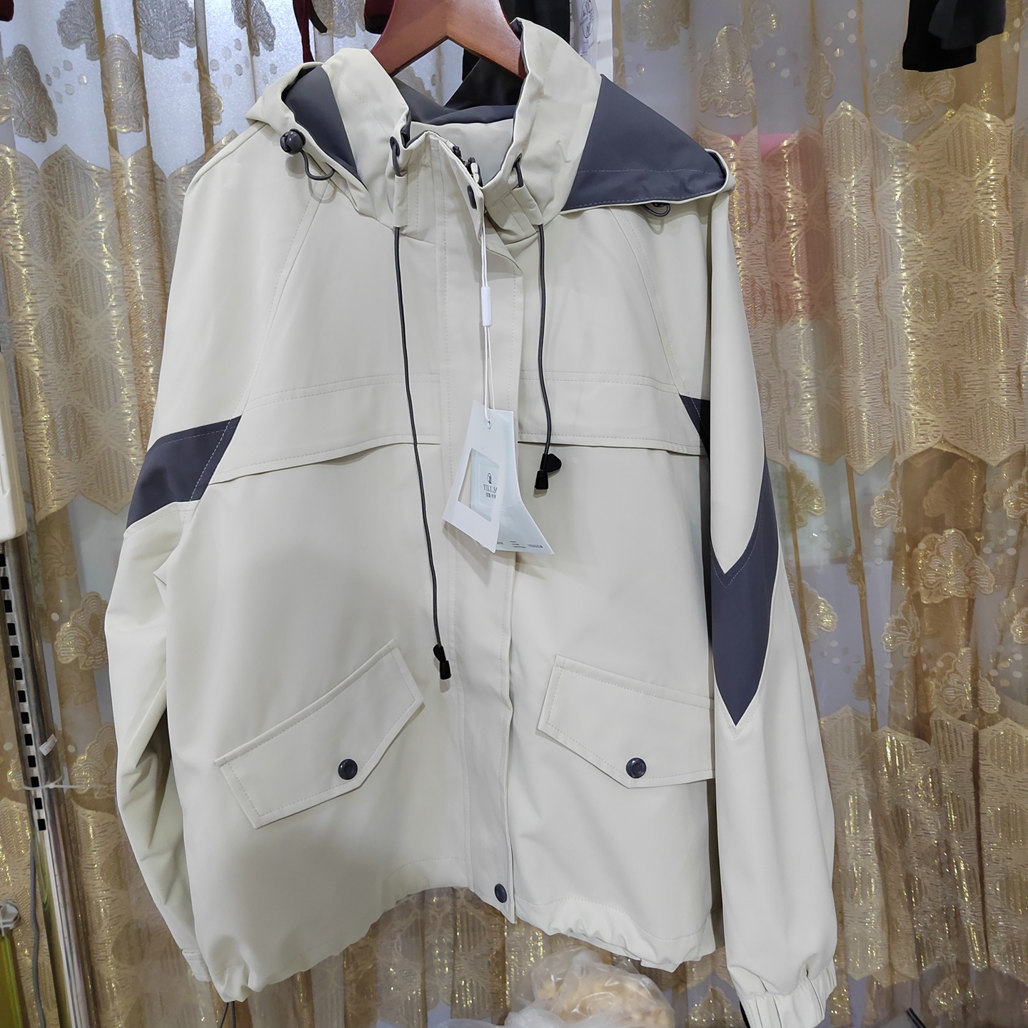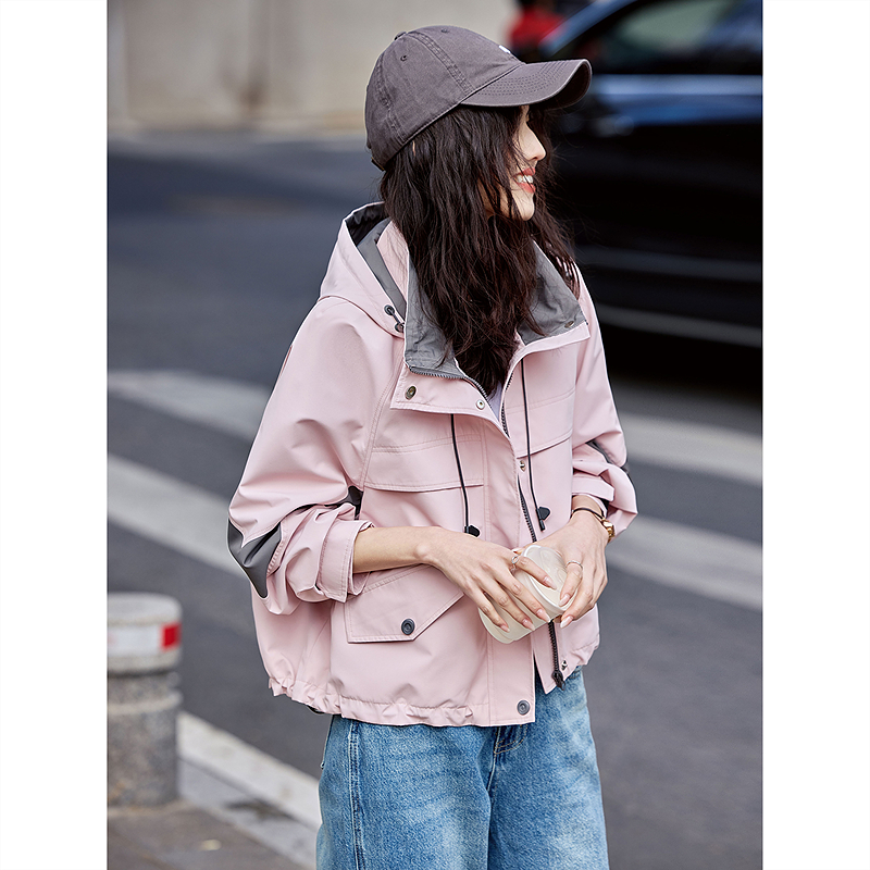 FA51575# 新款时尚连帽拼色外套女春秋新款宽松休闲小个子短款风衣夹克 服裝批發女裝批發服飾貨源