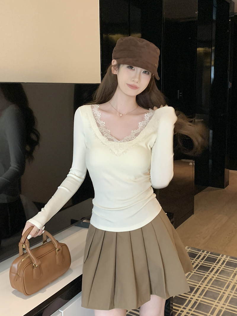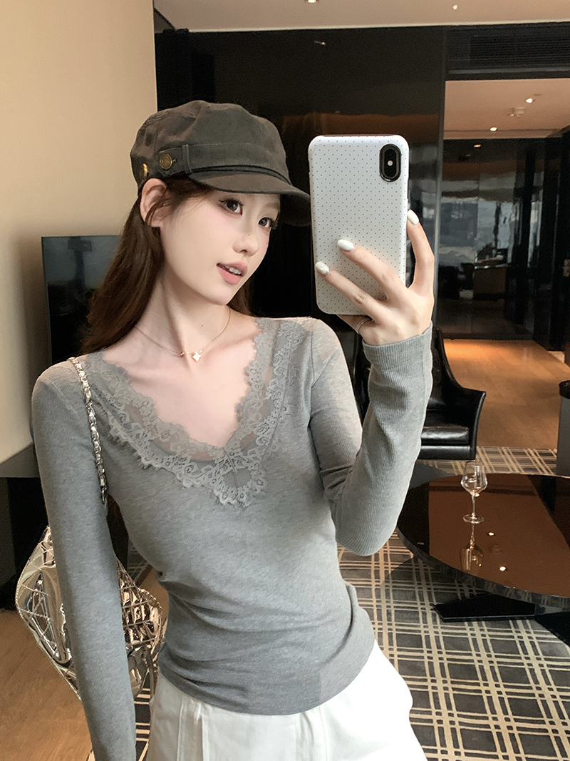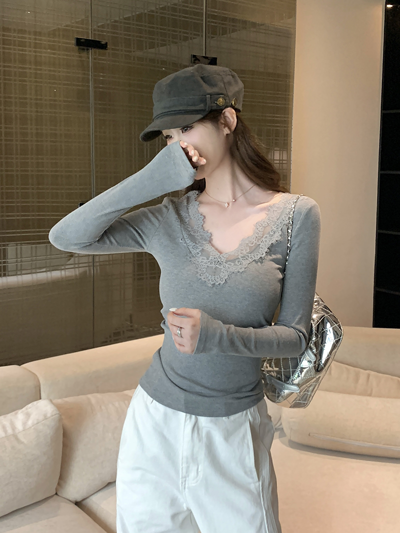 FA55669# 蕾丝拼接长袖女新款秋冬季显瘦高级感上衣 服裝批發女裝批發服飾貨源