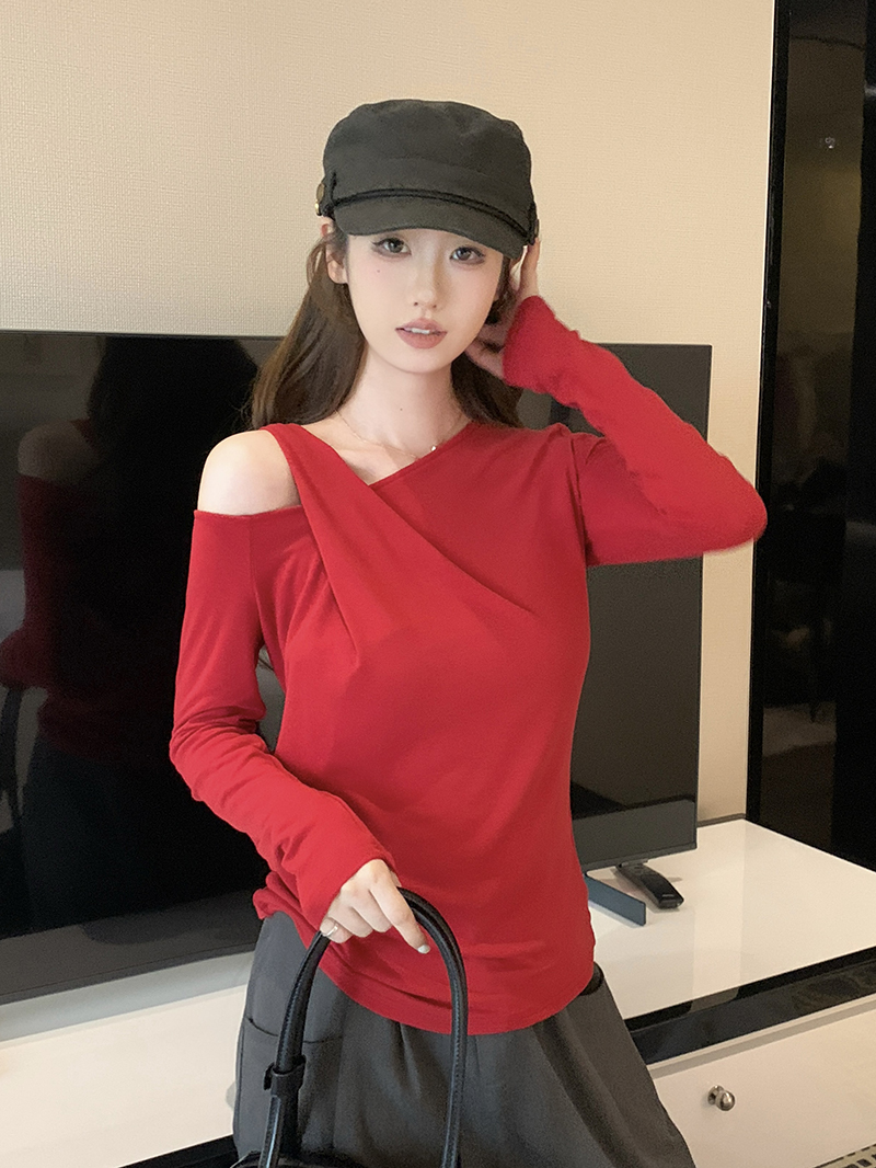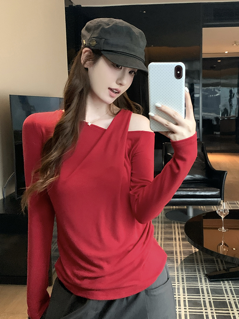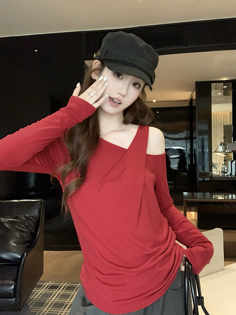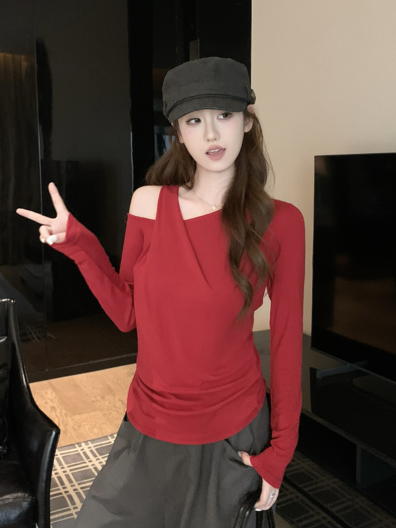 FA55670# 设计感红色不规则斜肩长袖t恤女秋冬季 服裝批發女裝批發服飾貨源