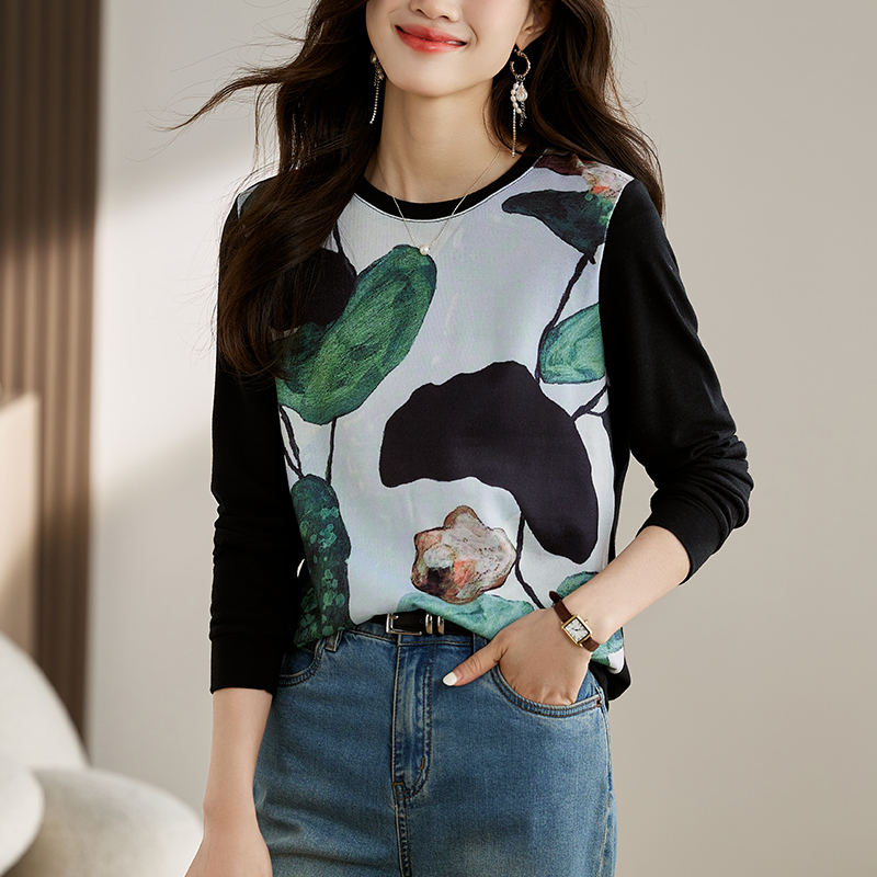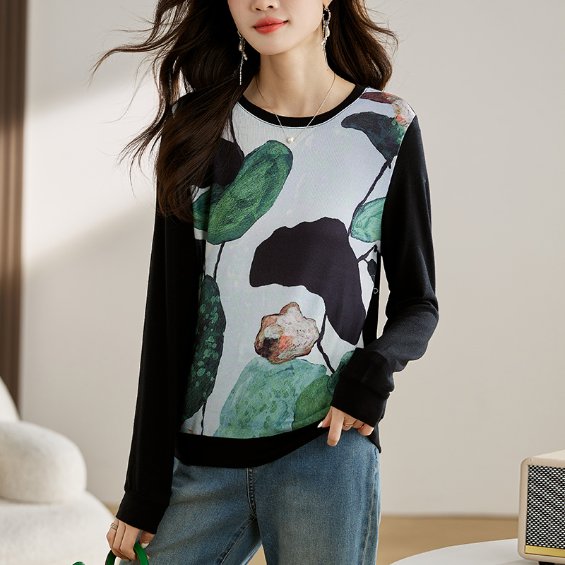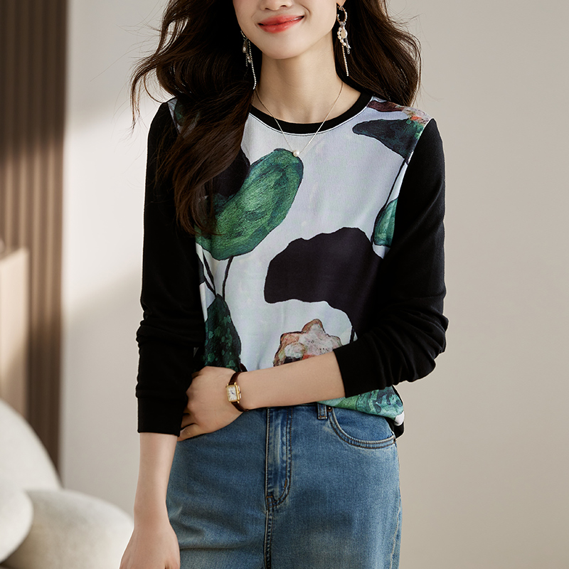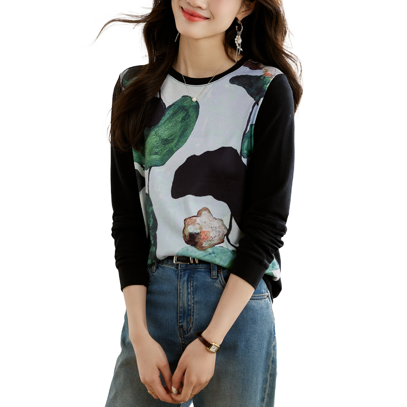 FA55694# 新款针织女长袖春新款高端印花套头休闲圆领上衣 服裝批發女裝批發服飾貨源