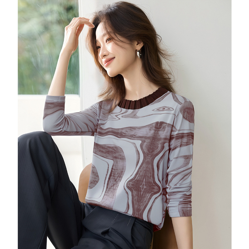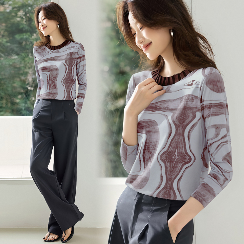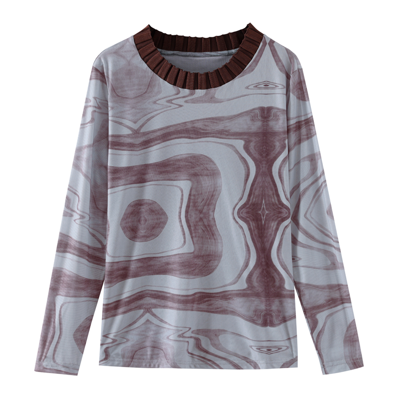 FA55695# 长袖设计感宽松套头上衣女秋新款韩国网印花圆领T恤 服裝批發女裝批發服飾貨源
