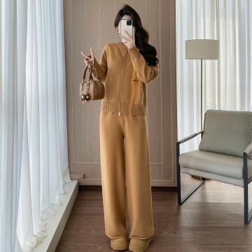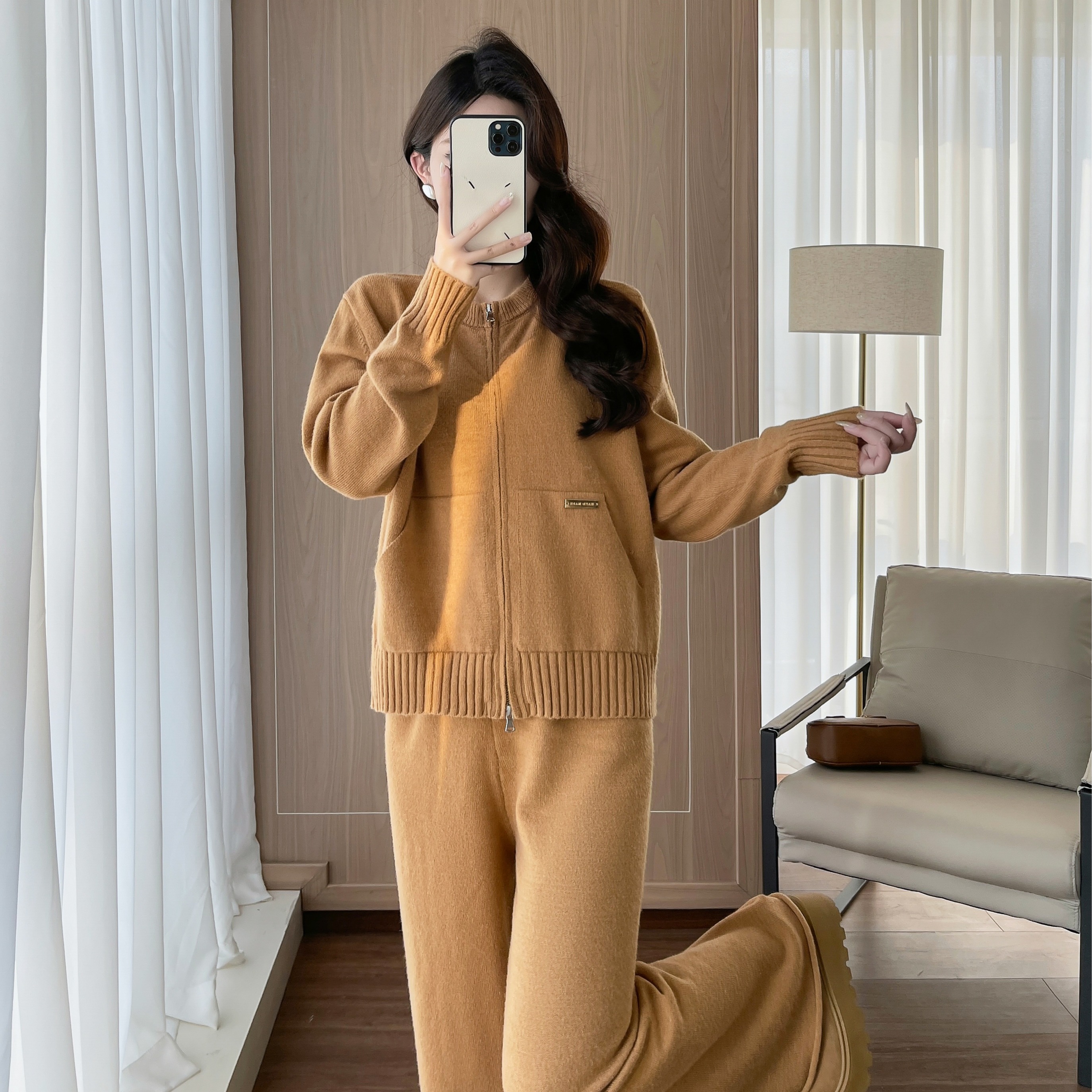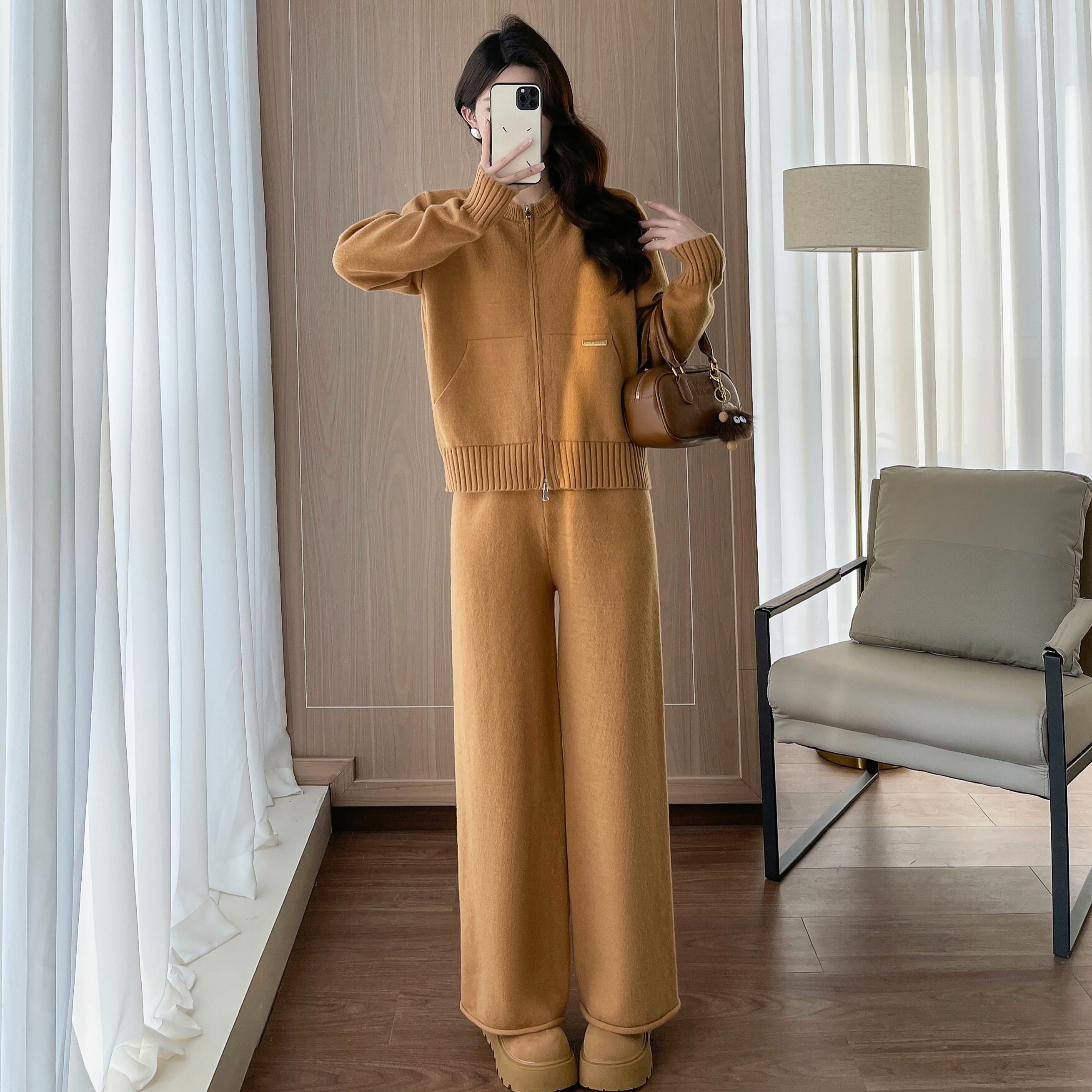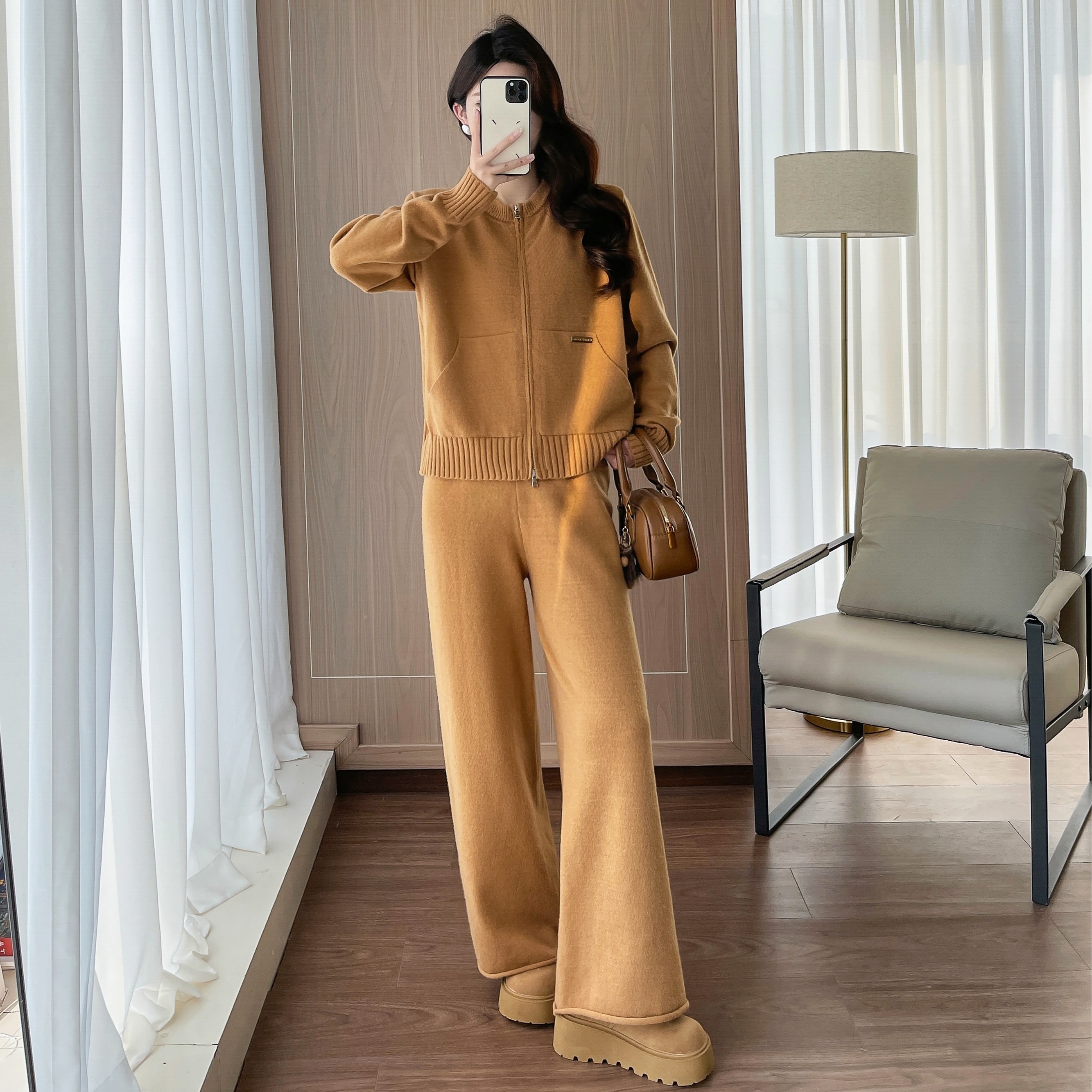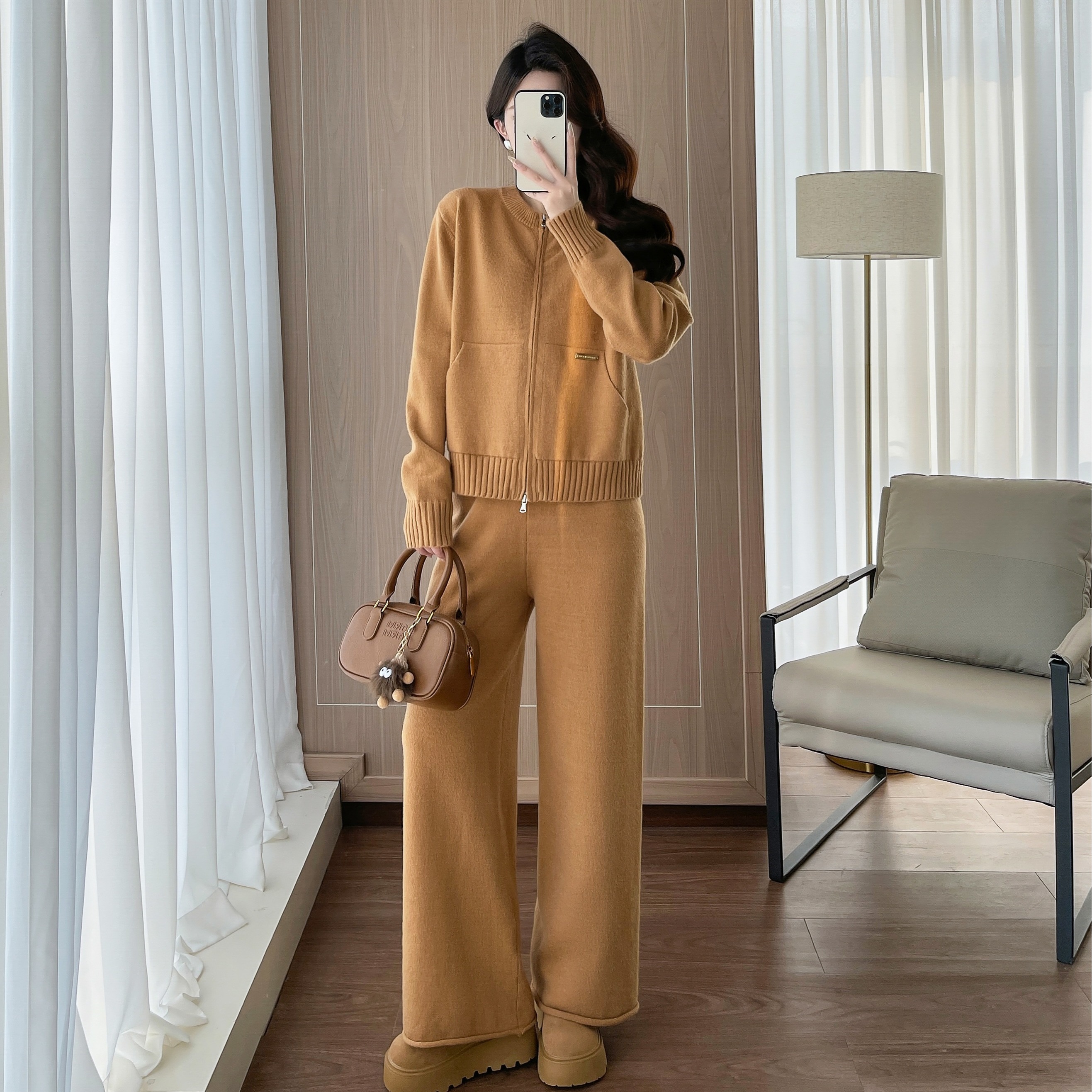 FA55733# 法式休闲复古风套装秋冬新款舒适百搭针织拉链开衫长裤两件套 服裝批發女裝批發服飾貨源