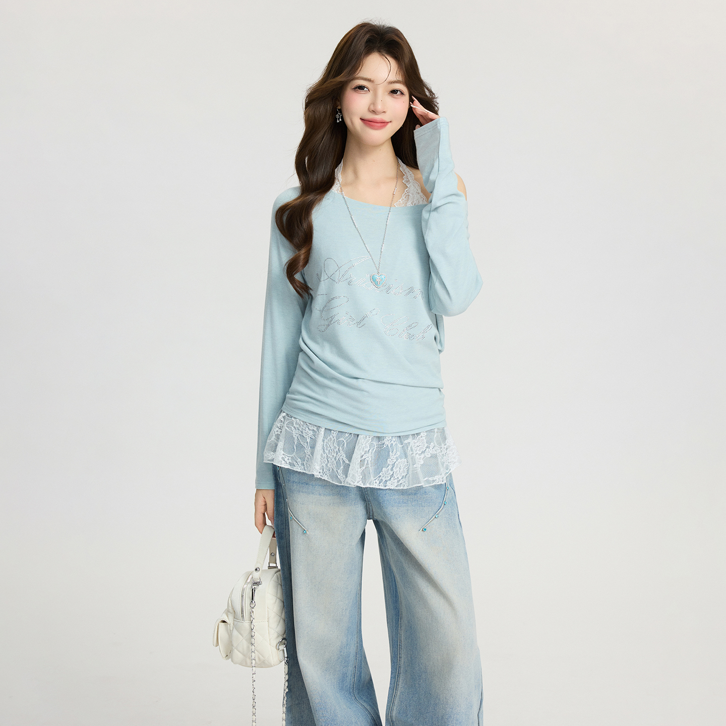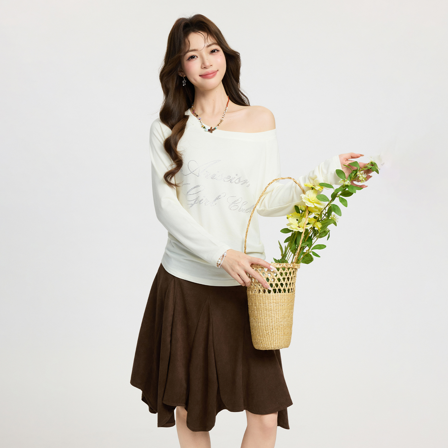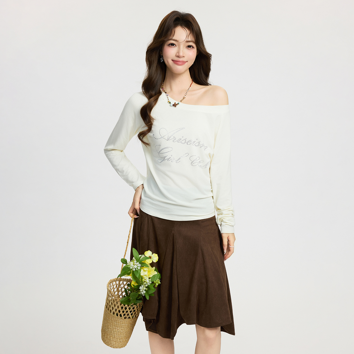 FA55747# 烫钻一字领斜角露肩宽松显瘦内搭打底衫T恤春长袖上衣女 服裝批發女裝批發服飾貨源