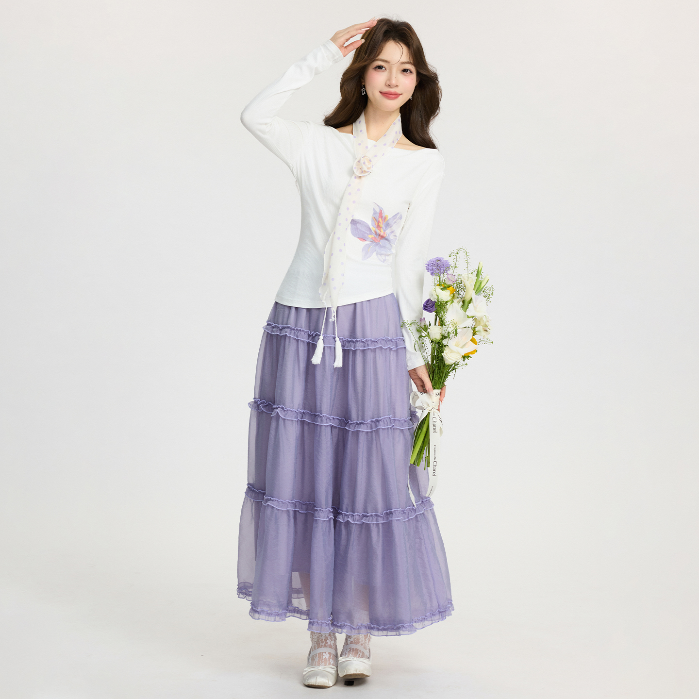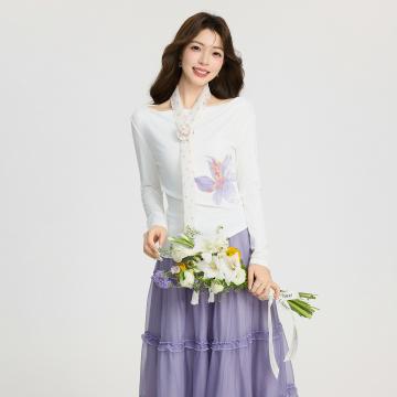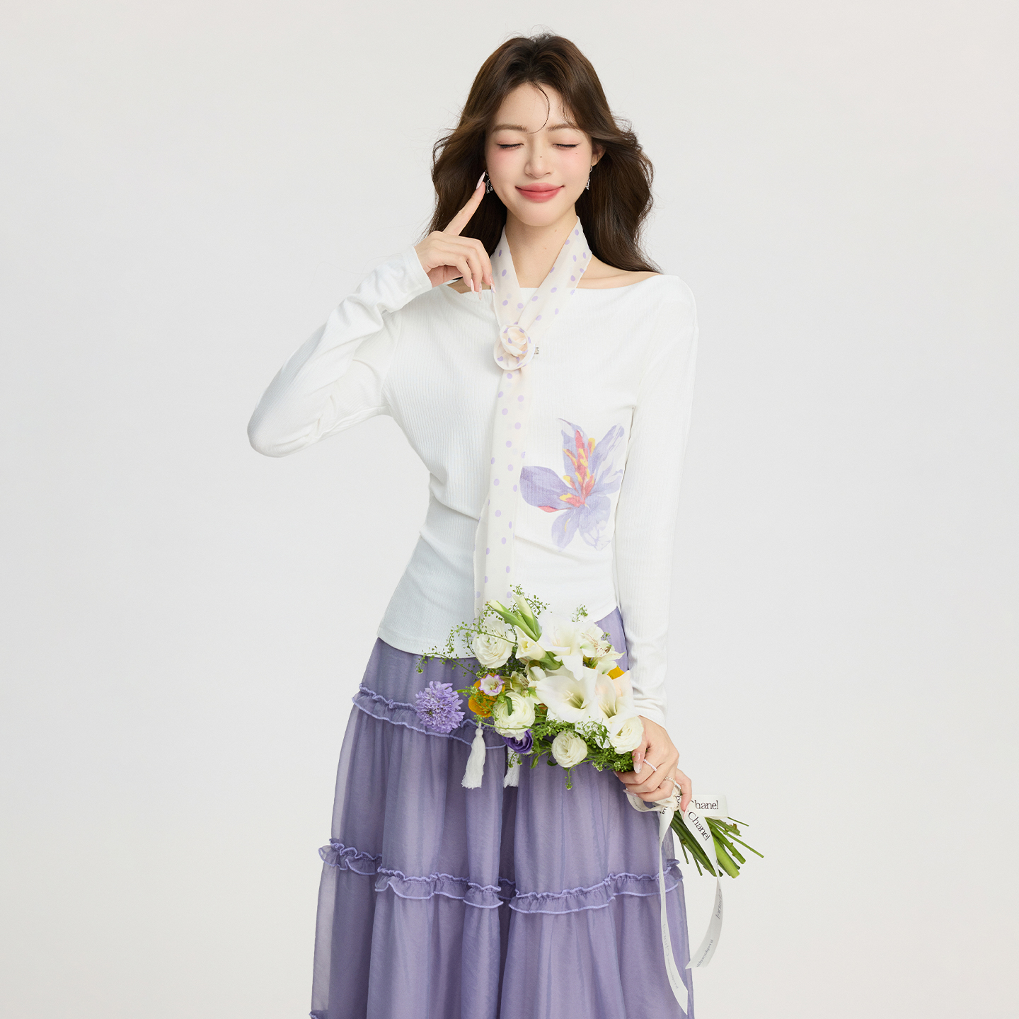 FA55749# 韩系一字肩印花长袖女春季设计感不规则下摆露肩T恤上衣 服裝批發女裝批發服飾貨源