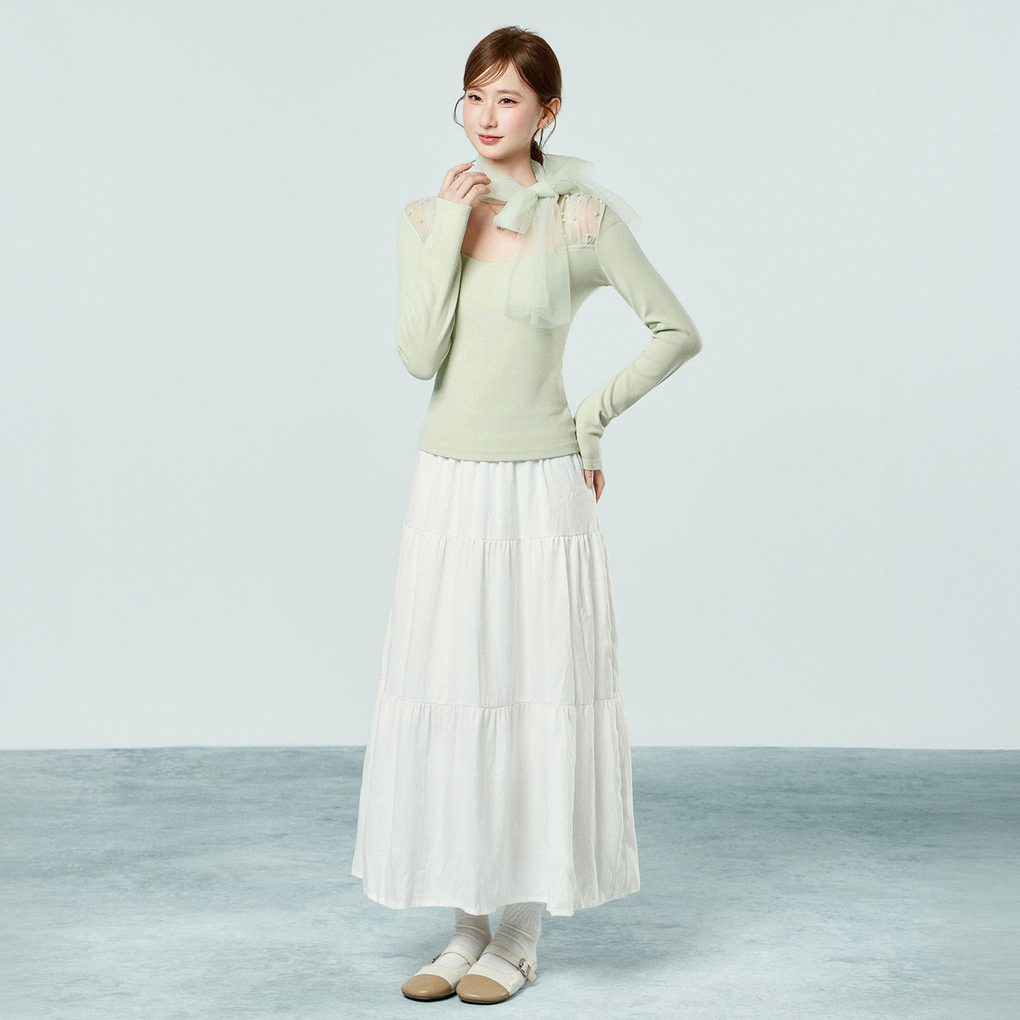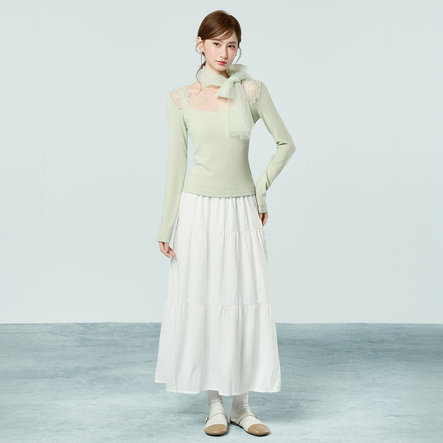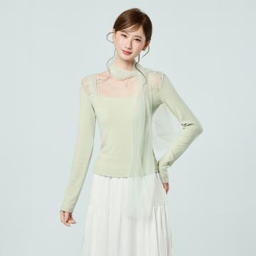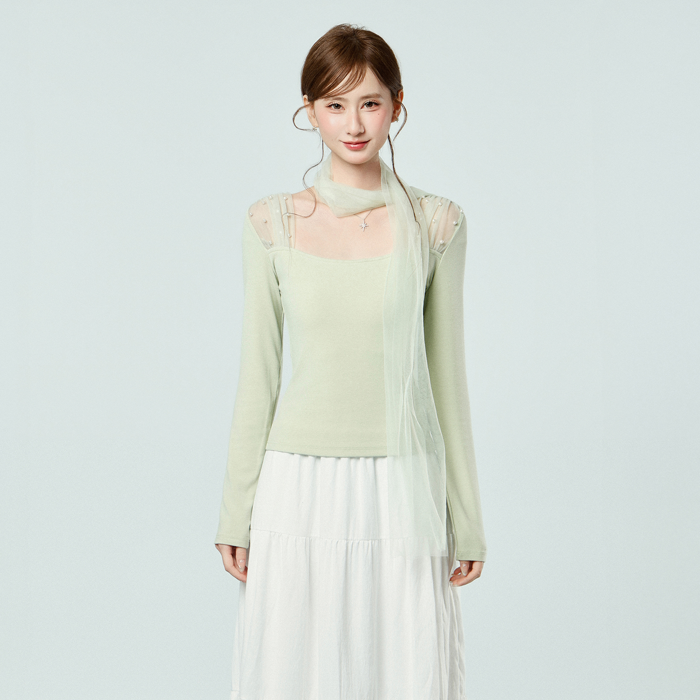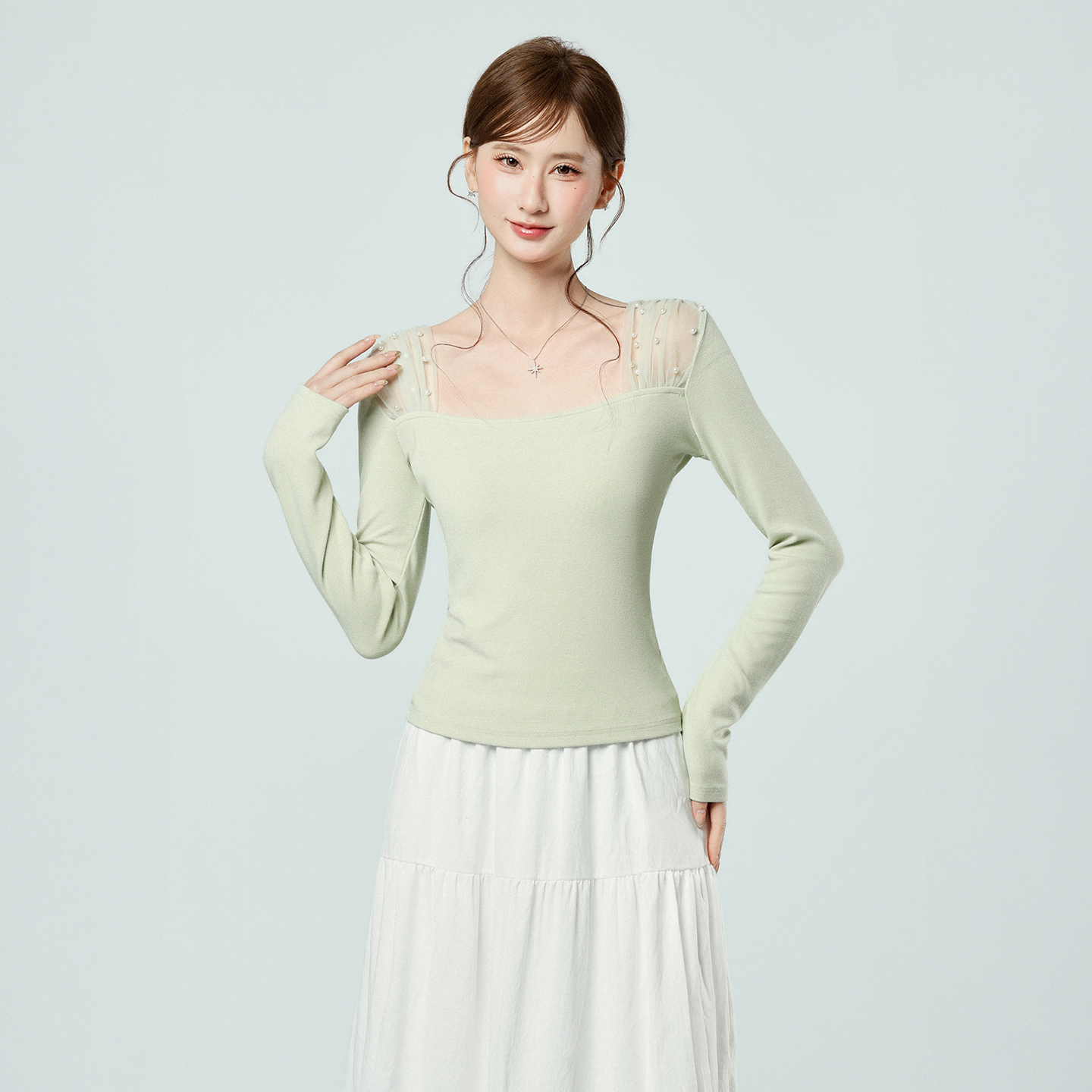 FA55760# 韩式网纱珍珠方领长袖T恤春季显瘦气质内搭打底衫上衣女 服裝批發女裝批發服飾貨源