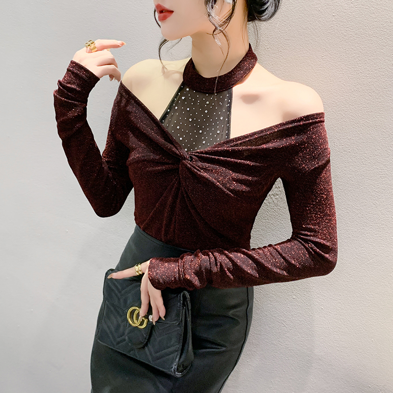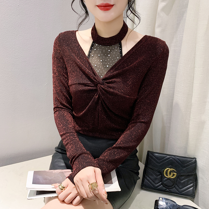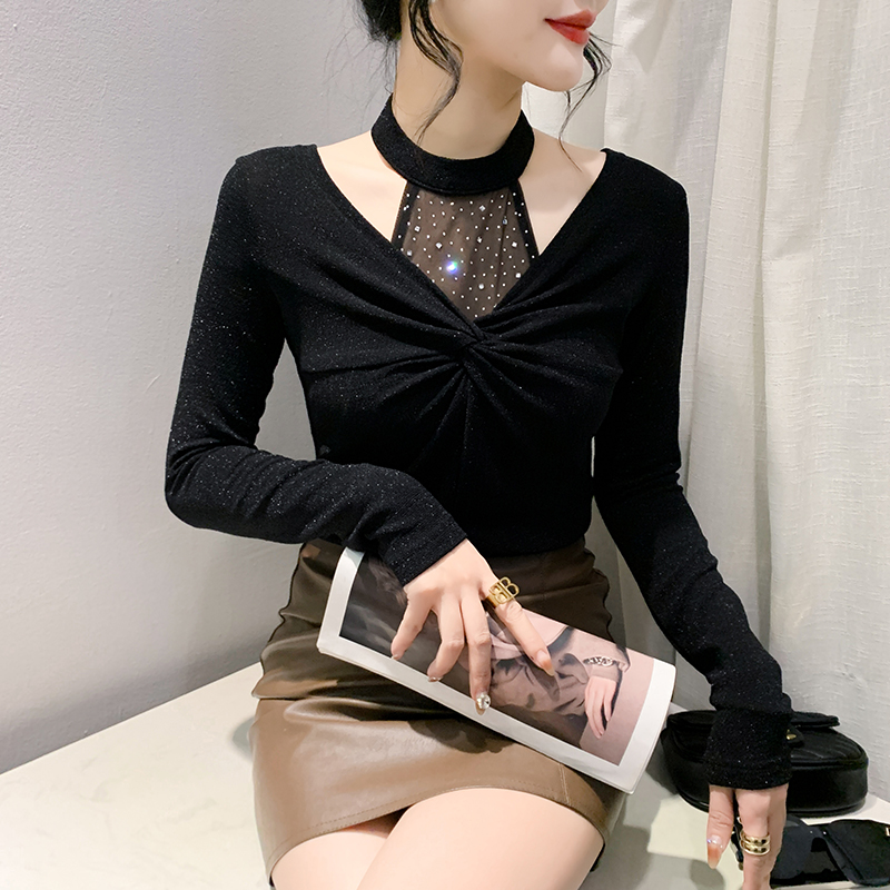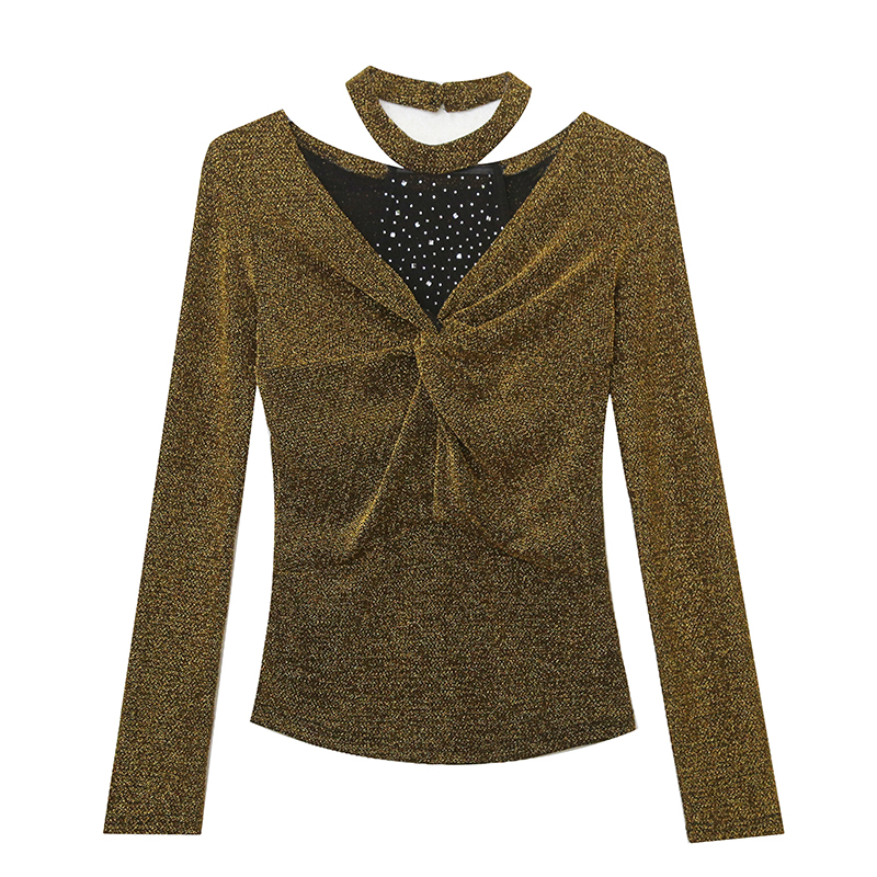 FA55780# 春季新款设计感时尚挂脖百搭气质烫钻扭结长袖显瘦小衫女 服裝批發女裝批發服飾貨源