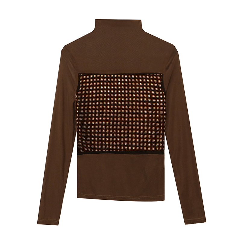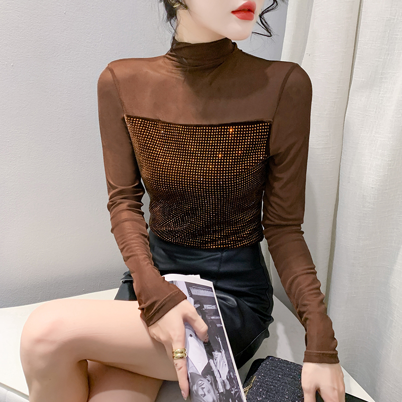 FA55784# 实秋新款高领修身显瘦丝绒亮钻拼接弹力网纱气质百搭长袖小衫 服裝批發女裝批發服飾貨源