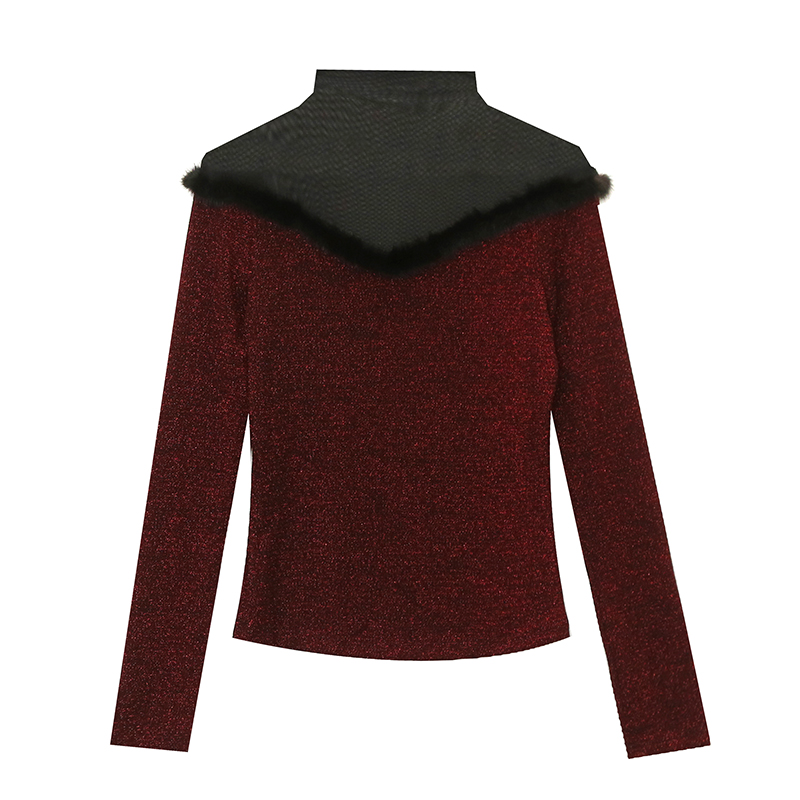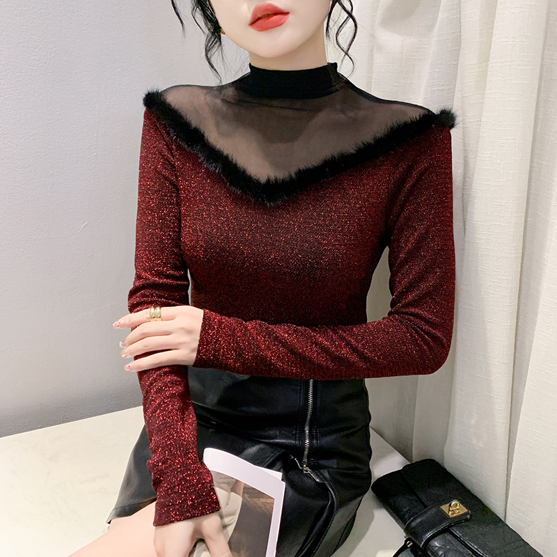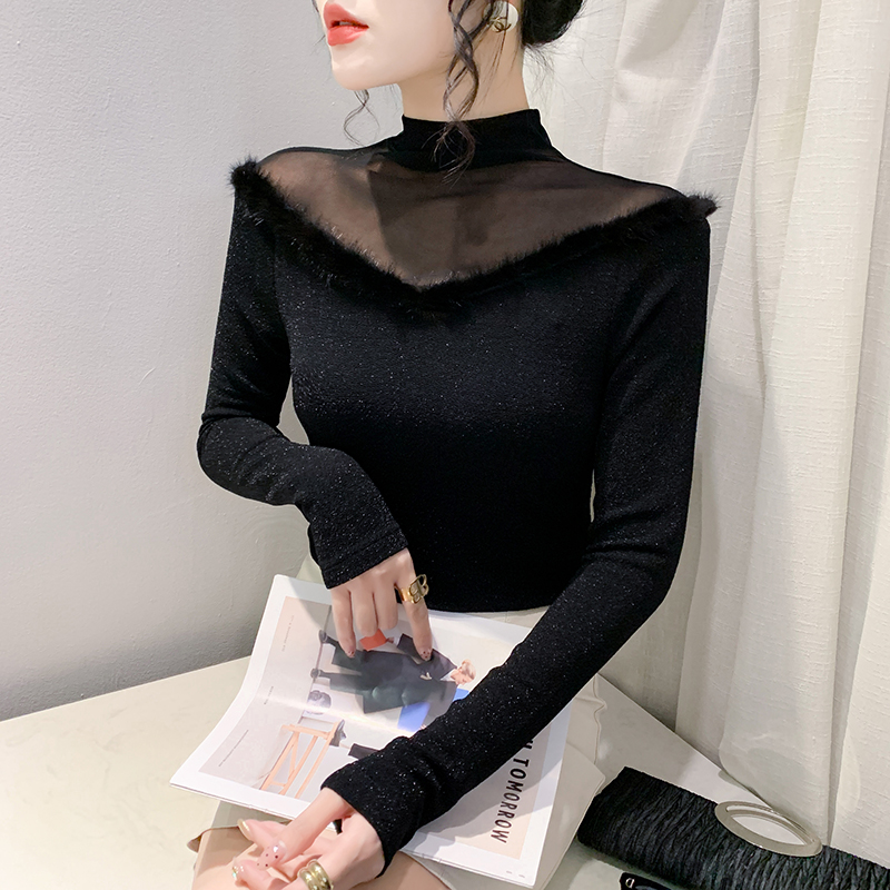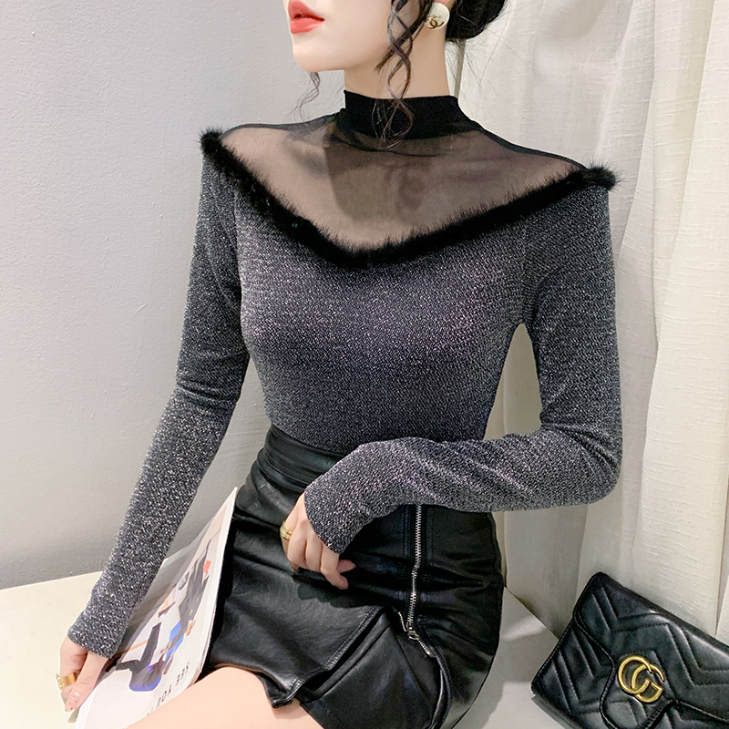 FA55786# 秋季新款时尚透视沙拼接亮丝网修身长袖气质百搭打底衫女 服裝批發女裝批發服飾貨源