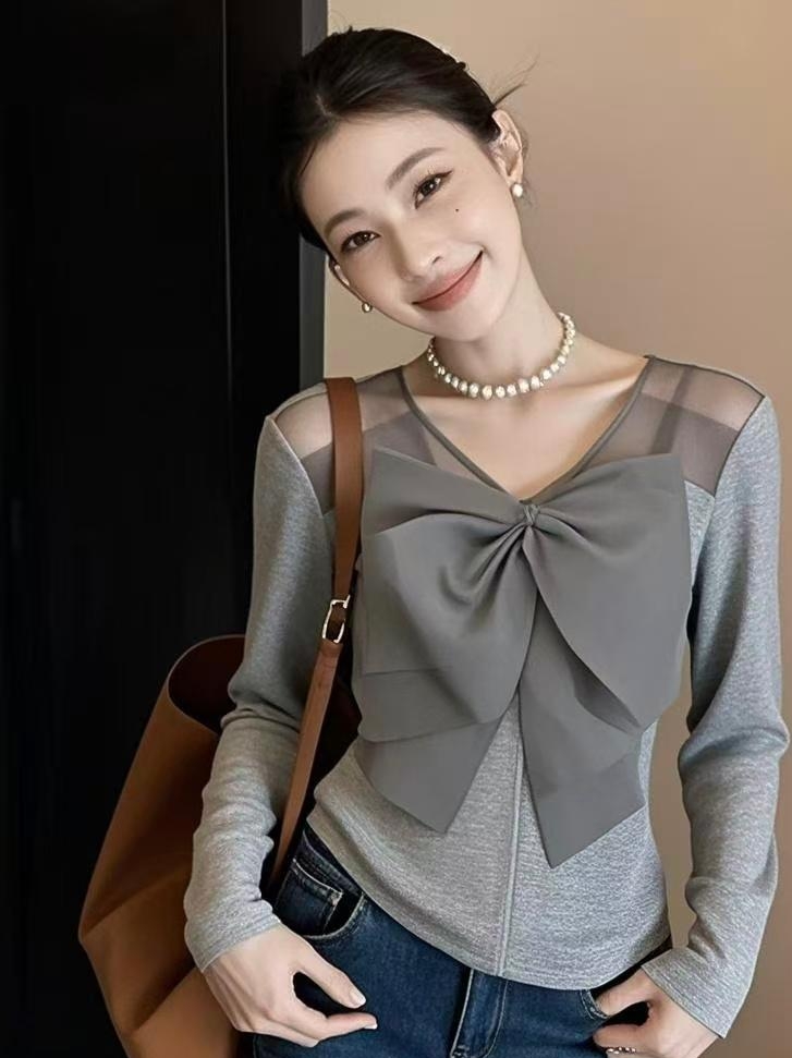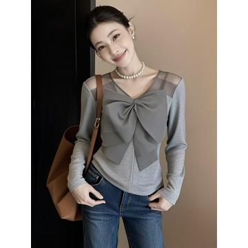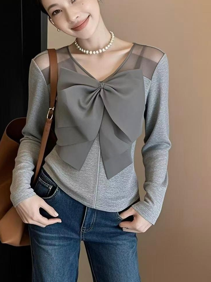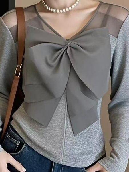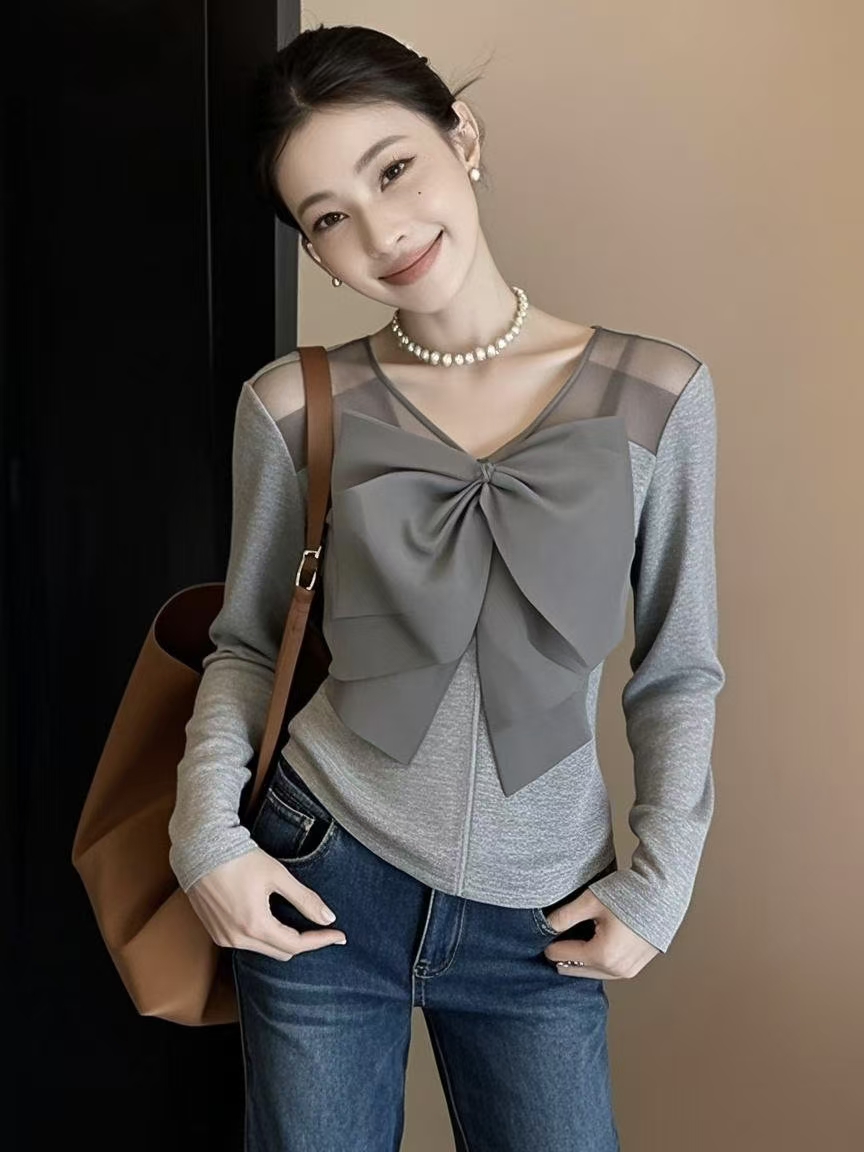 FA55792# 设计感大蝴蝶结设计韩系高级感灰色上衣女款春季时尚优雅上衣 服裝批發女裝批發服飾貨源