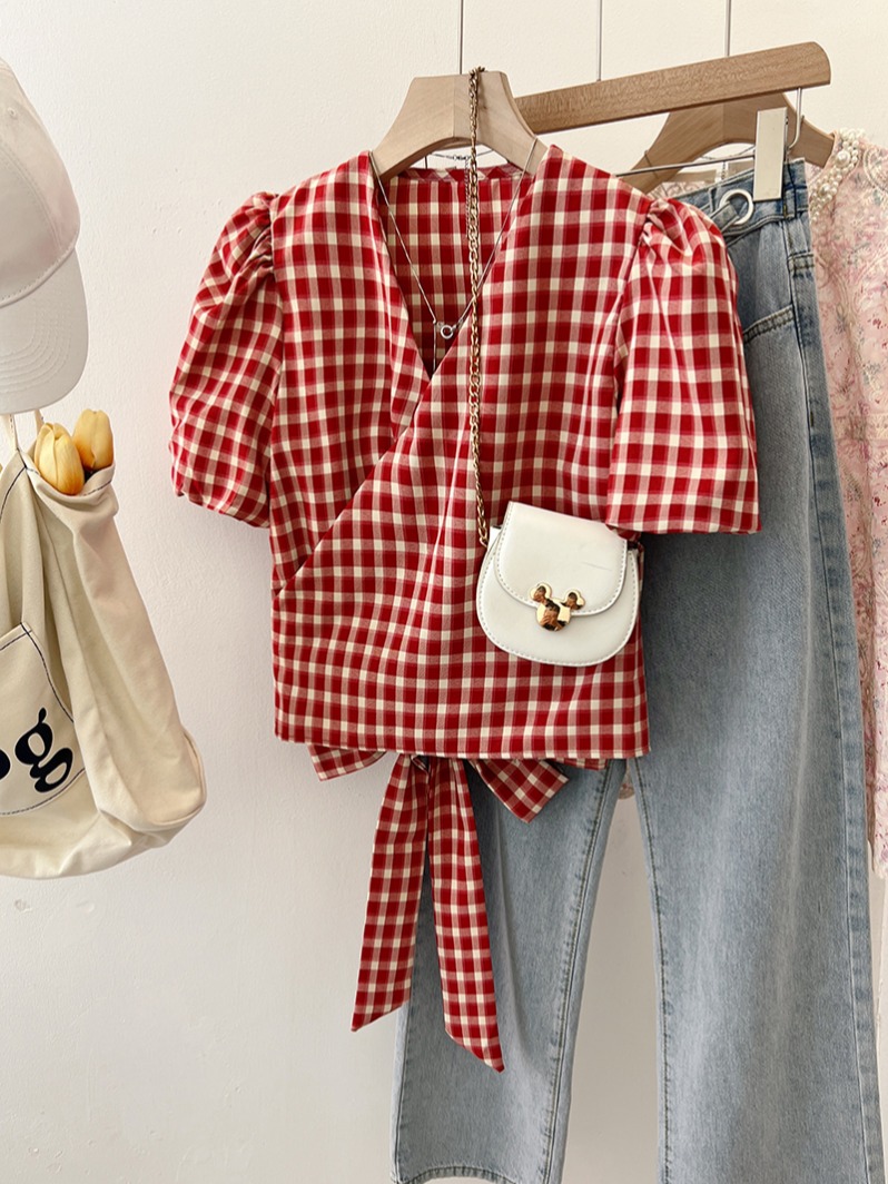 FA37153# 大码夏新款法式复古时髦格纹收腰绑带侧排扣方领泡泡袖衬衫女 服裝批發女裝批發服飾貨源