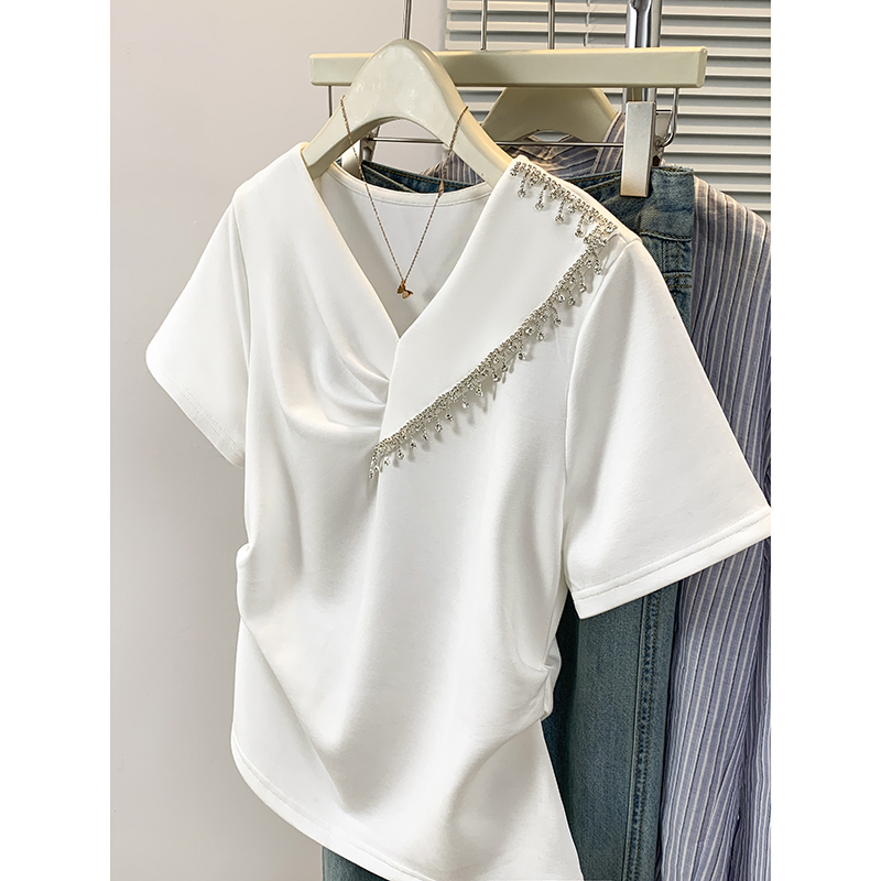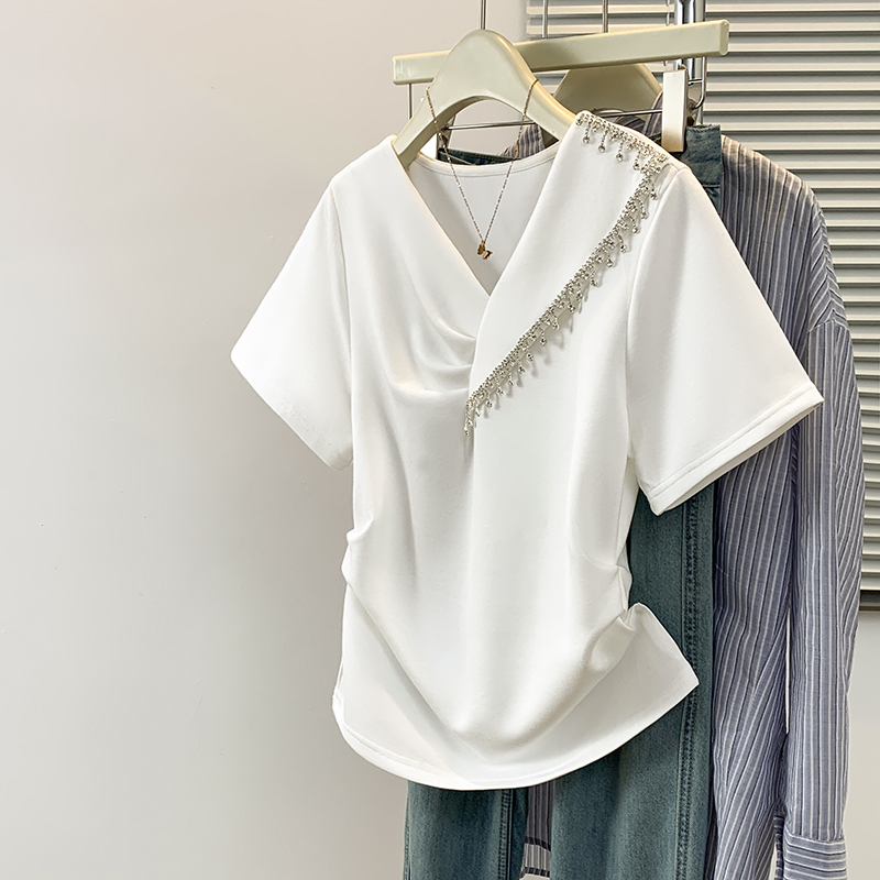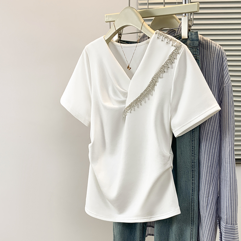 FA24919# 大码法式不规则设计白色V领短袖T恤气质时髦重工烫钻上衣 服裝批發女裝批發服飾貨源
