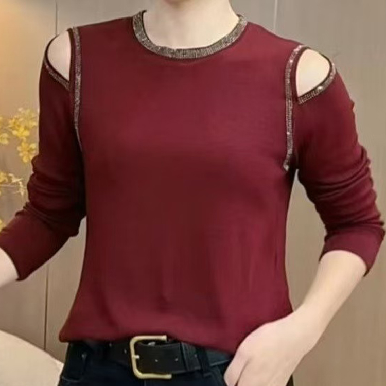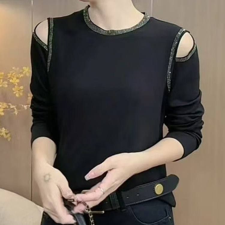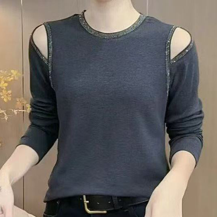 FA40005# 秋季新款时尚露肩设计感烫钻长袖上衣气质显瘦百搭小衫 服裝批發女裝批發服飾貨源