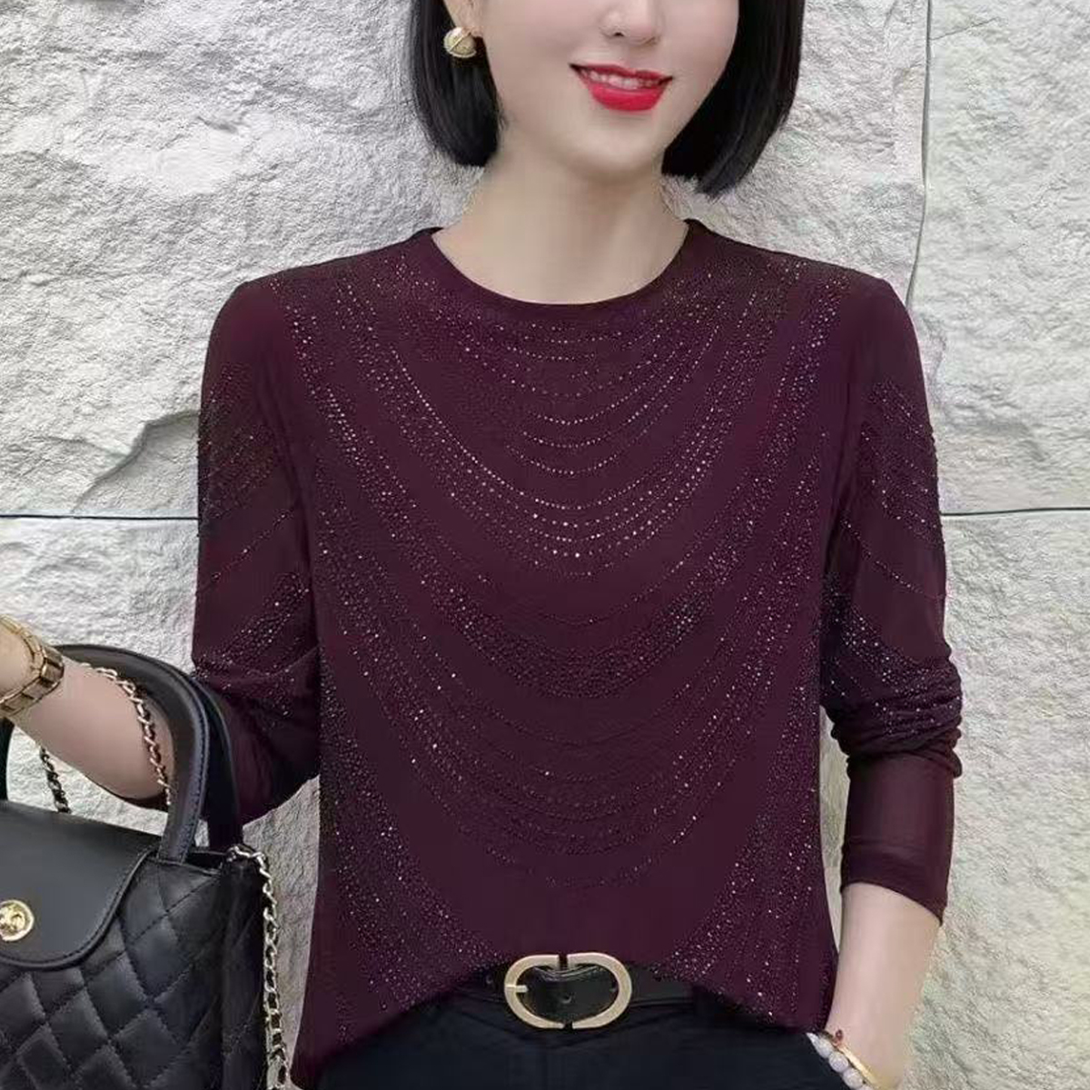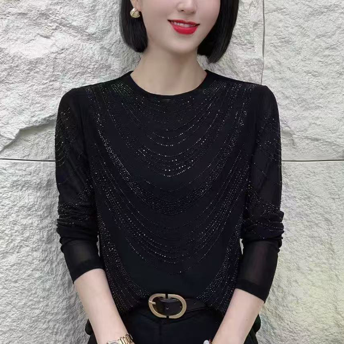 FA40008# 秋季新款烫钻显瘦洋气百搭长袖半高领打底衫修身小衫女 服裝批發女裝批發服飾貨源