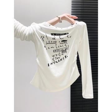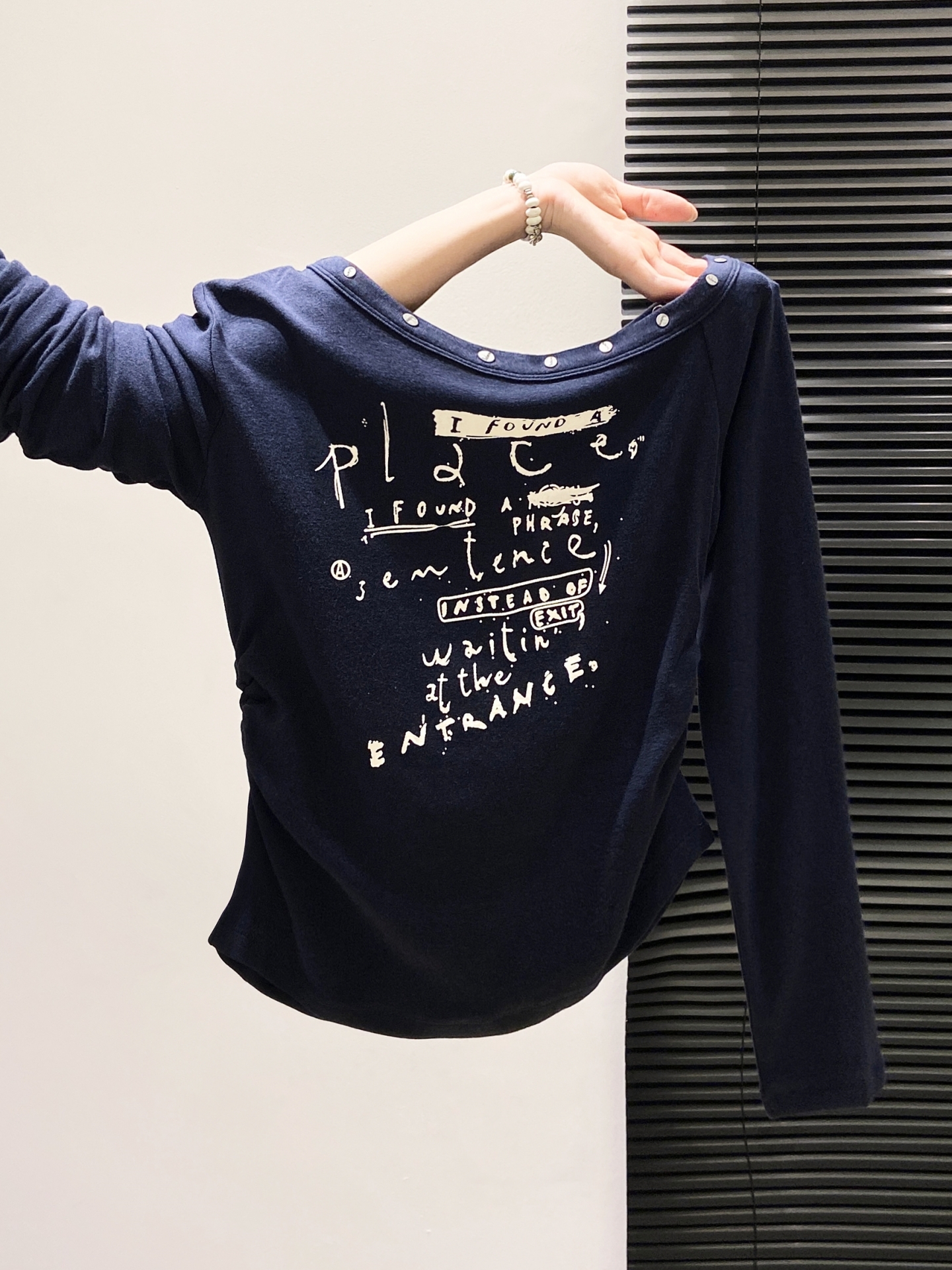 FA43639# 美式铆钉斜领长袖t恤女秋季新款褶皱收腰显瘦打底衫露肩上衣 服裝批發女裝批發服飾貨源
