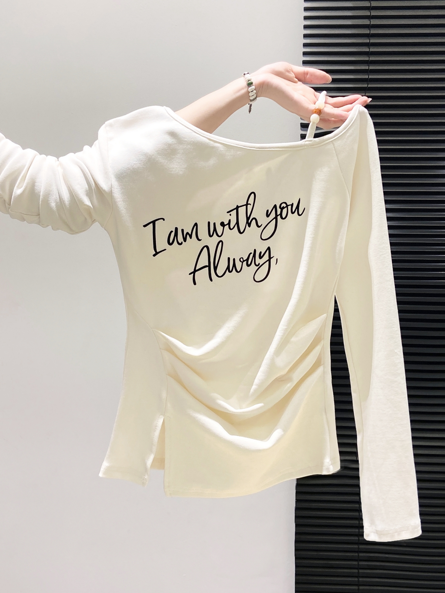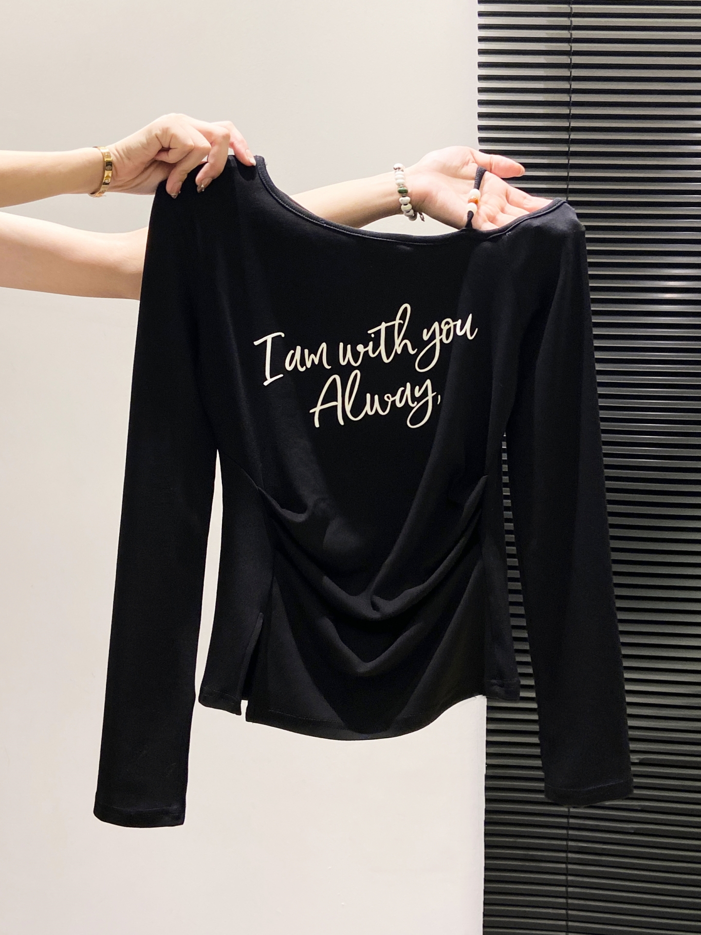 FA43642# 美式字母印花斜领露肩长袖T恤女秋季季新款褶皱修身显瘦上衣 服裝批發女裝批發服飾貨源