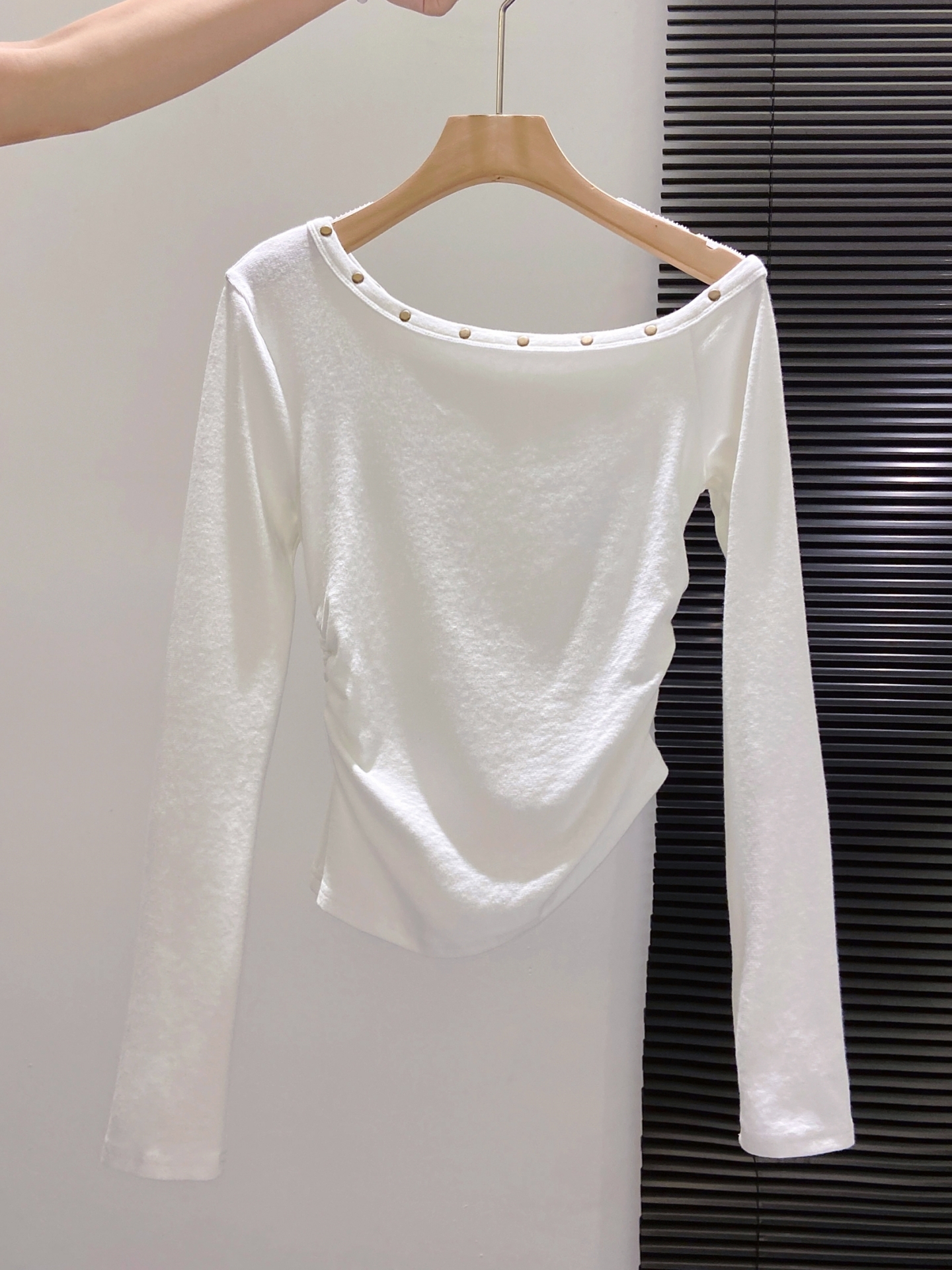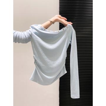 FA43645# 蓝色铆钉斜肩长袖t恤女早秋新款辣妹收腰显瘦性感露肩小上衣 服裝批發女裝批發服飾貨源