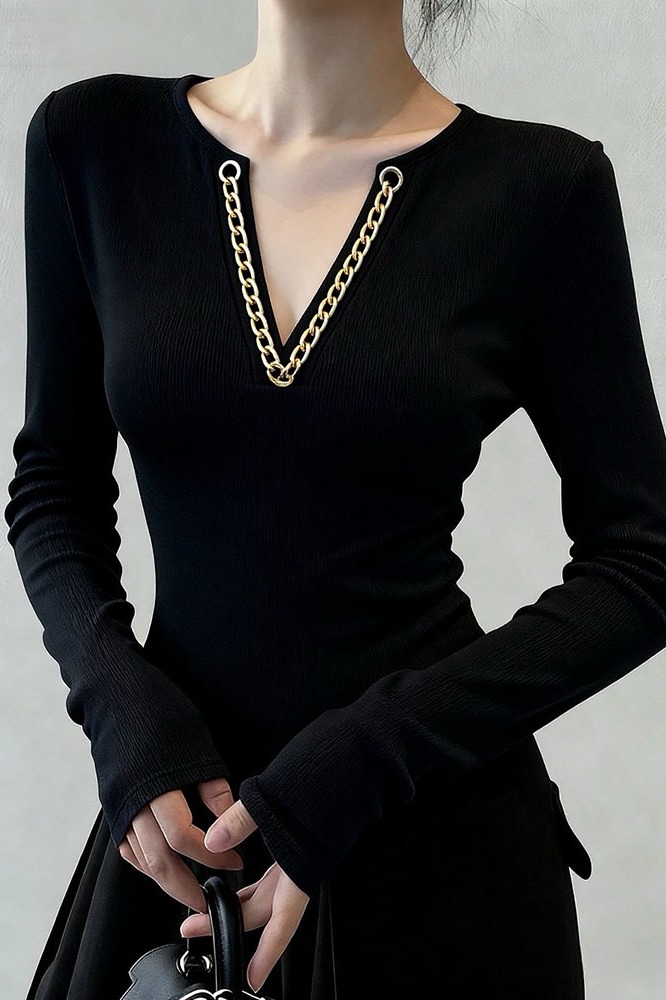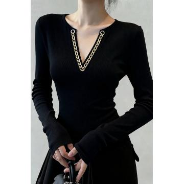 FA45091# 小众设计感掐腰黑色链条针织上衣女秋内搭高端时髦洋气超好看毛衣 服裝批發女裝批發服飾貨源