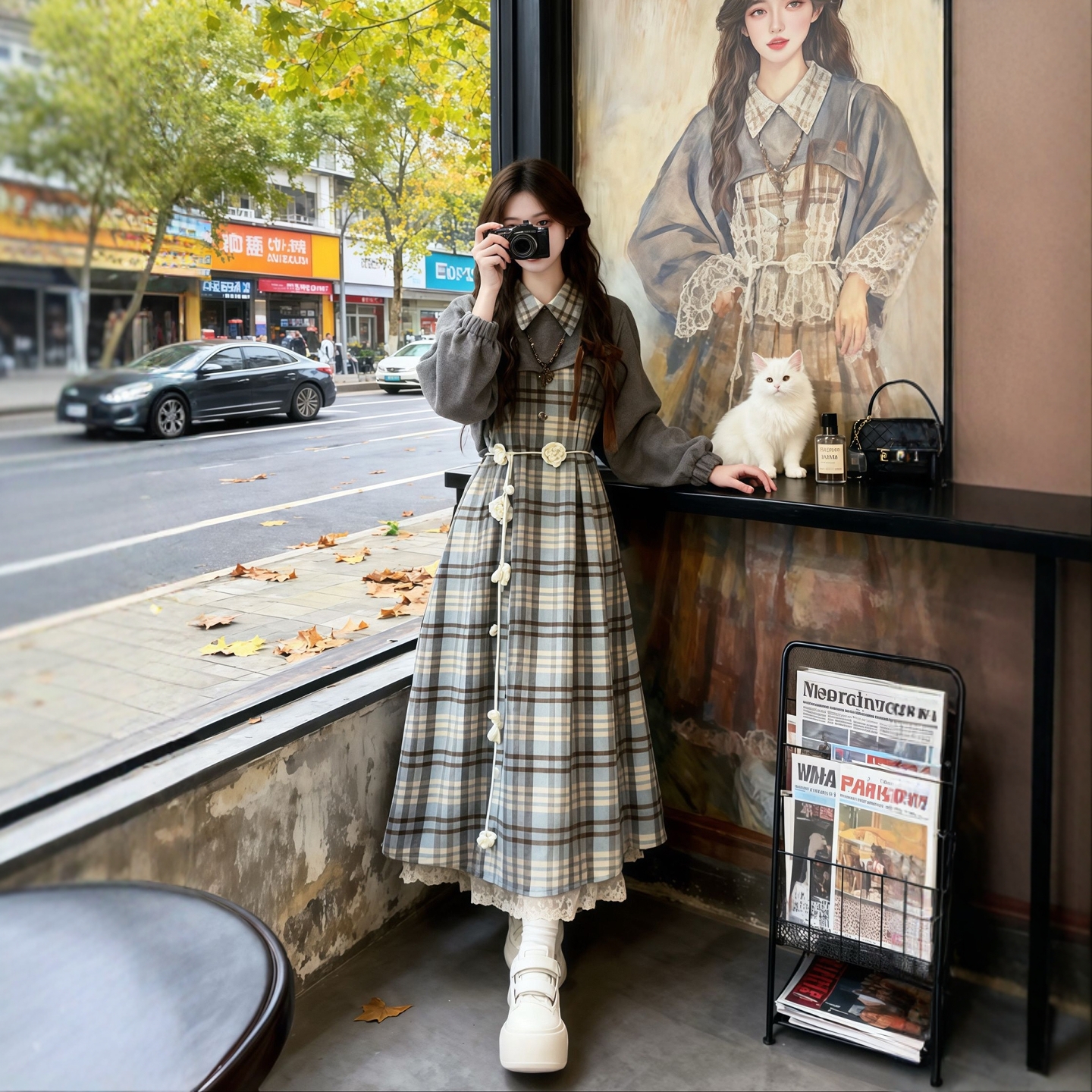 FA47567# 秋季穿搭一整套大码胖mm叠穿罩衫格纹连衣裙韩系高级感休闲套装女 服裝批發女裝批發服飾貨源